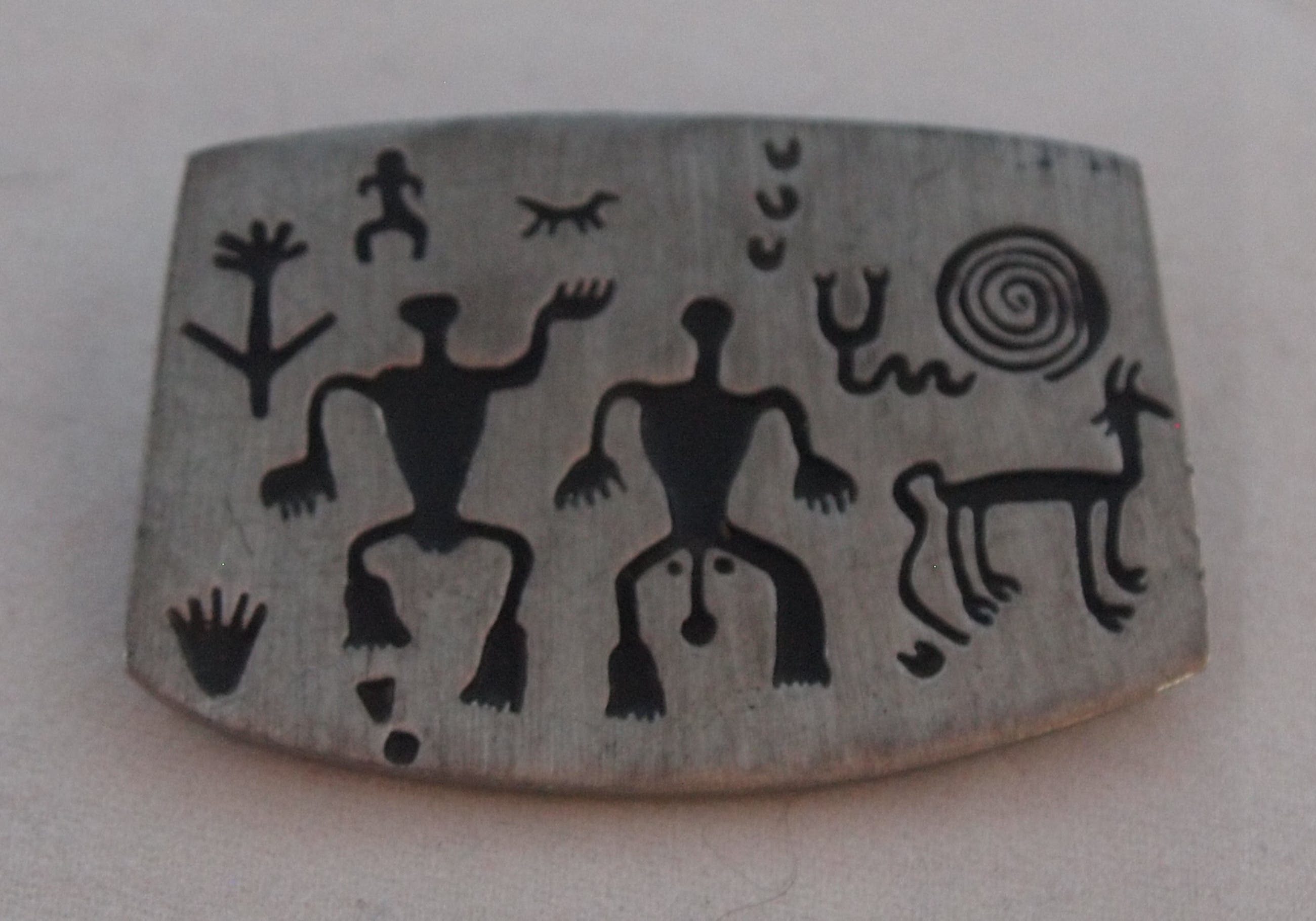 Urban Fetishes metalen Broche met een dansend paar en een hond?? Ontwerp waaschijnlijk van Alice Seely. Gemerkt aan de achterzijde en gedateerd 1998. Gemaakt in New Mexico, USA.
