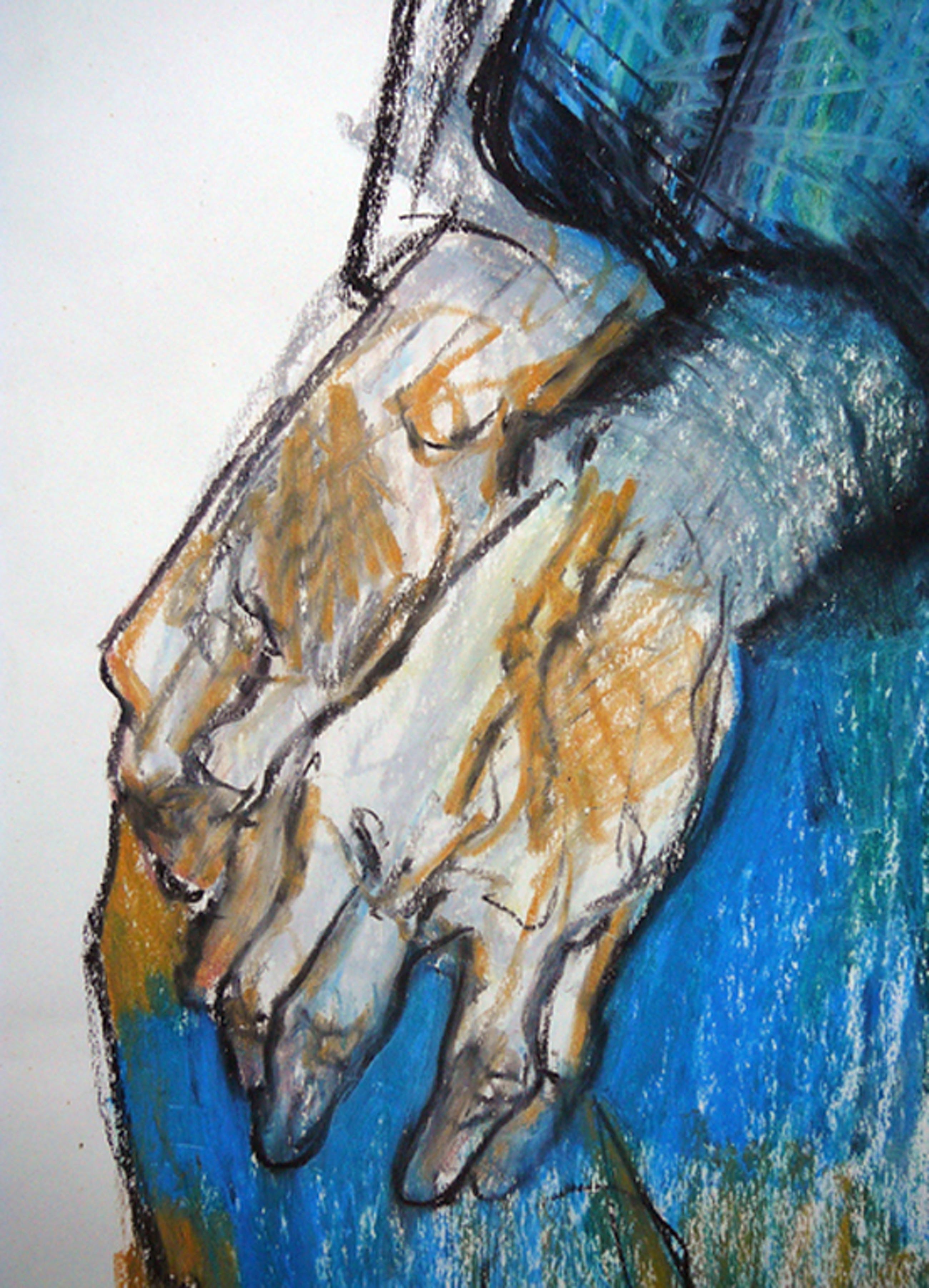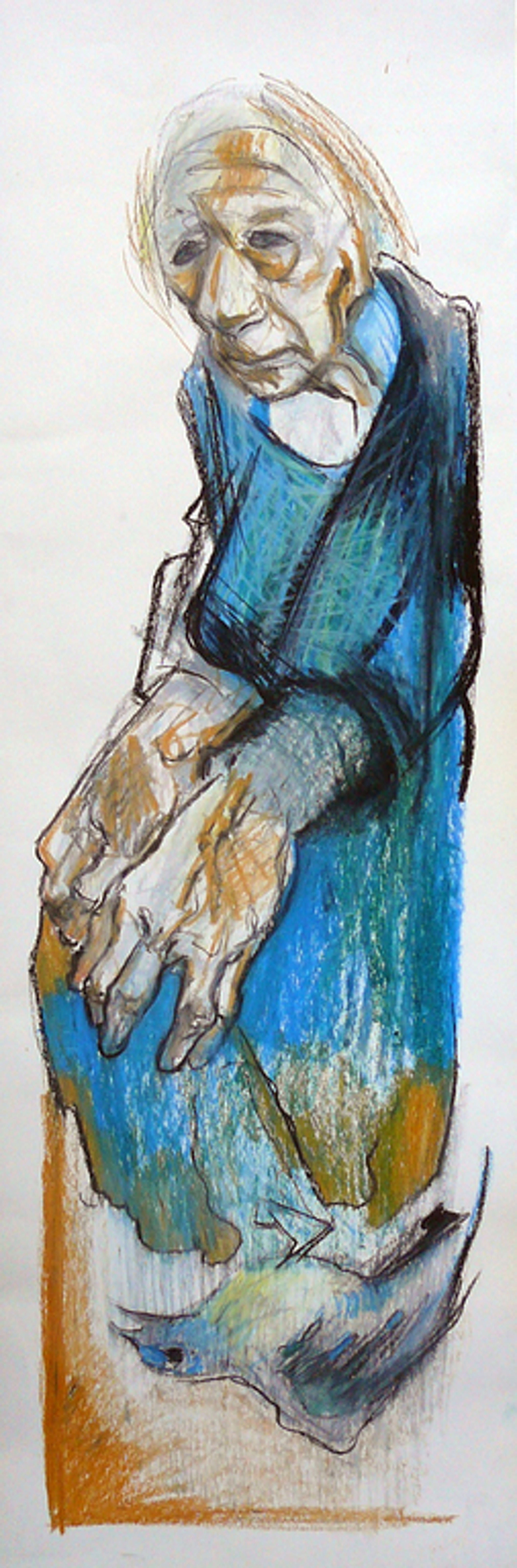 Bijzondere vetkrijttekening met een voorstelling van een oude doorleefde dame met een dode vogel aan haar voeten. Helaas hebben wij de kunstenaar niet kunnen traceren. Nagenoeg onleesbaar gesigneerd met TF, FF (?) 1982.