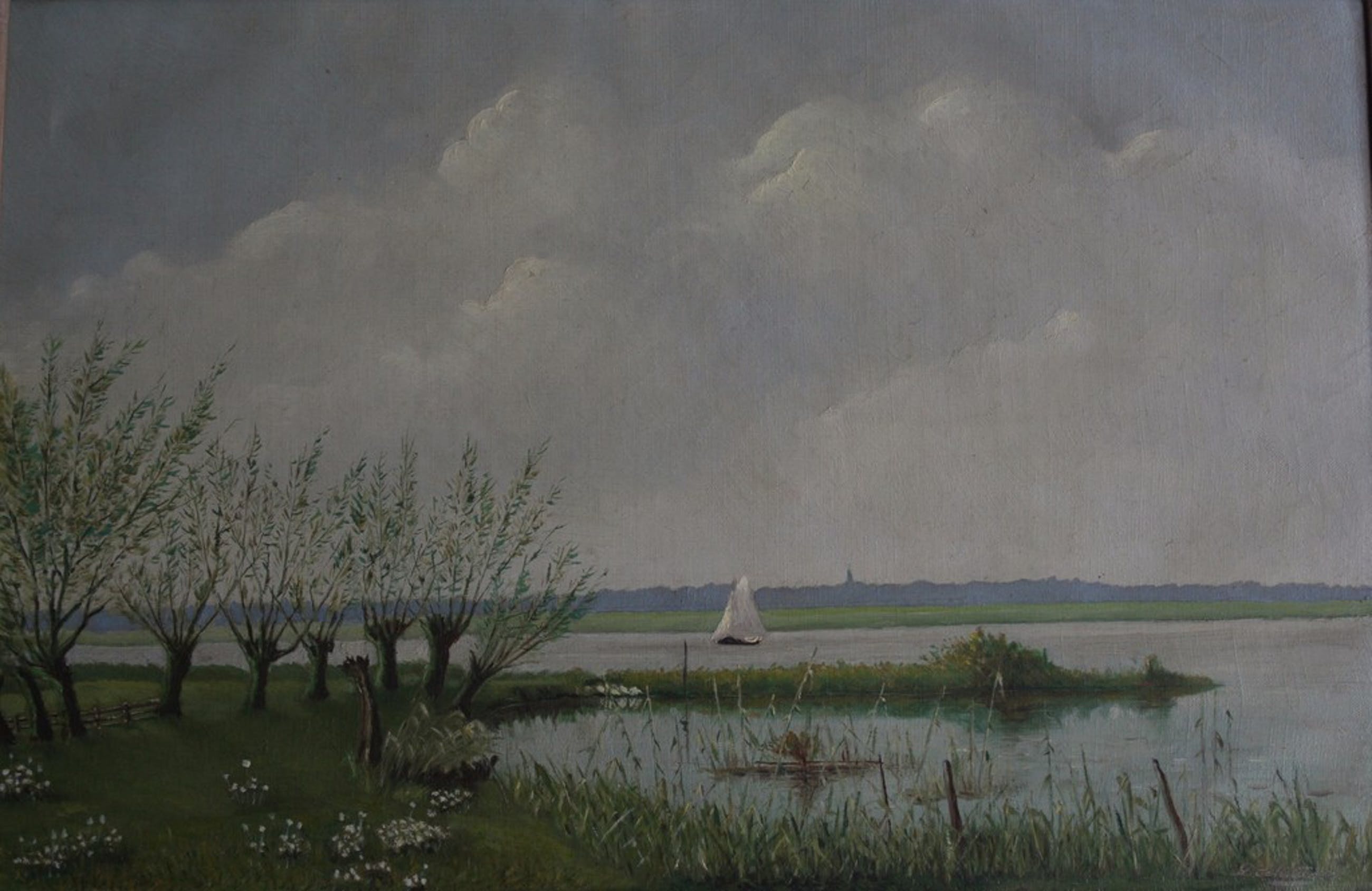 Olieverfschilderij op doek, in een houten lijst met gebruikssporen. Gesigneerd, zie foto, onduidelijk wat er precies staat. Voorstelling van een zeilbootje op een meer, met op de achtergrond een dorpje.