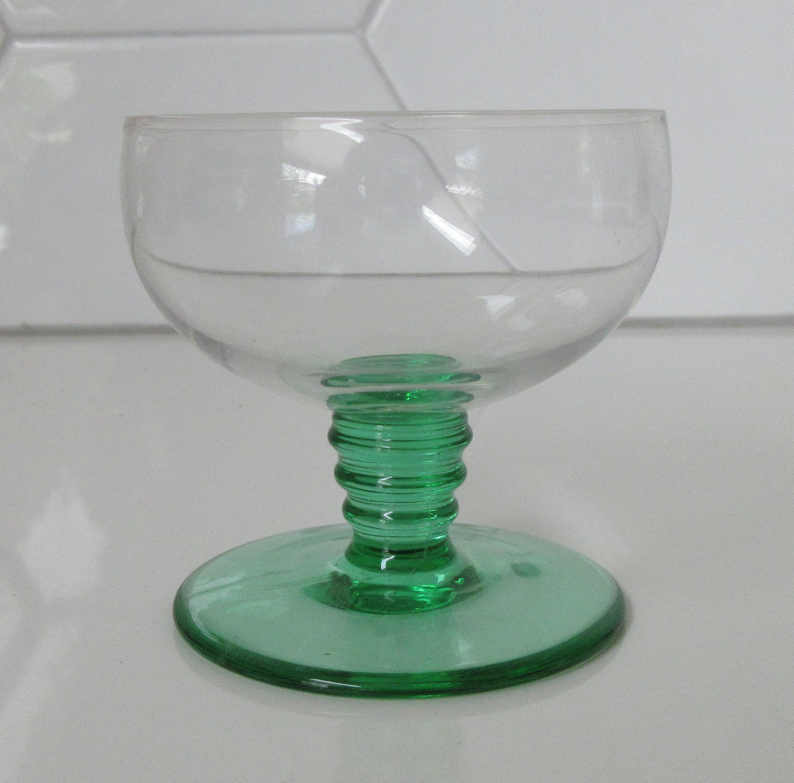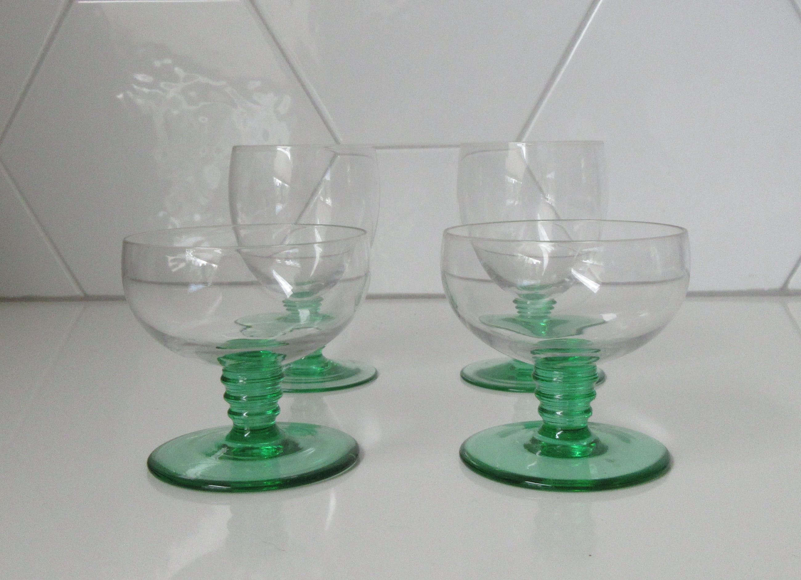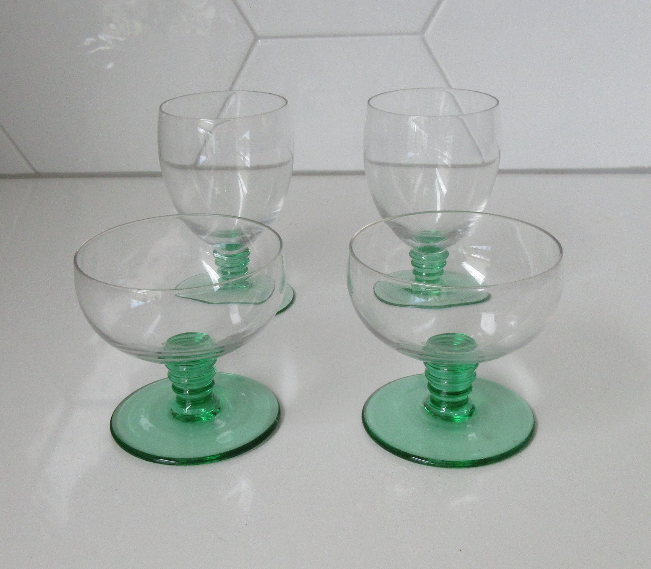 Vier Belgische art deco glaasjes met Anna groene stok en voet. Het betreft twee likeur en twee bitterglaasjes. In prima onbeschadigde conditie, niet gemerkt. Zeer waarschijnlijk bij een van de Belgische glasfabrieken zoals; Doyen, Booms of Val St. Lambert geproduceerd. De afmetingen zijn 9 cm hoog en 6 cm in diameter voor het bitterglaasje en 6,5 cm hoog en 7 cm in diameter voor het likeurglaasje.