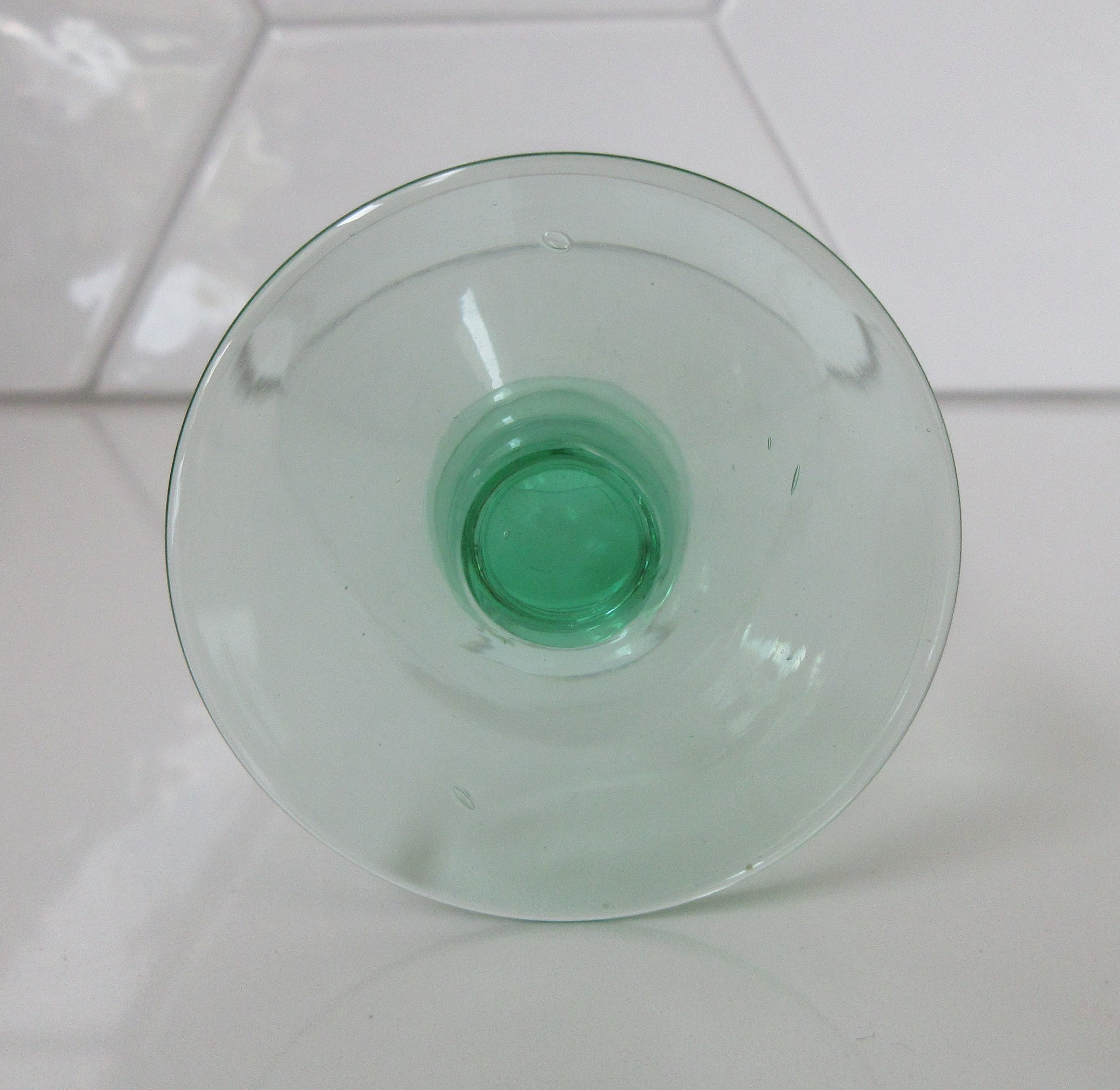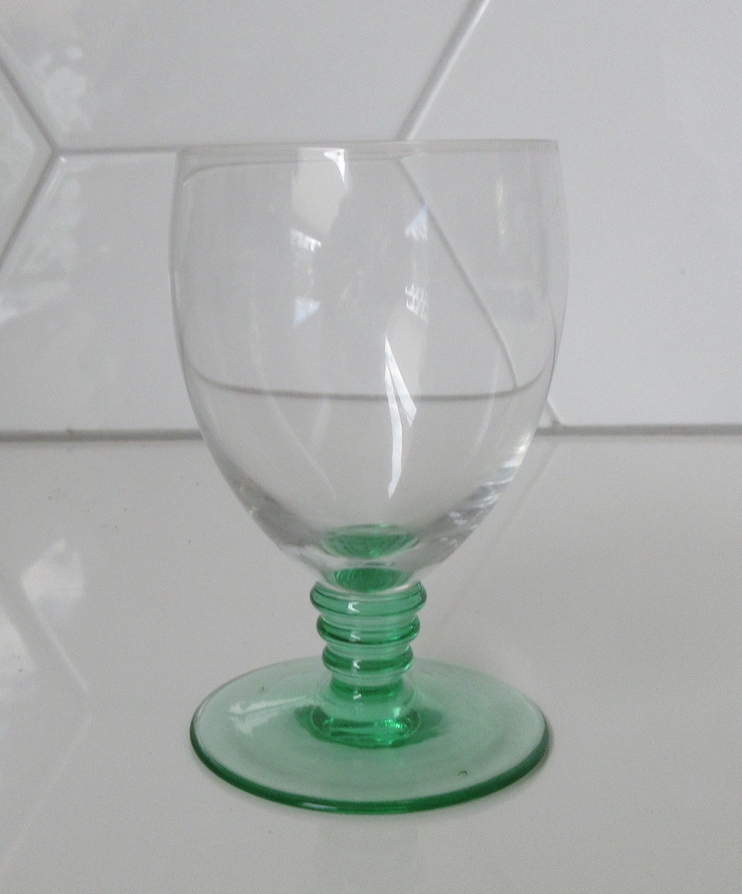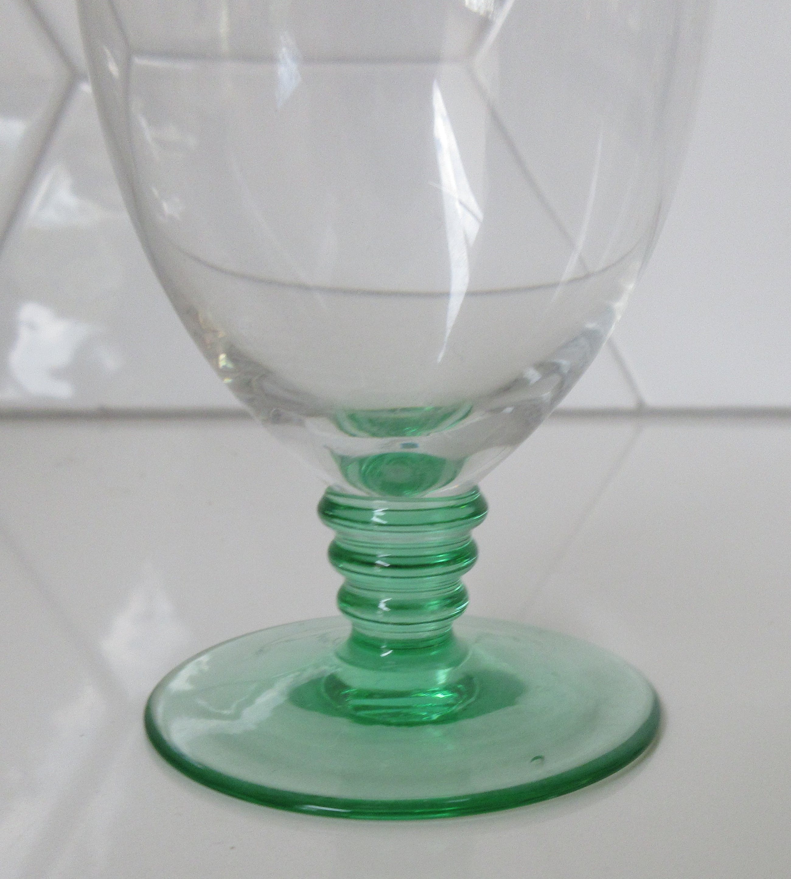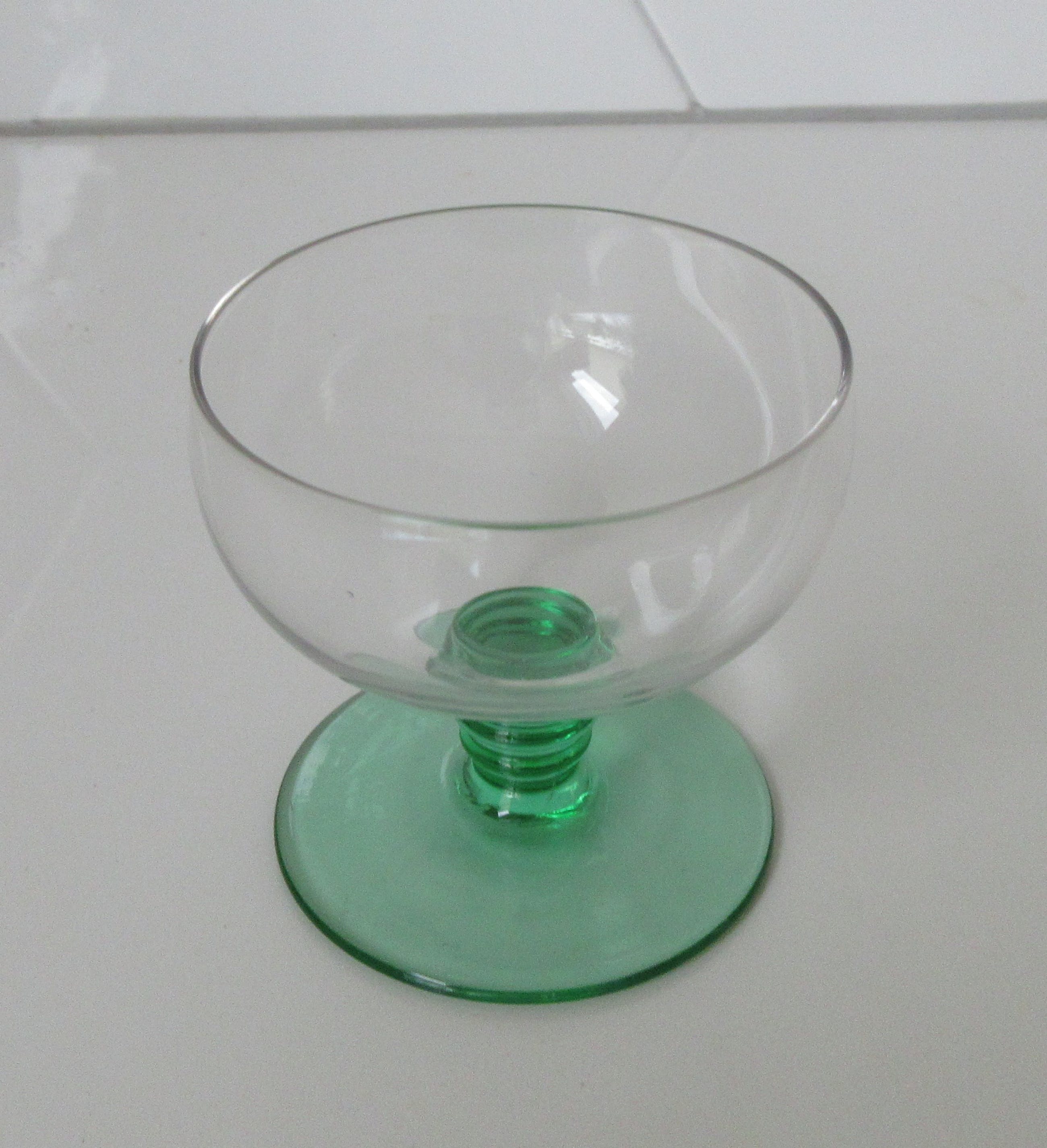 Vier Belgische art deco glaasjes met Anna groene stok en voet. Het betreft twee likeur en twee bitterglaasjes. In prima onbeschadigde conditie, niet gemerkt. Zeer waarschijnlijk bij een van de Belgische glasfabrieken zoals; Doyen, Booms of Val St. Lambert geproduceerd. De afmetingen zijn 9 cm hoog en 6 cm in diameter voor het bitterglaasje en 6,5 cm hoog en 7 cm in diameter voor het likeurglaasje.