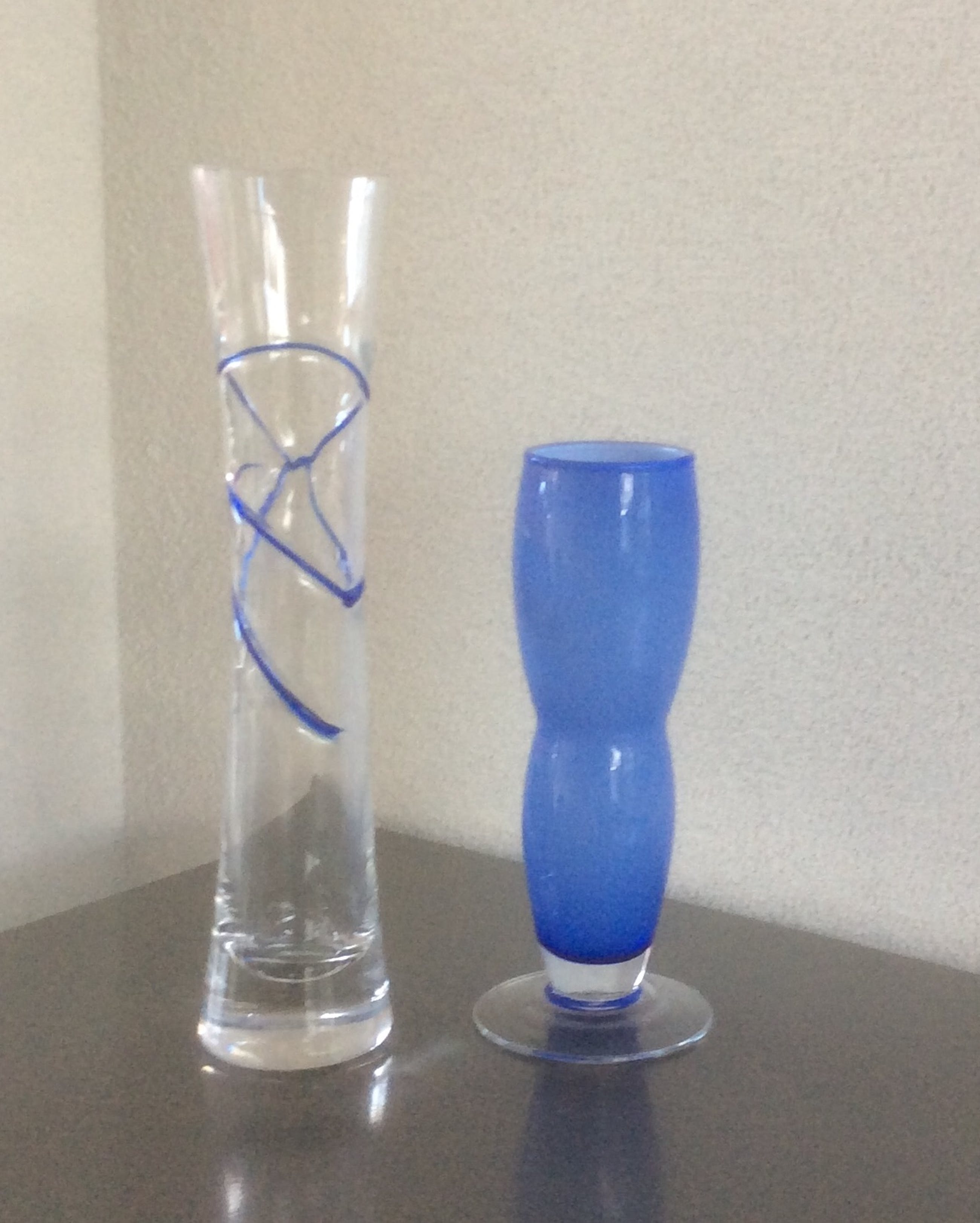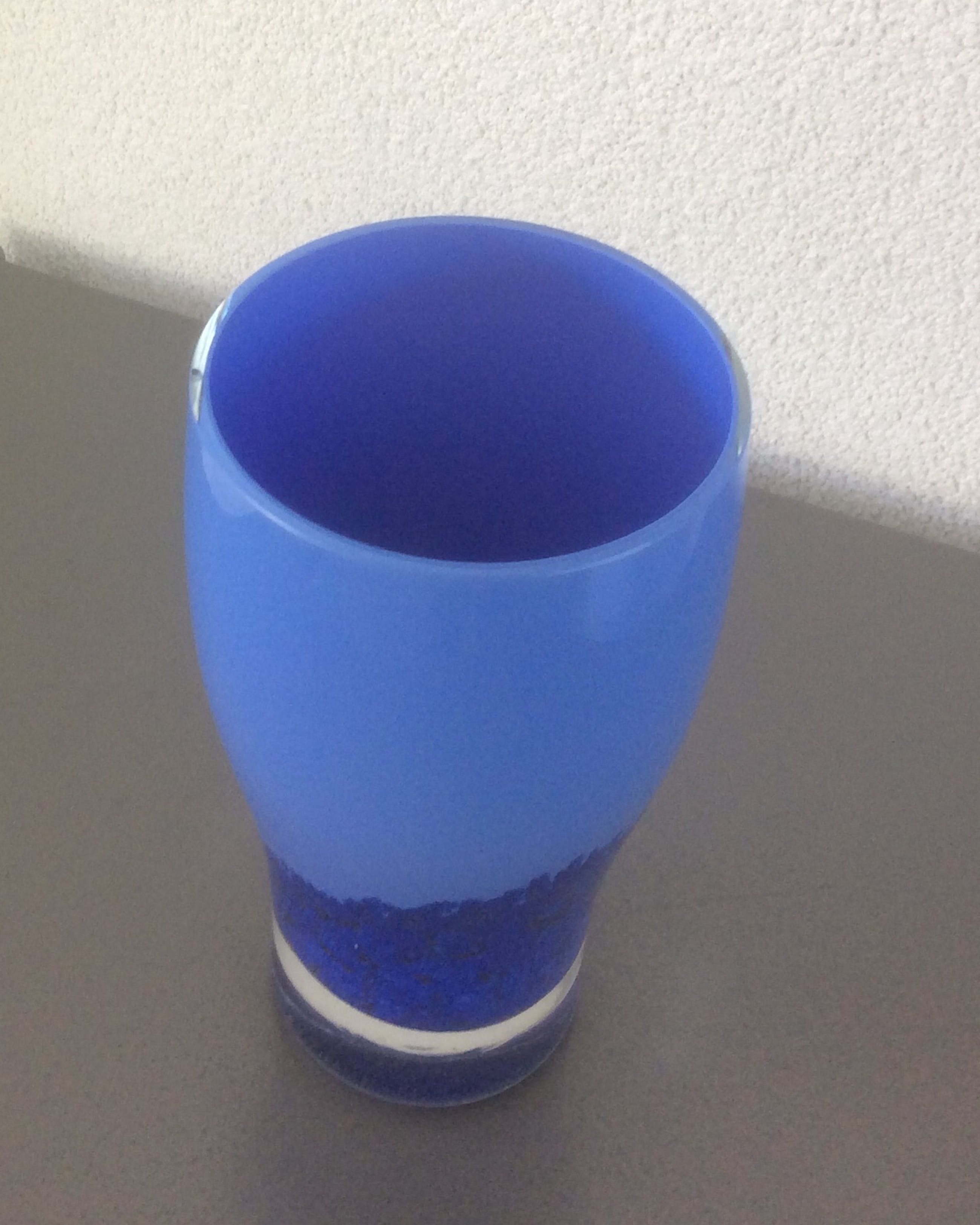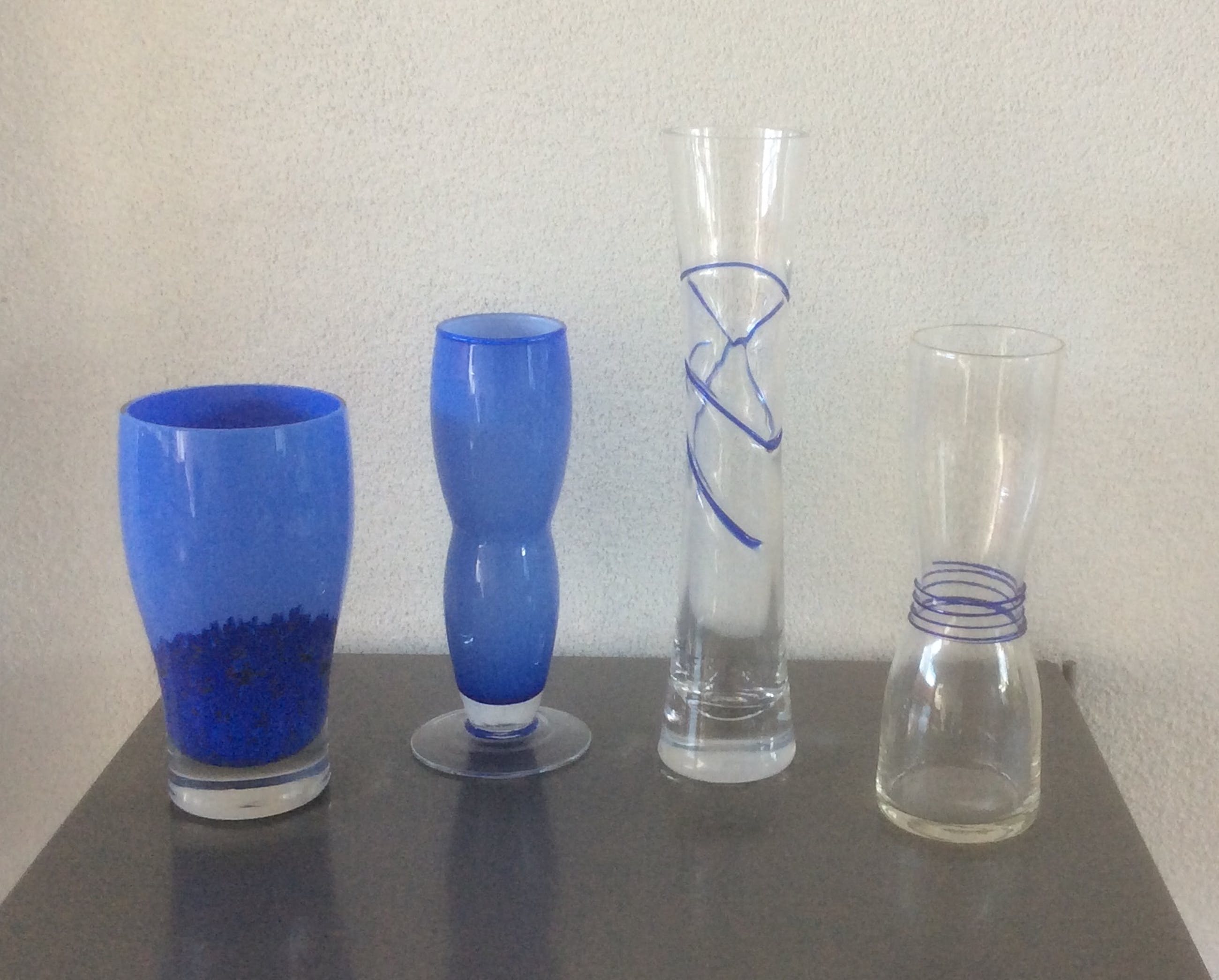 Verzameling van vier blauwe glazen vazen. De smalle dikwandige hoge vaas met blauwe slinger erin is 27 cm hoog en heeft een doorsnede van 6 cm. De vaas met blauwe glazen draad erop is 20 cm hoog en heeft een middellijn van 6 cm. De blauwe vaas op voet is 19 cm hoog en heeft een middellijn van 5 cm. De dikwandige blauwe vaas met de aparte versiering in het glas is 16,5 cm hoog en heeft een middellijn van 8,5 cm. Op de bovenkant zit een klein “speldenprikje”.