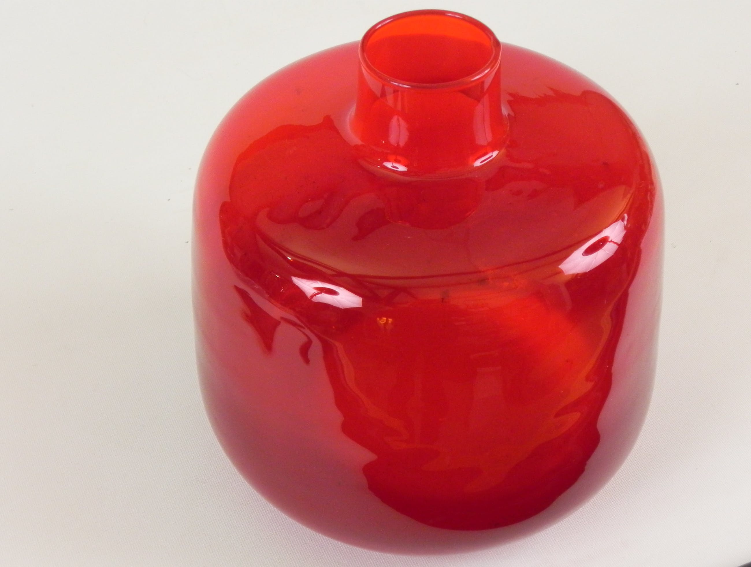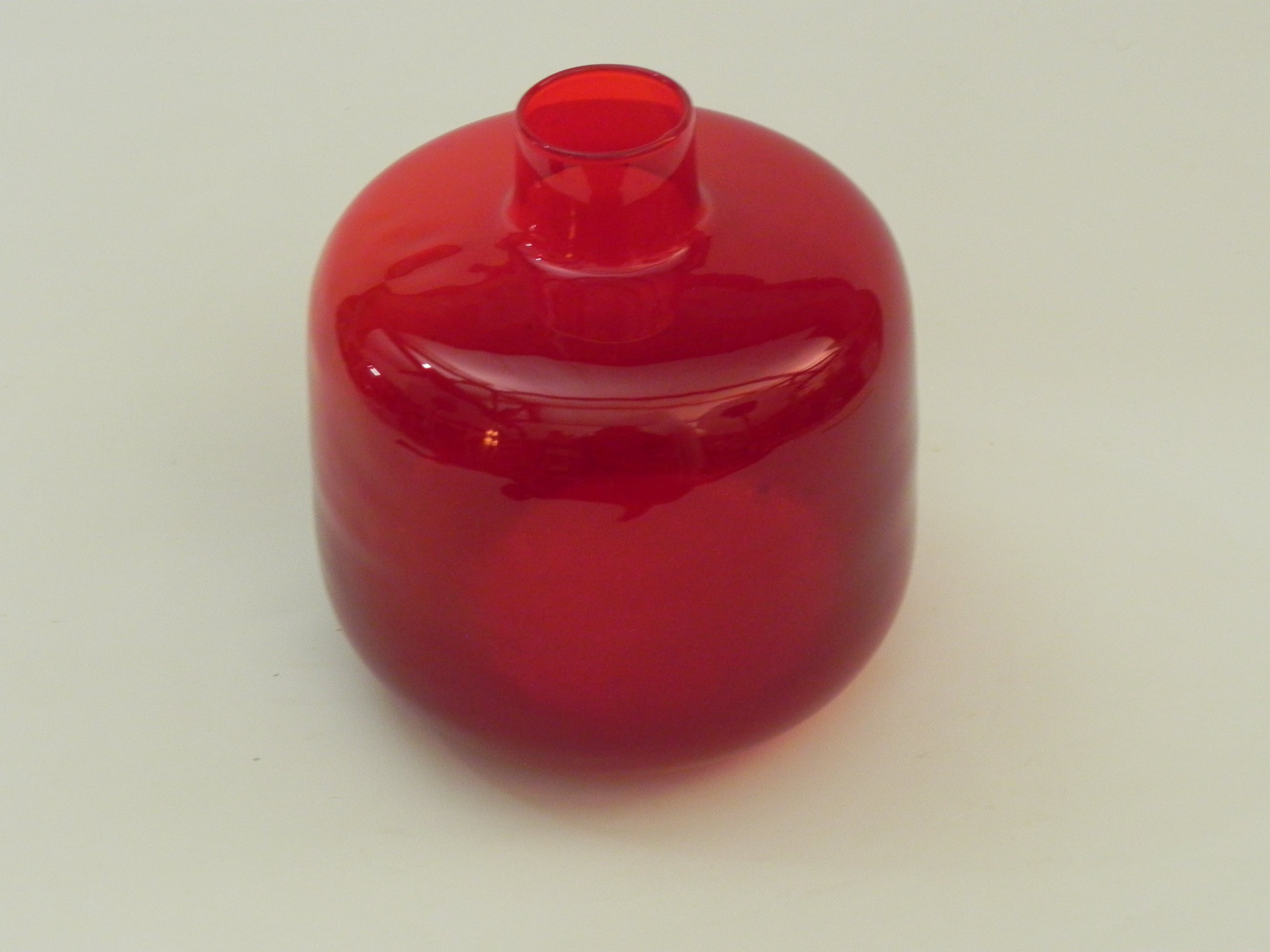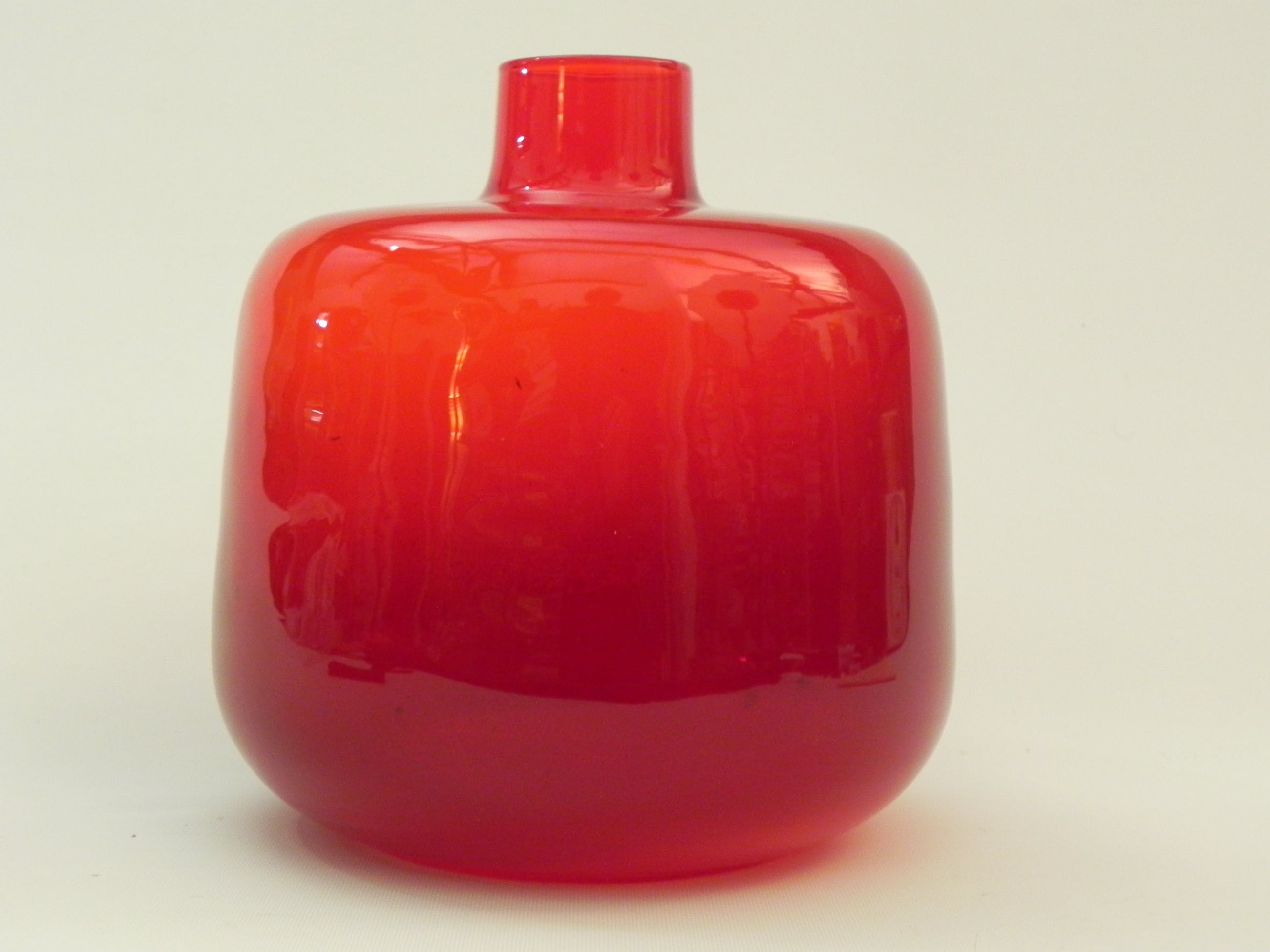 Rode glazen vaas met smalle opening. Vermoedelijk ontwerp van W.J.Rozendaal