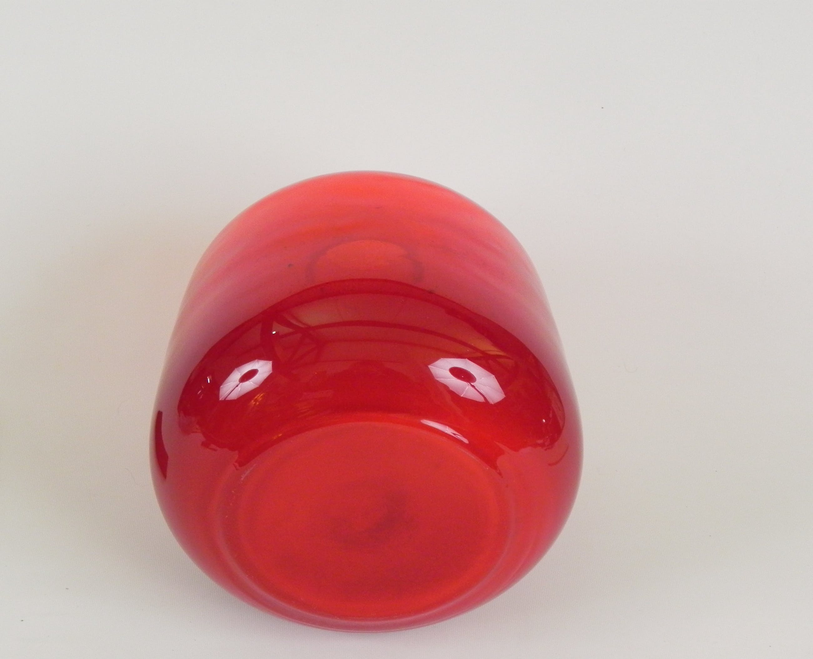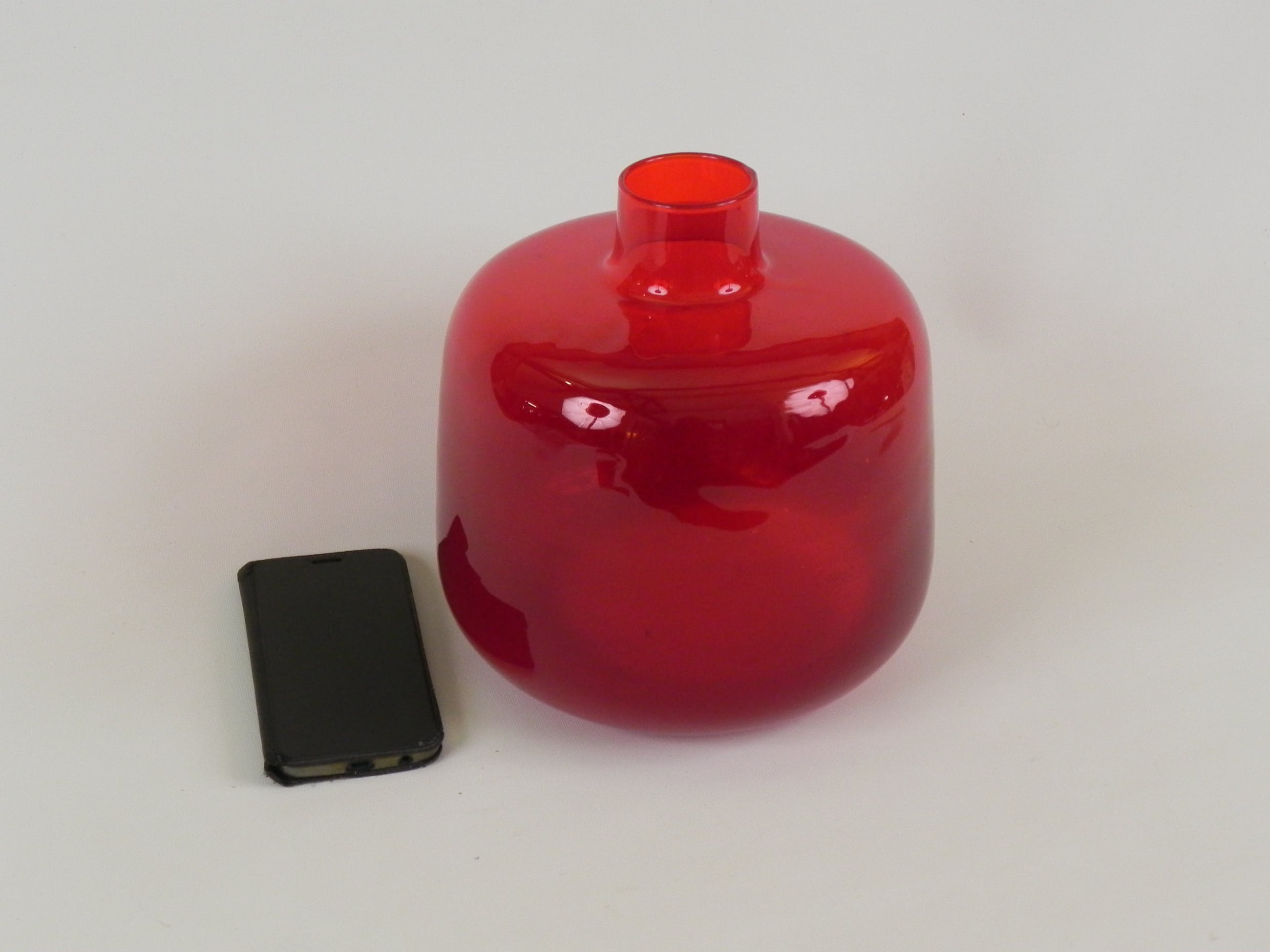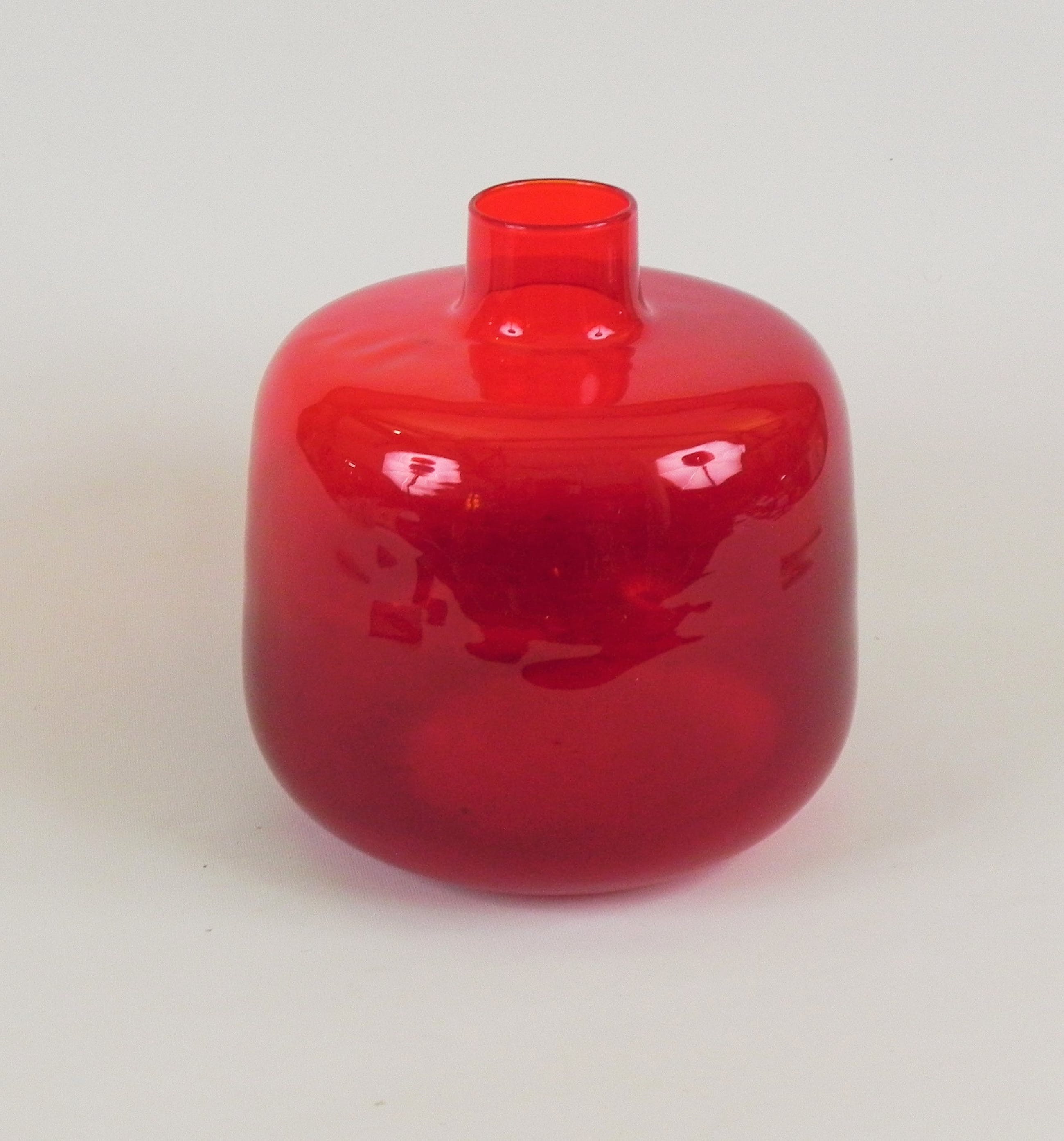 Rode glazen vaas met smalle opening. Vermoedelijk ontwerp van W.J.Rozendaal