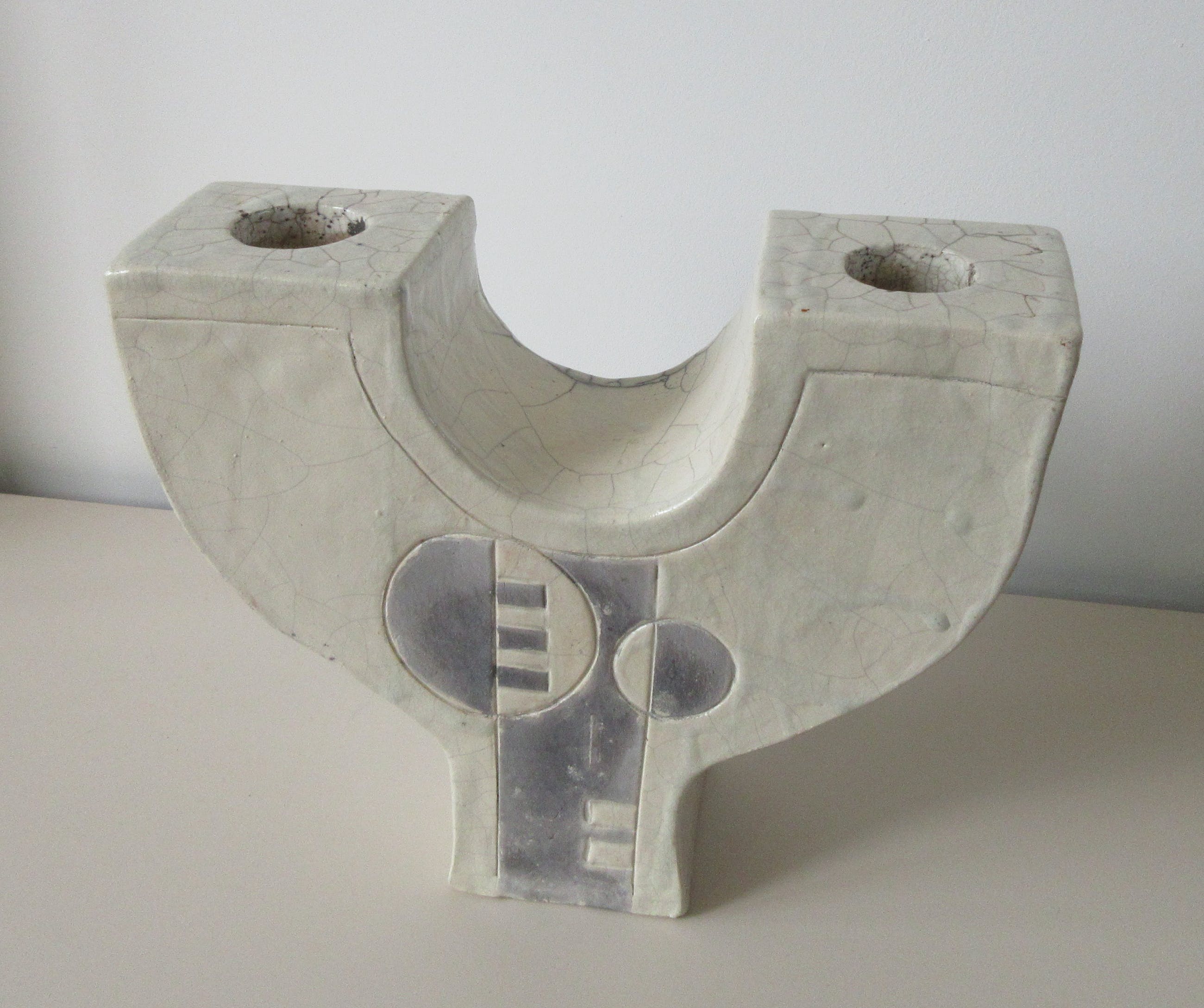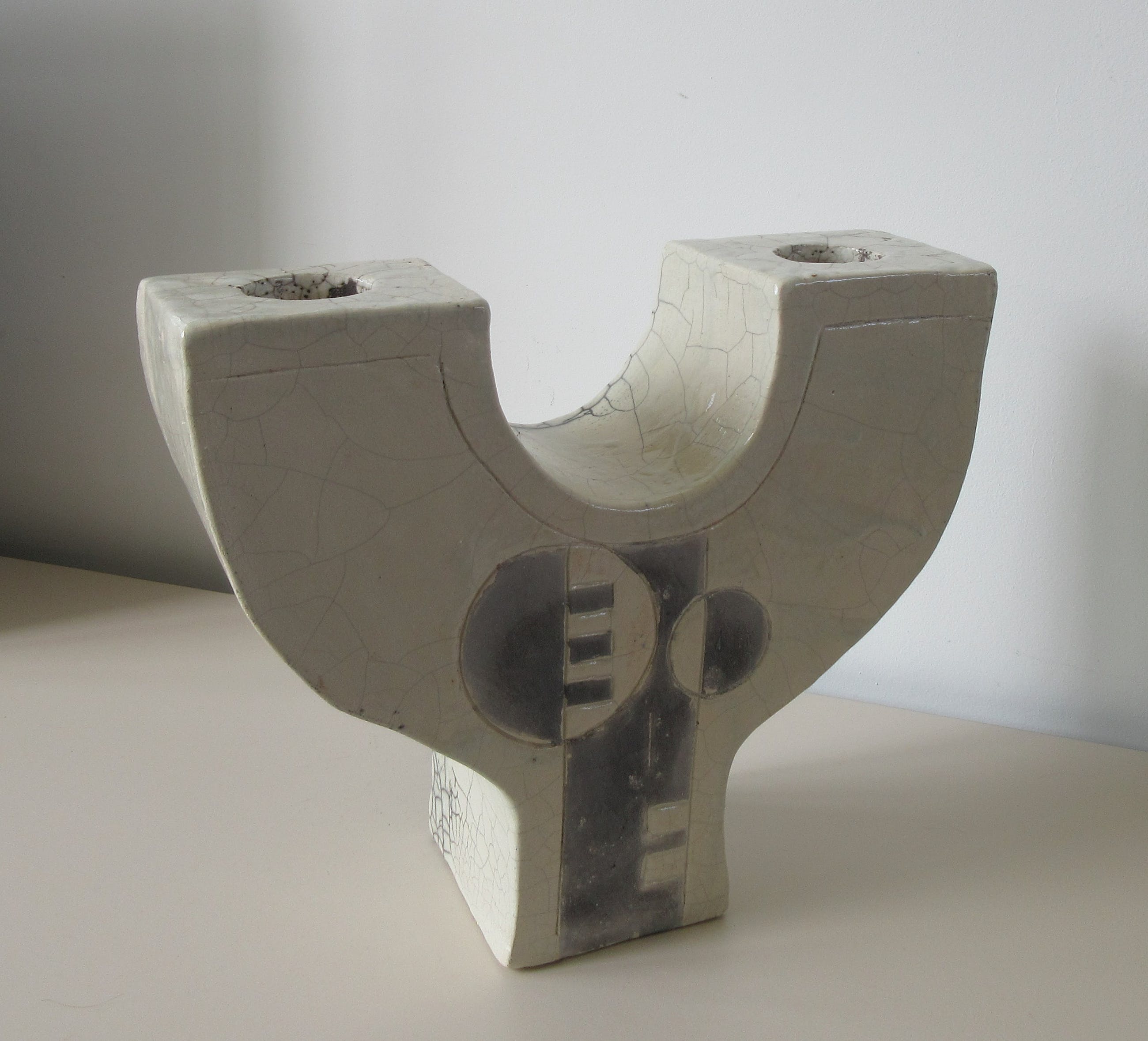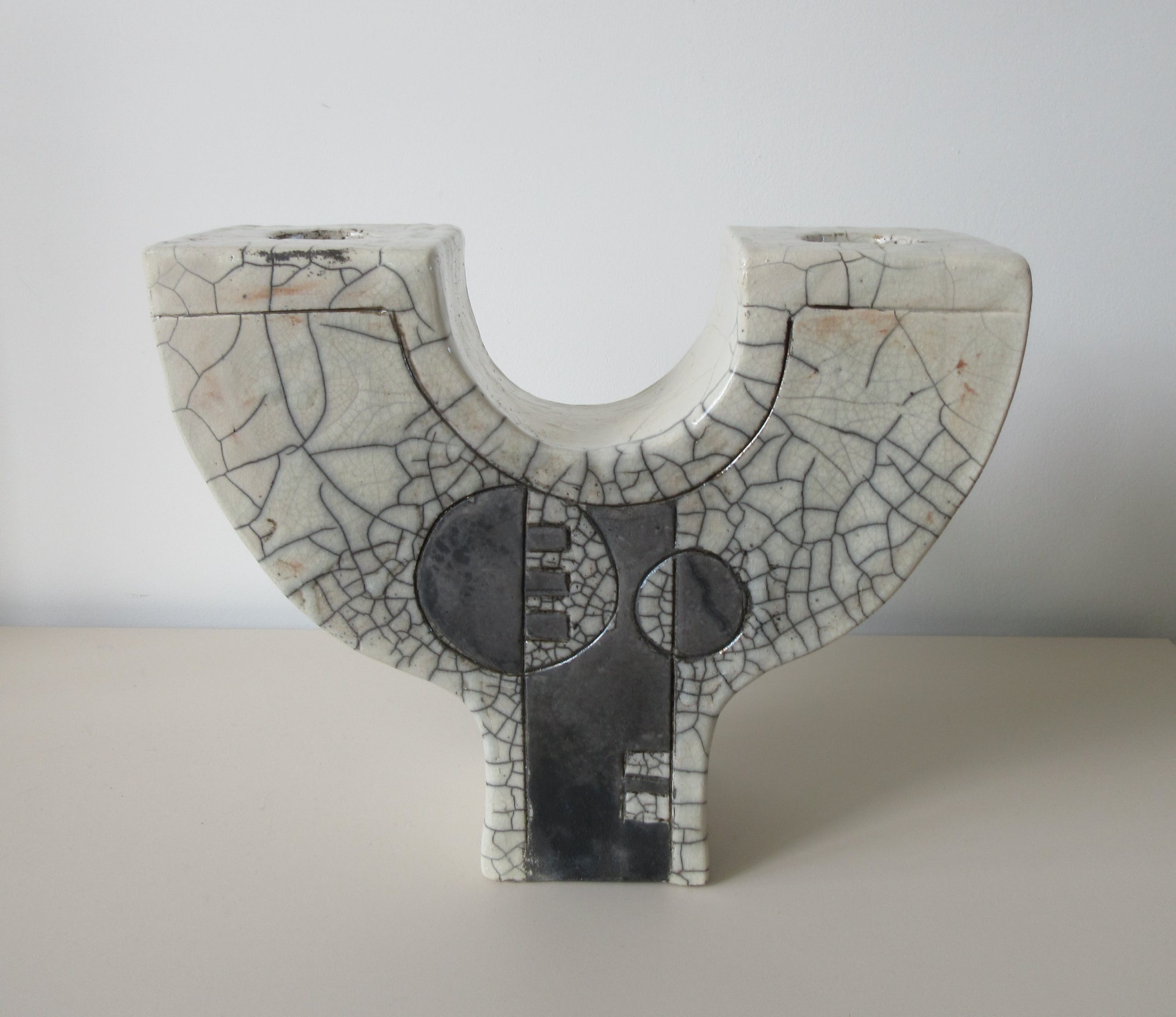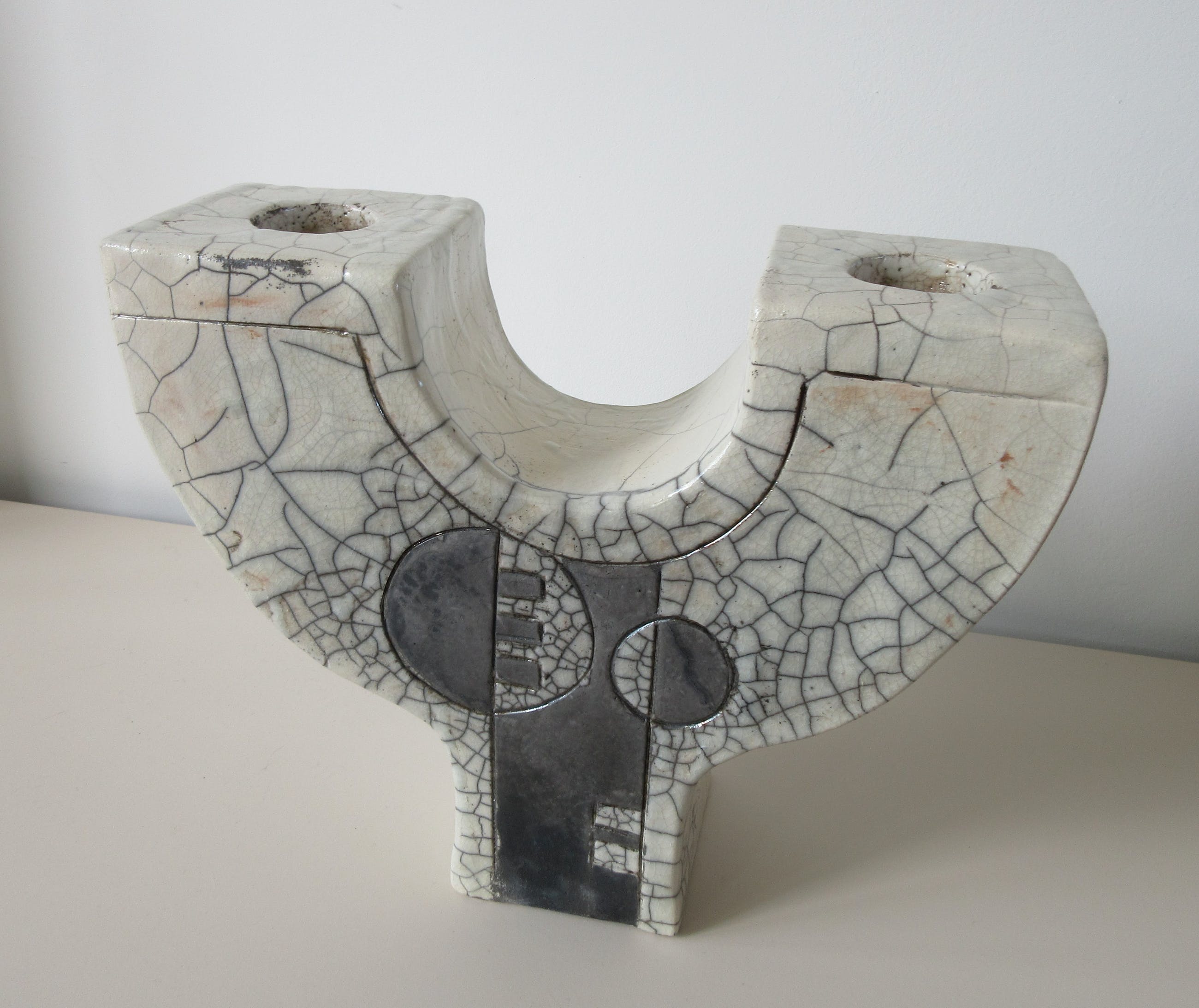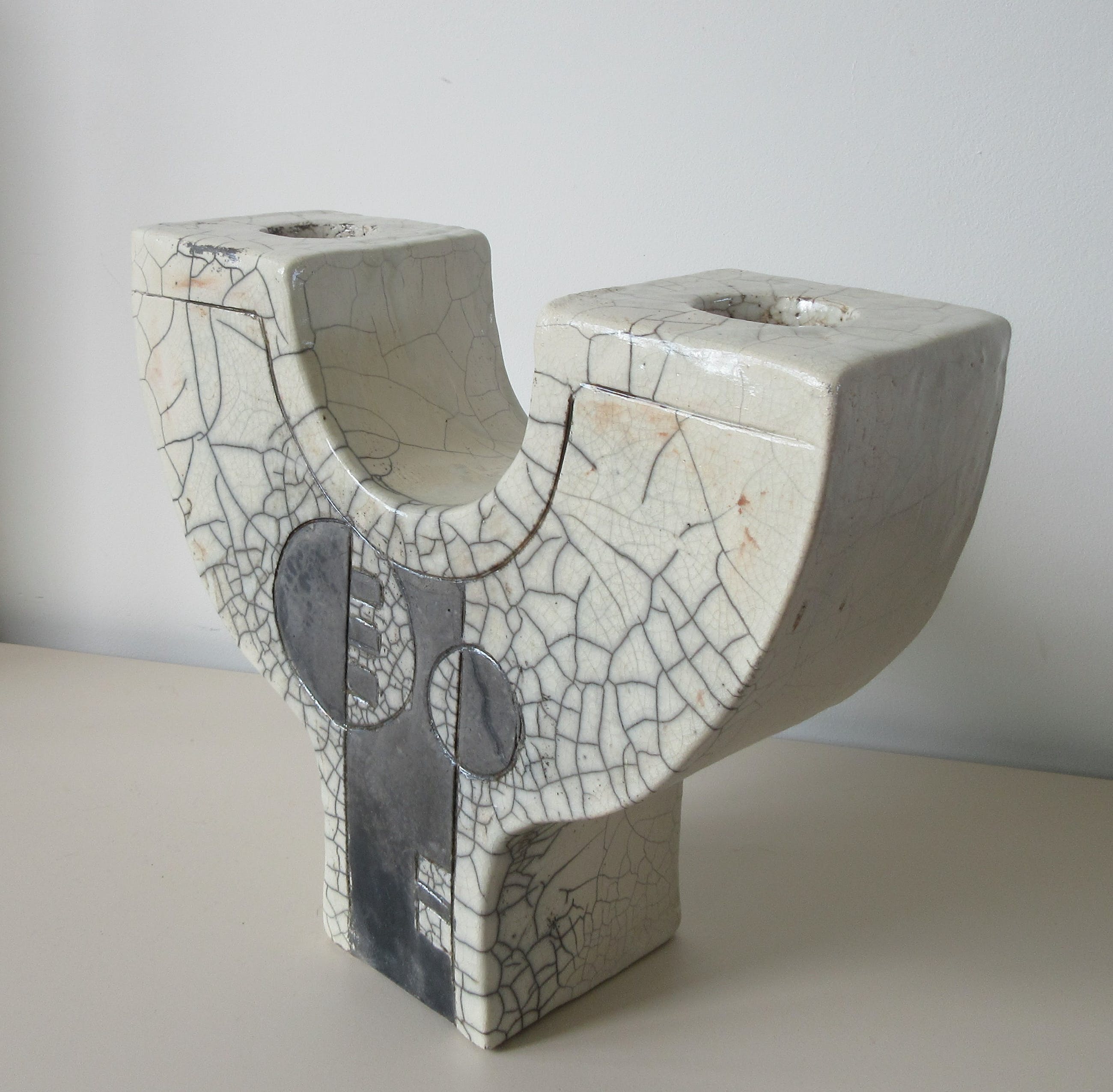 XL Raku Keramische Dubbele Kandelaar met Brutalistische decoratie. In perfecte conditie en gesigneerd aan de onderzijde SP of JP. Kunstenaar mij onbekend.