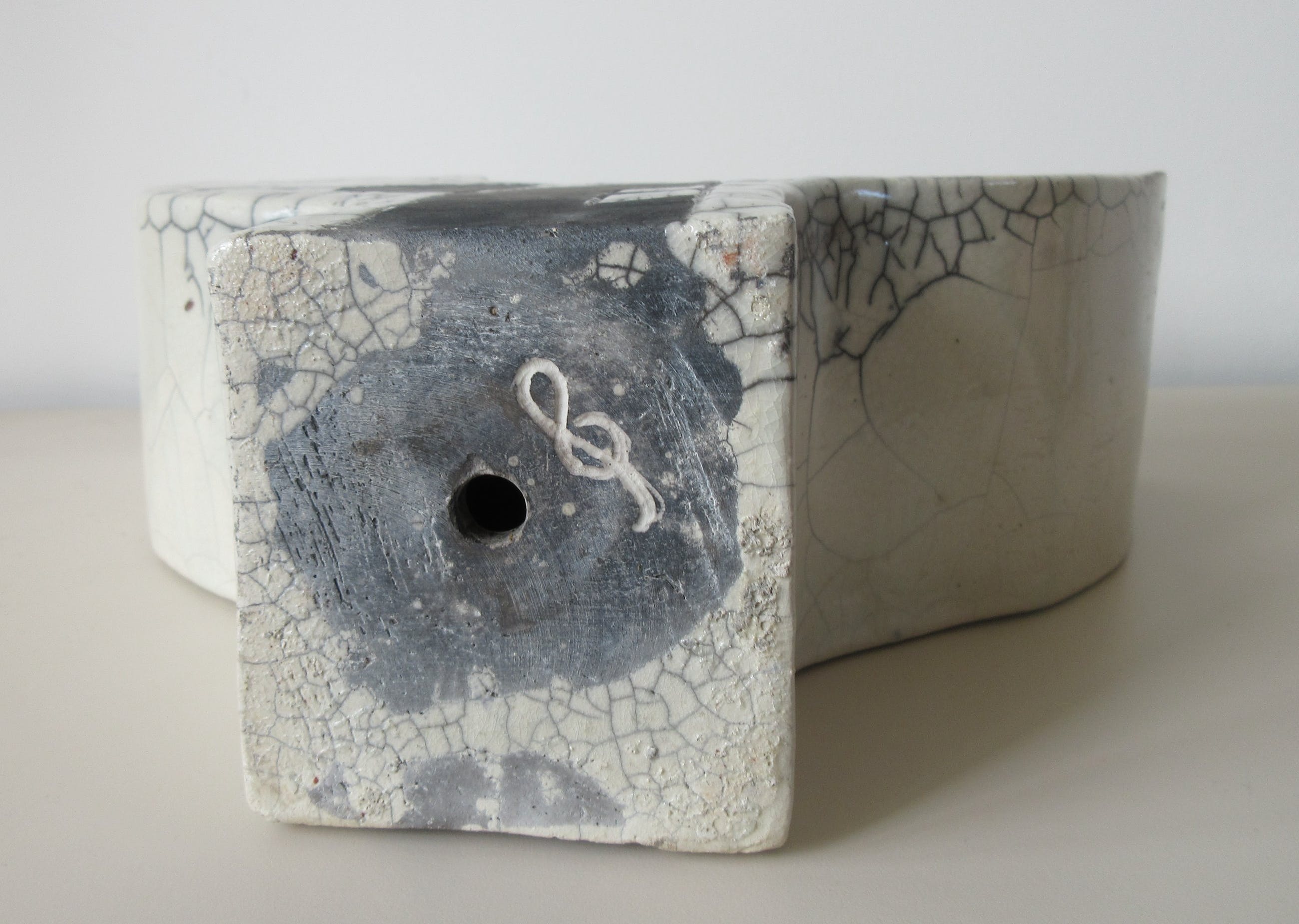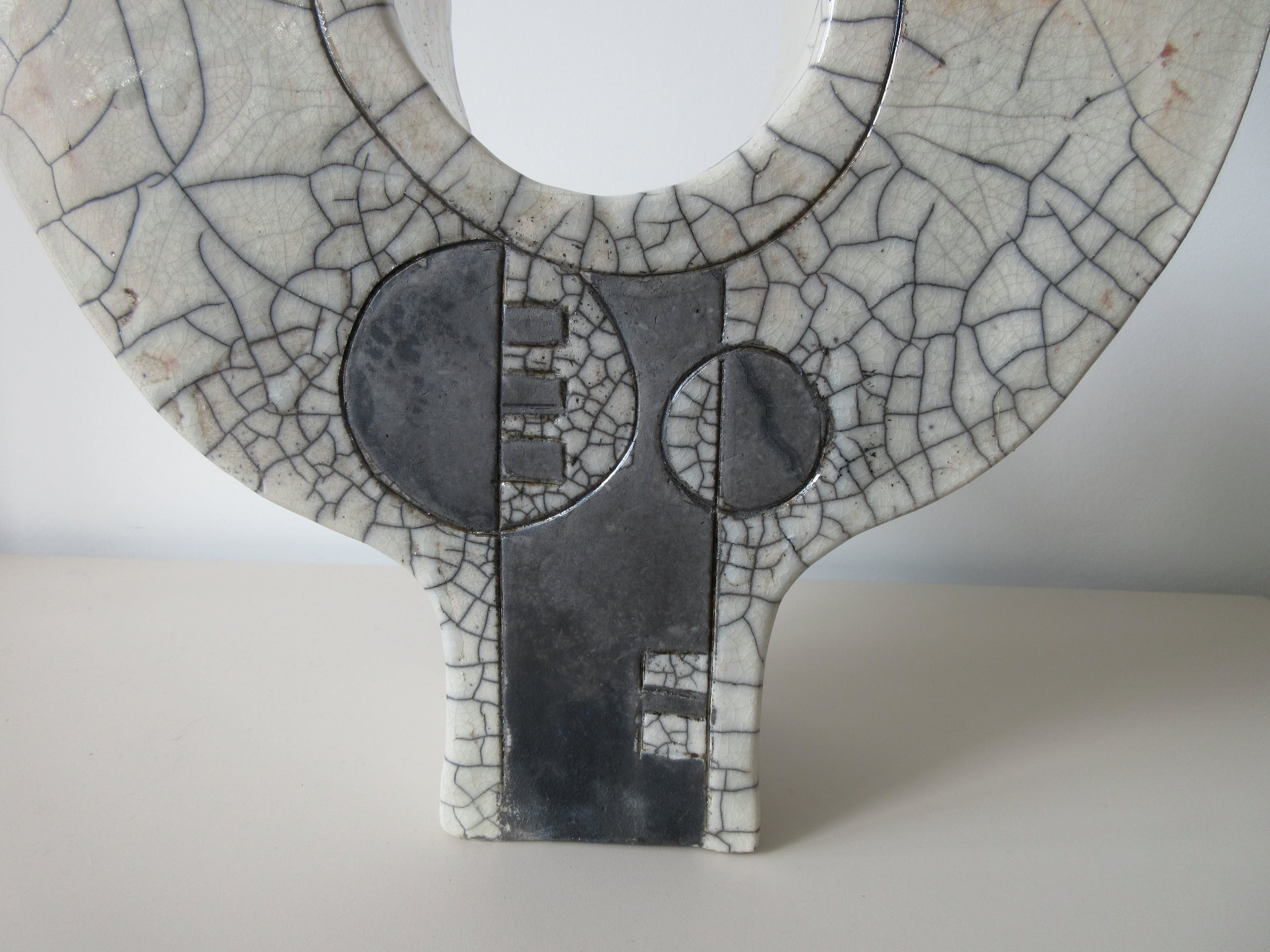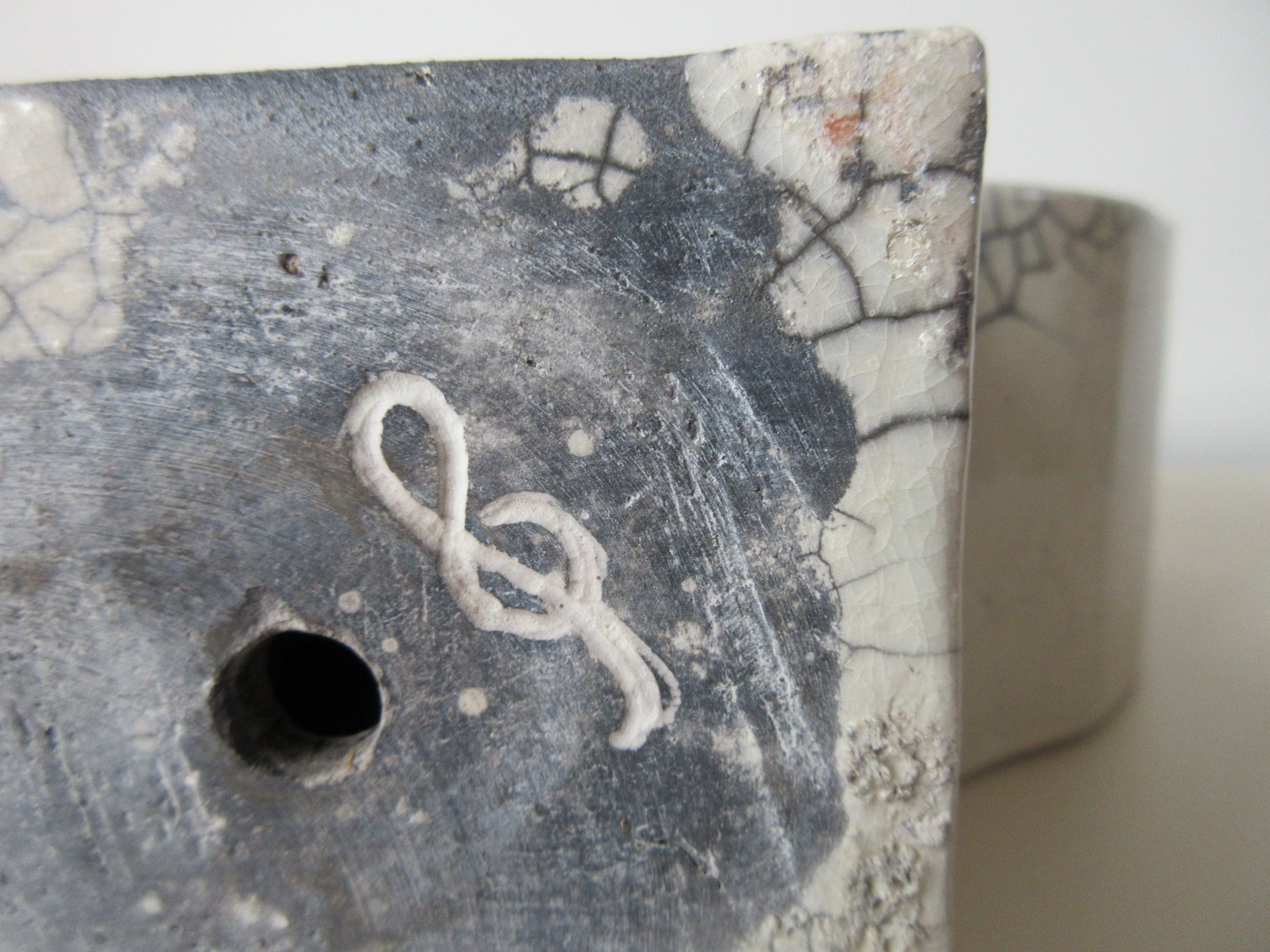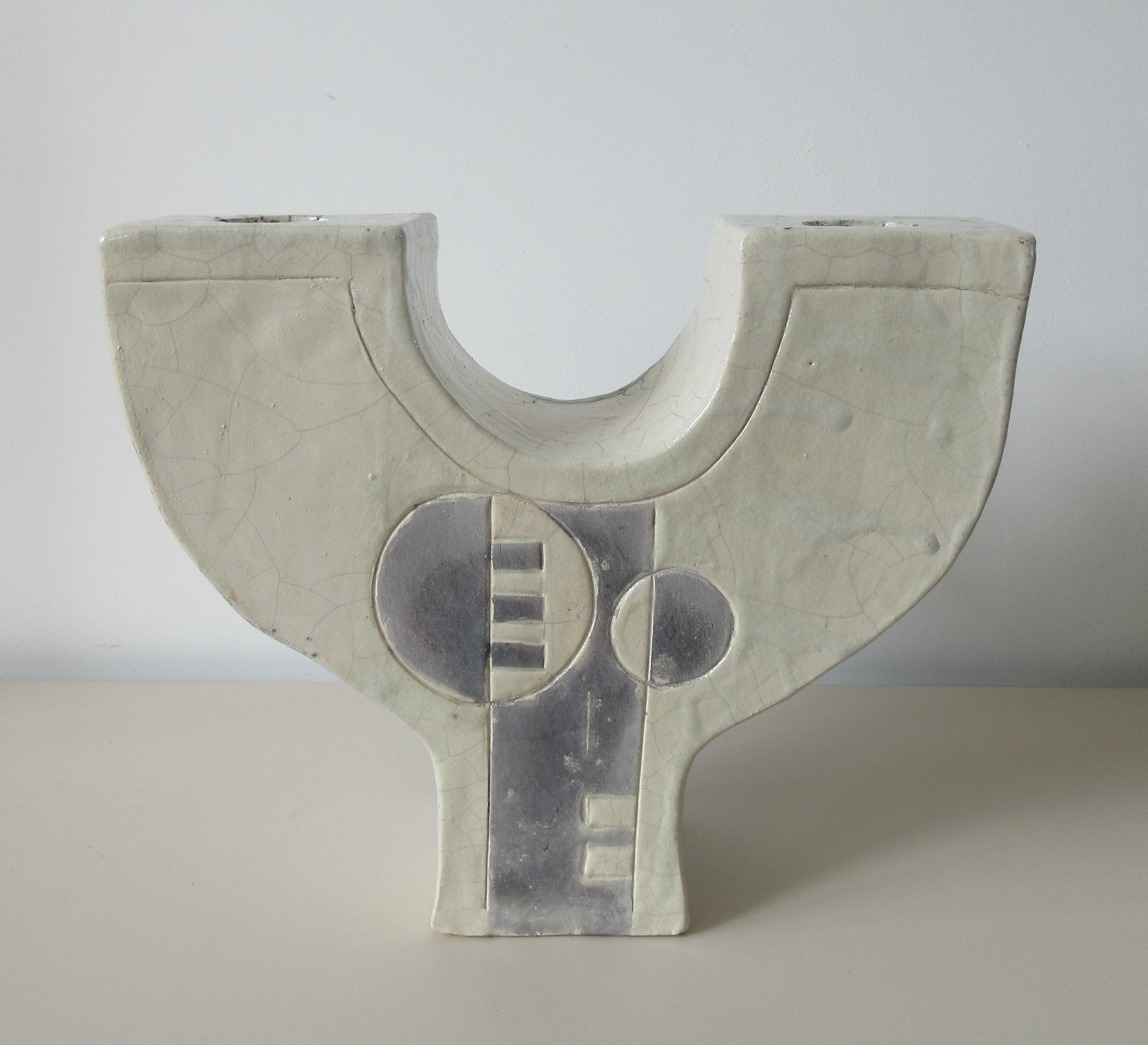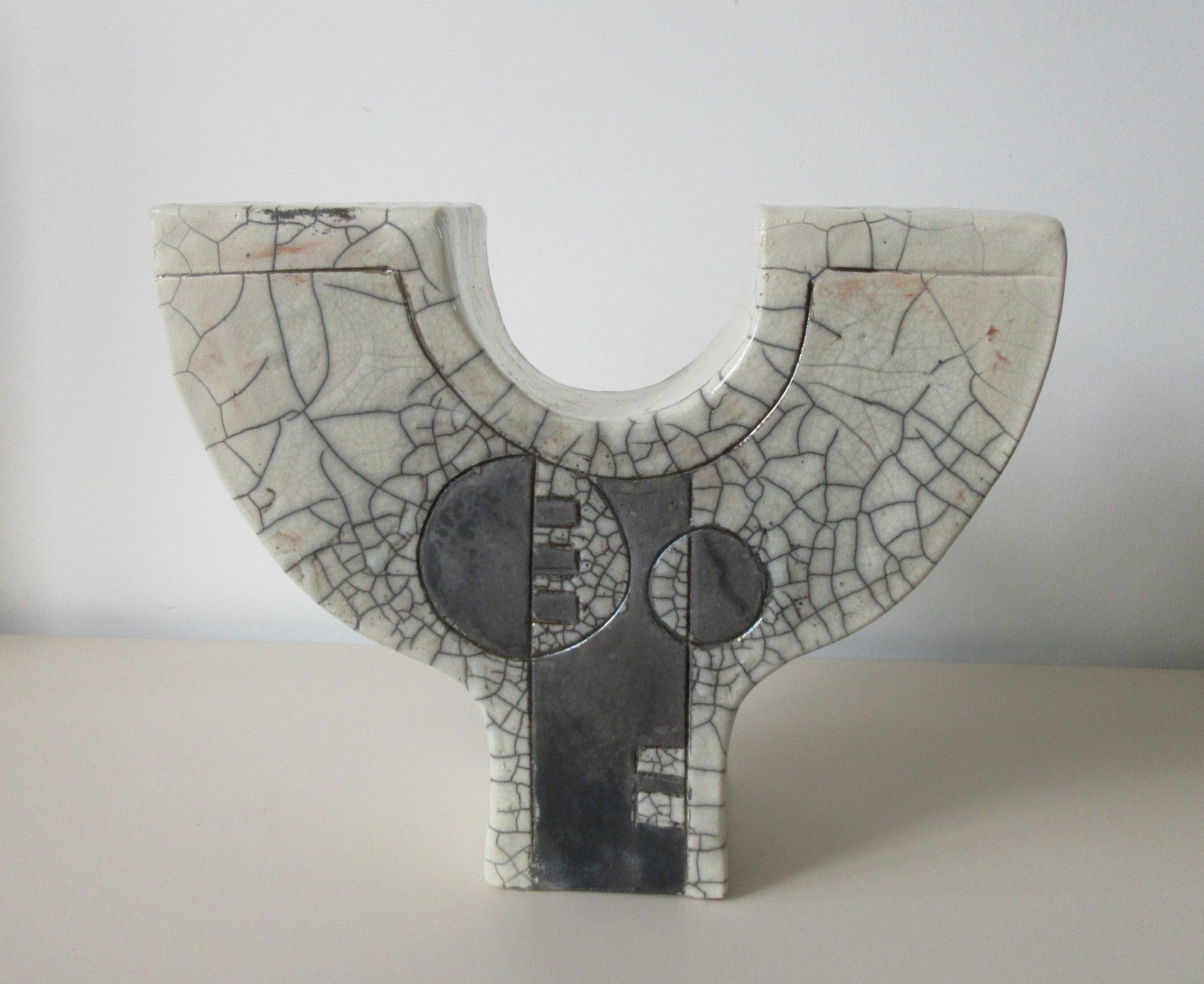 XL Raku Keramische Dubbele Kandelaar met Brutalistische decoratie. In perfecte conditie en gesigneerd aan de onderzijde SP of JP. Kunstenaar mij onbekend.