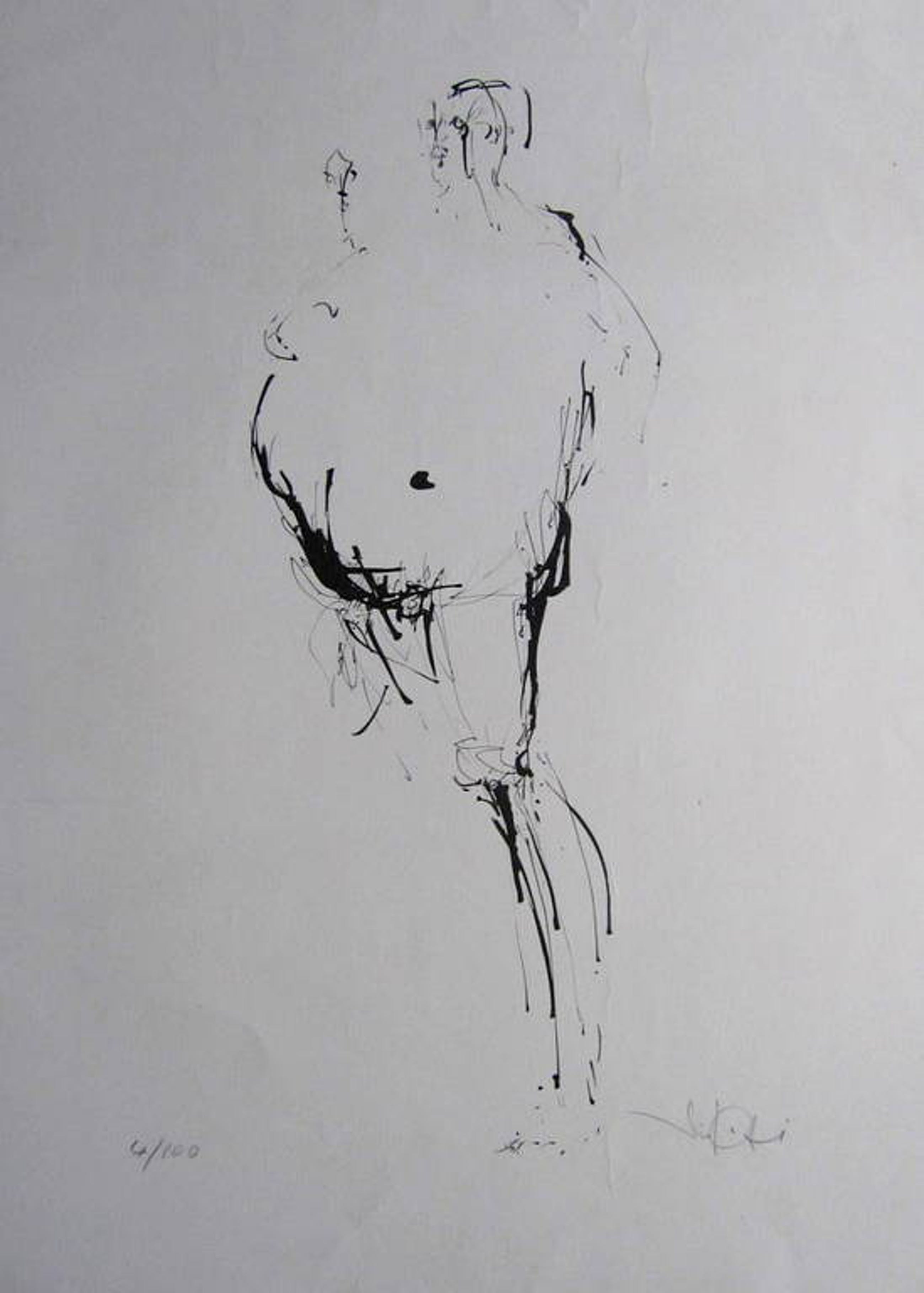 Een voor mij onbekend gebleven kunstenaar alhoewel de handtekening en het motief sterk doen denken aan Giacometti. Mooi werk om te onderzoeken.