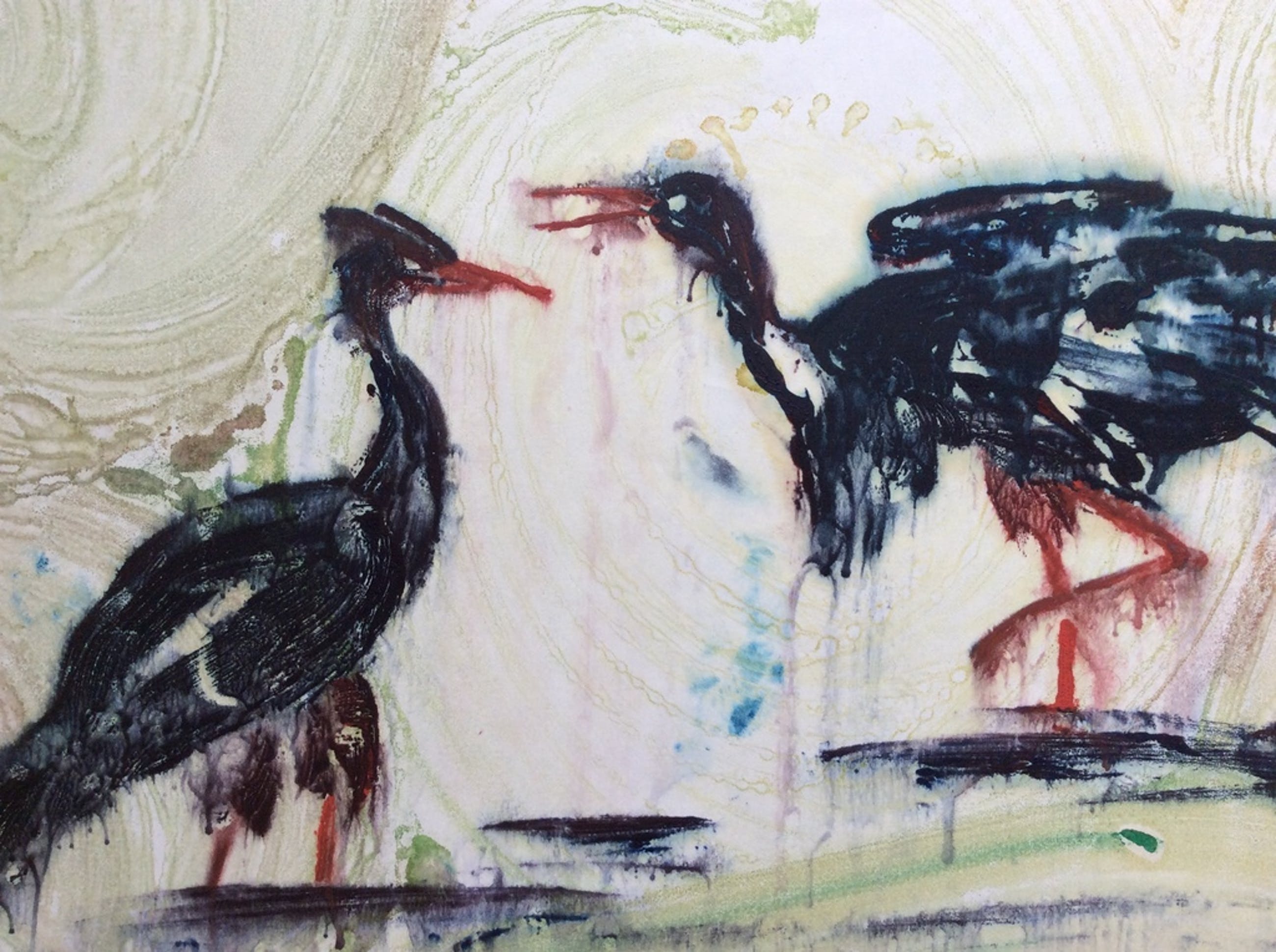Van onbekende kunstenaar: aquarel van scene met twee zwarte kraanvogels. Vlotte sfeer schildering op papier. Afm. blad: 43 x 61 cm. Rechtsonder met potlood gesigneerd.
