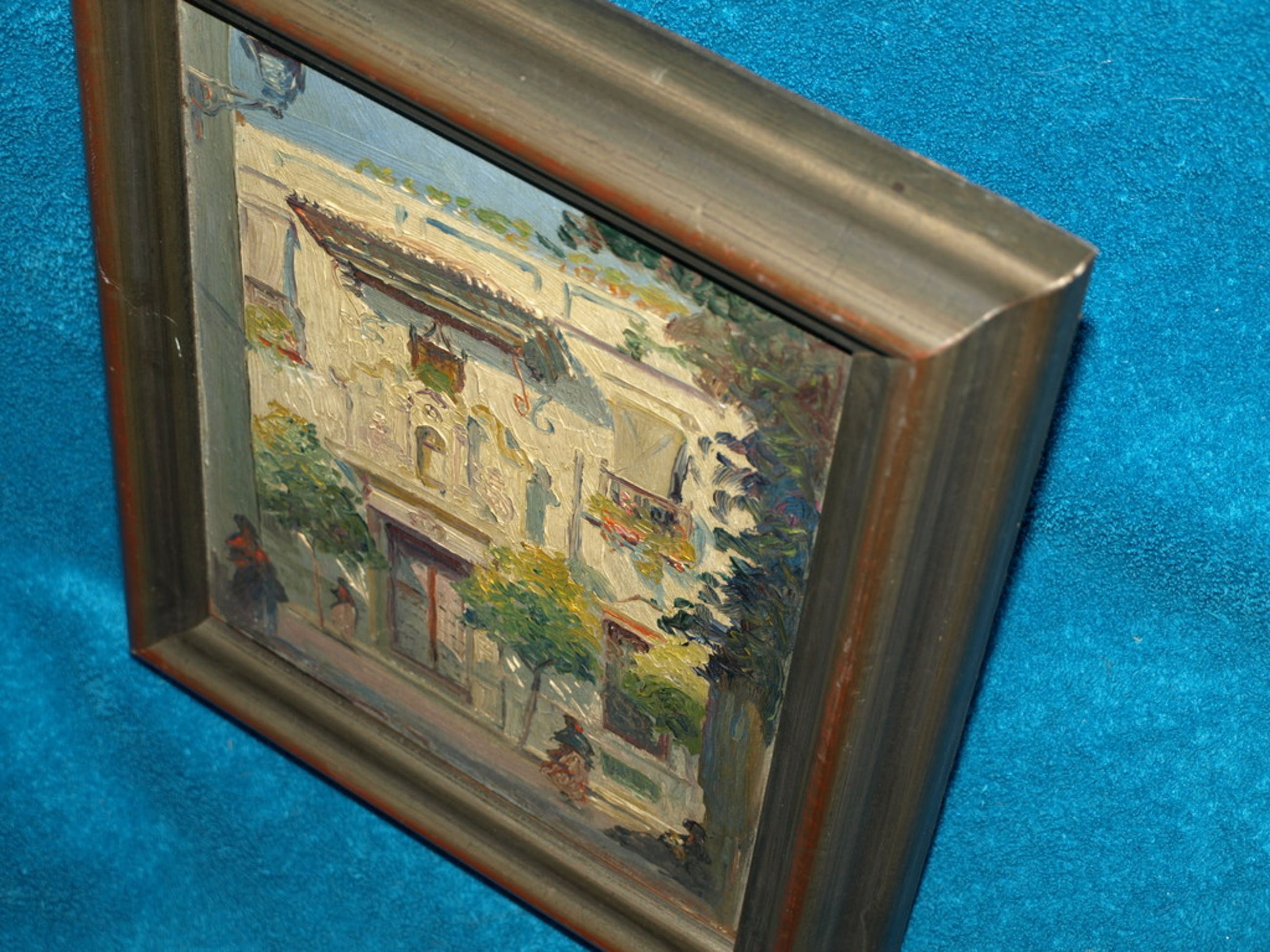 Het schilderij is geschilderd op board en ingelijst in een houten lijst (32 x 26 cm).