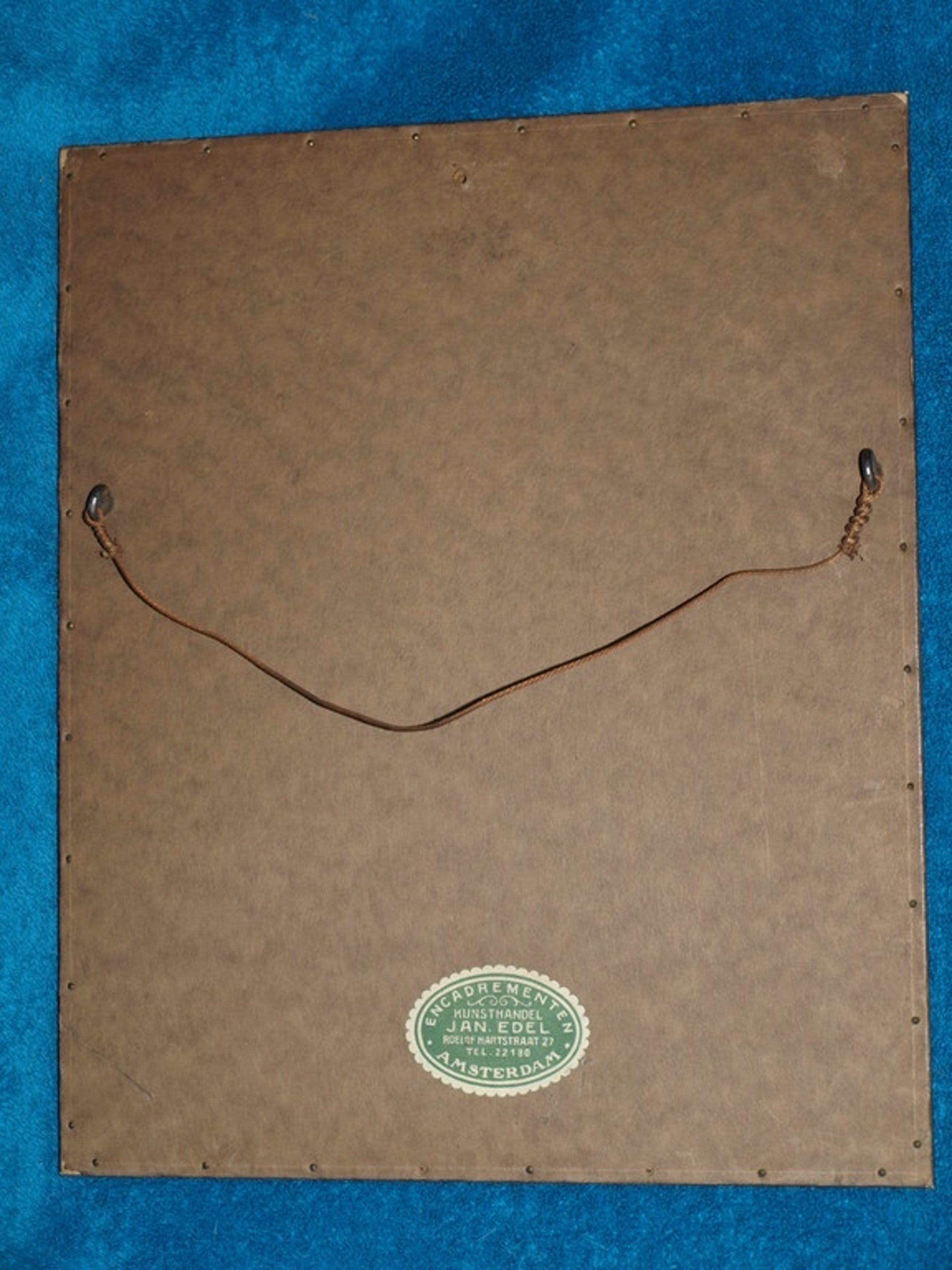 Het werk is ingelijst door en mogelijk ook gekocht bij ‘Kunsthandel Jan Edel’ (Roelof Hartstraat, Amsterdam).
