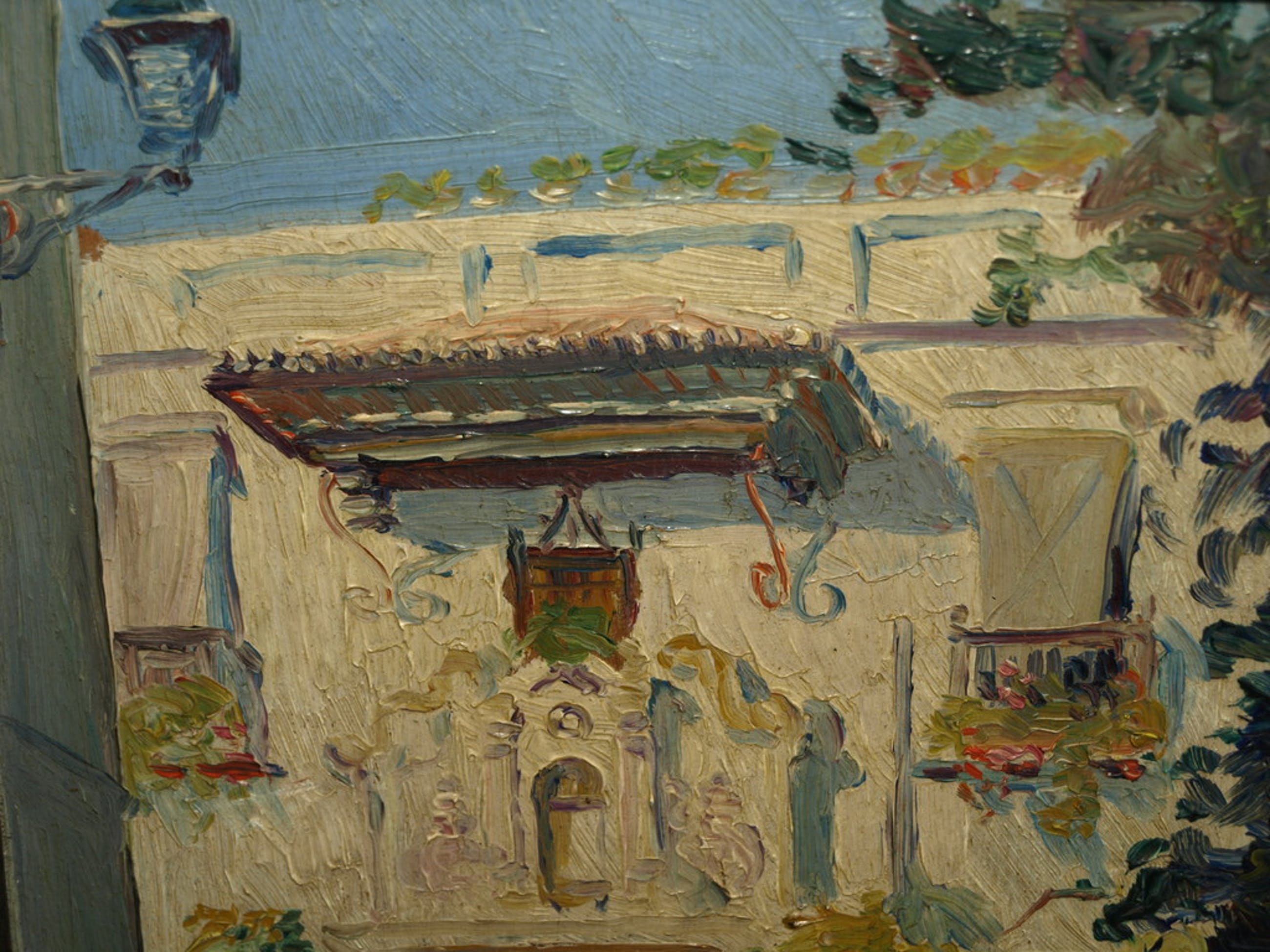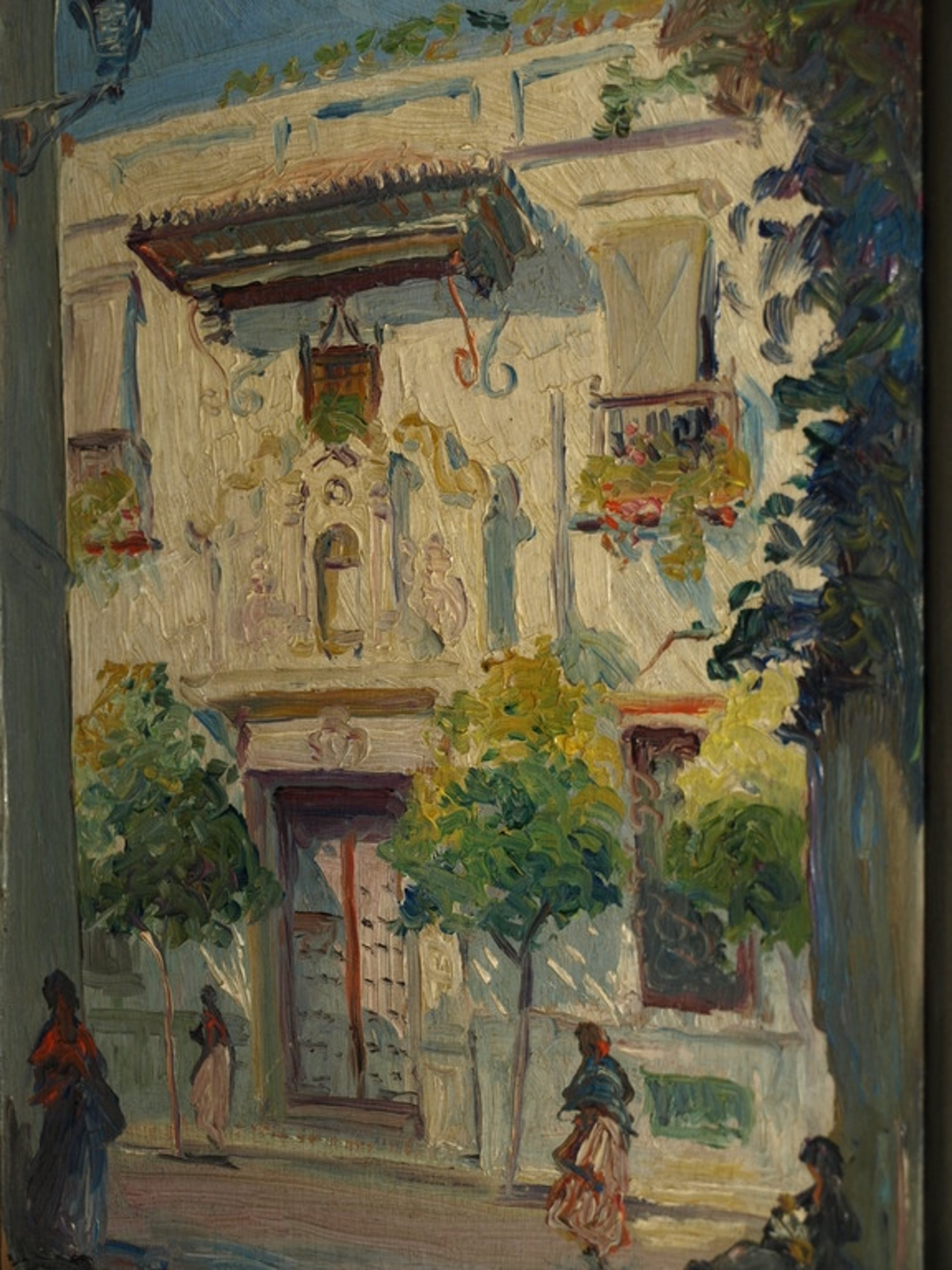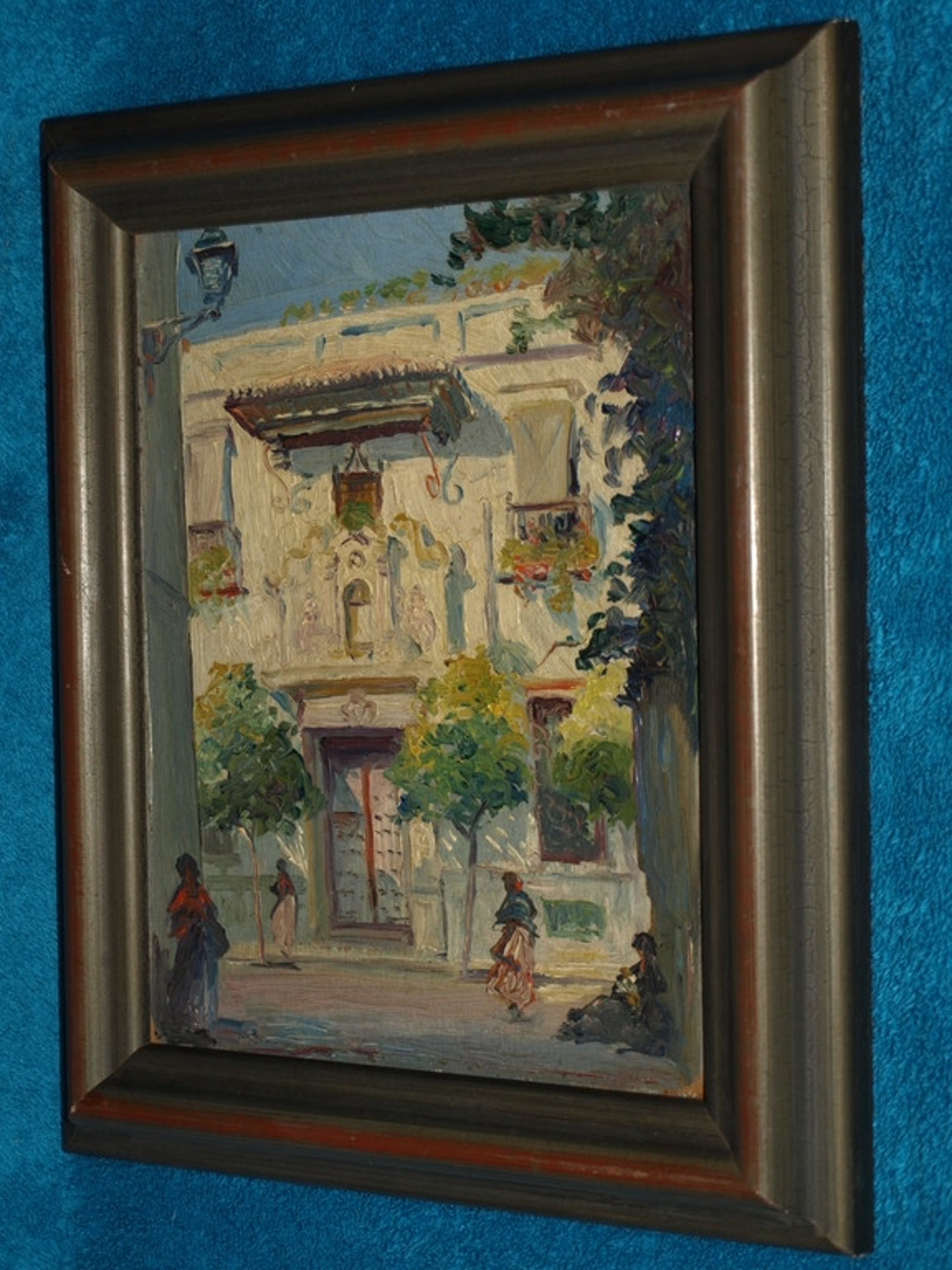 Een ingelijst olieverfschilderij met een voorstelling van een plaats in (waarschijnlijk) Spanje.