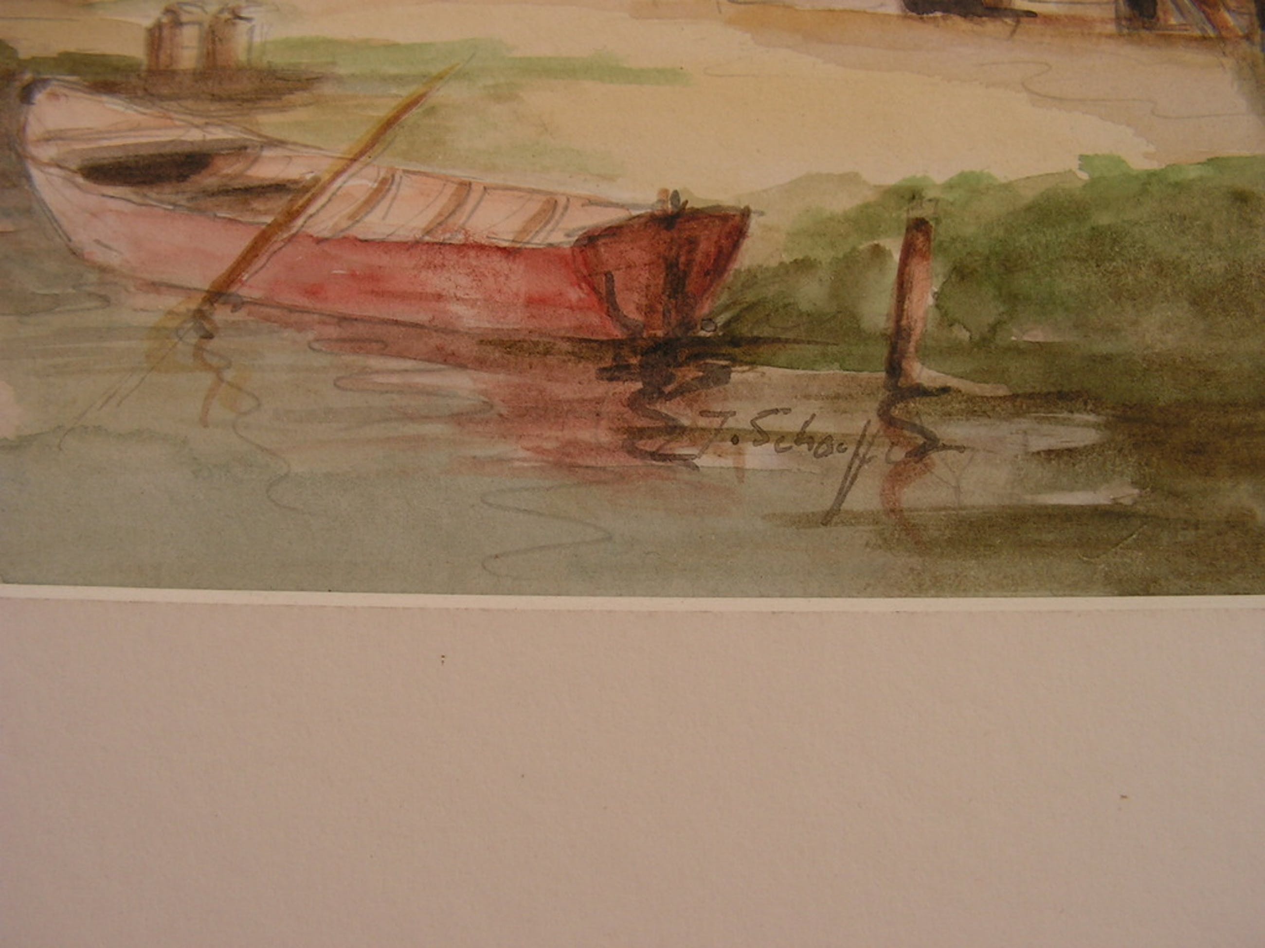 Gesigneerd rechtsonder het bootje. Afmetingen; ca 30 x 20 cm, inclusief het passe partout; 50 x 40 cm.