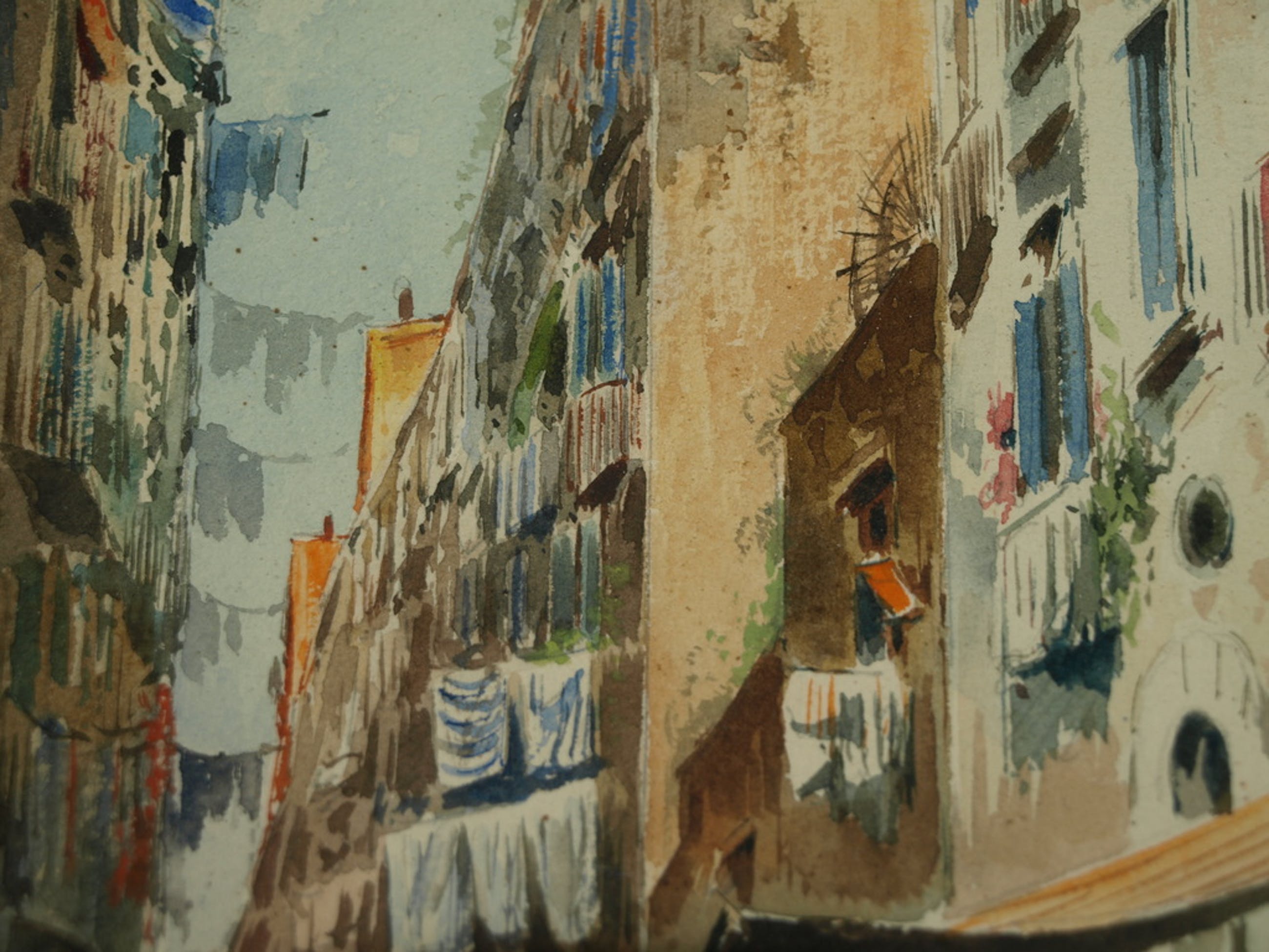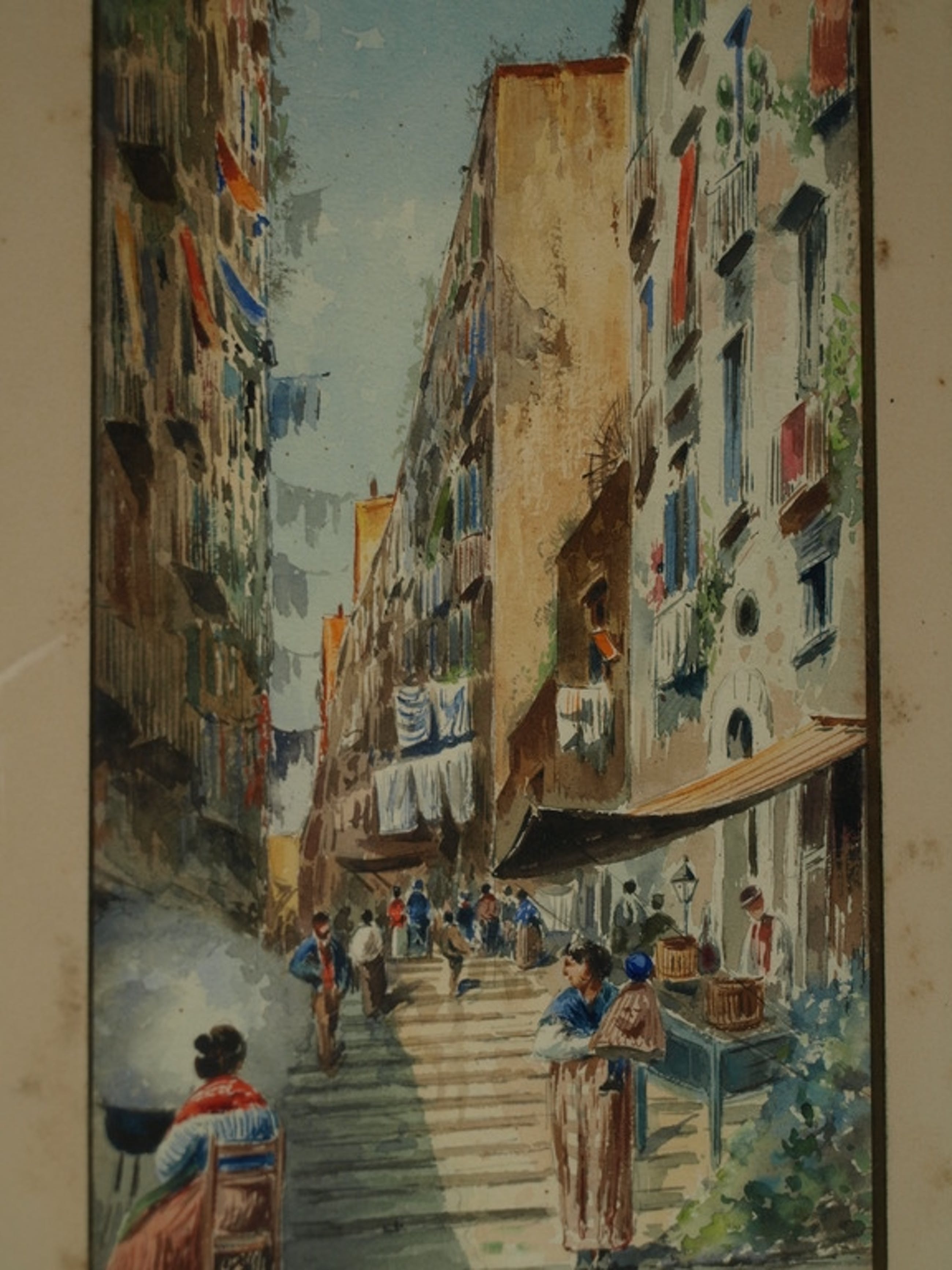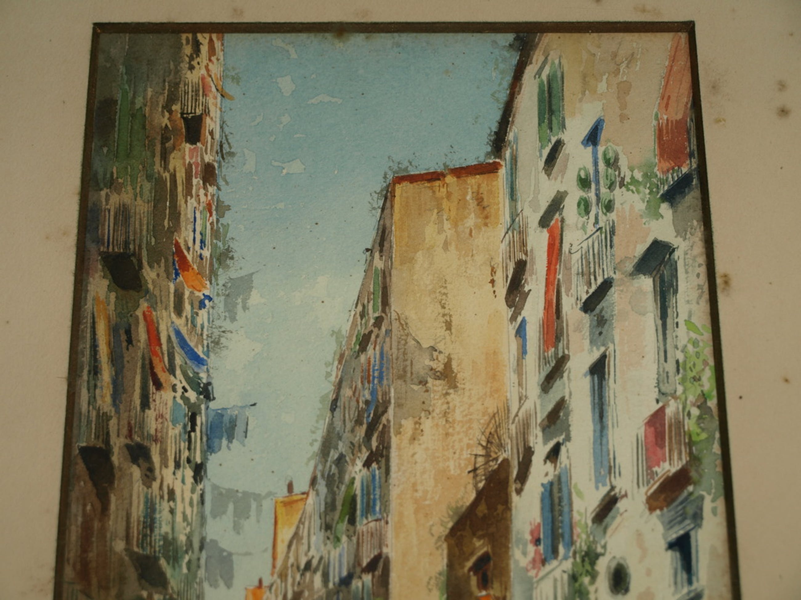 Een oude aquarel met een voorstelling van een straatje in een Zuid-Europsese stad. De ouderdom is onbekend. Waarschijnlijk uit de 1e helft van de 20e eeuw.