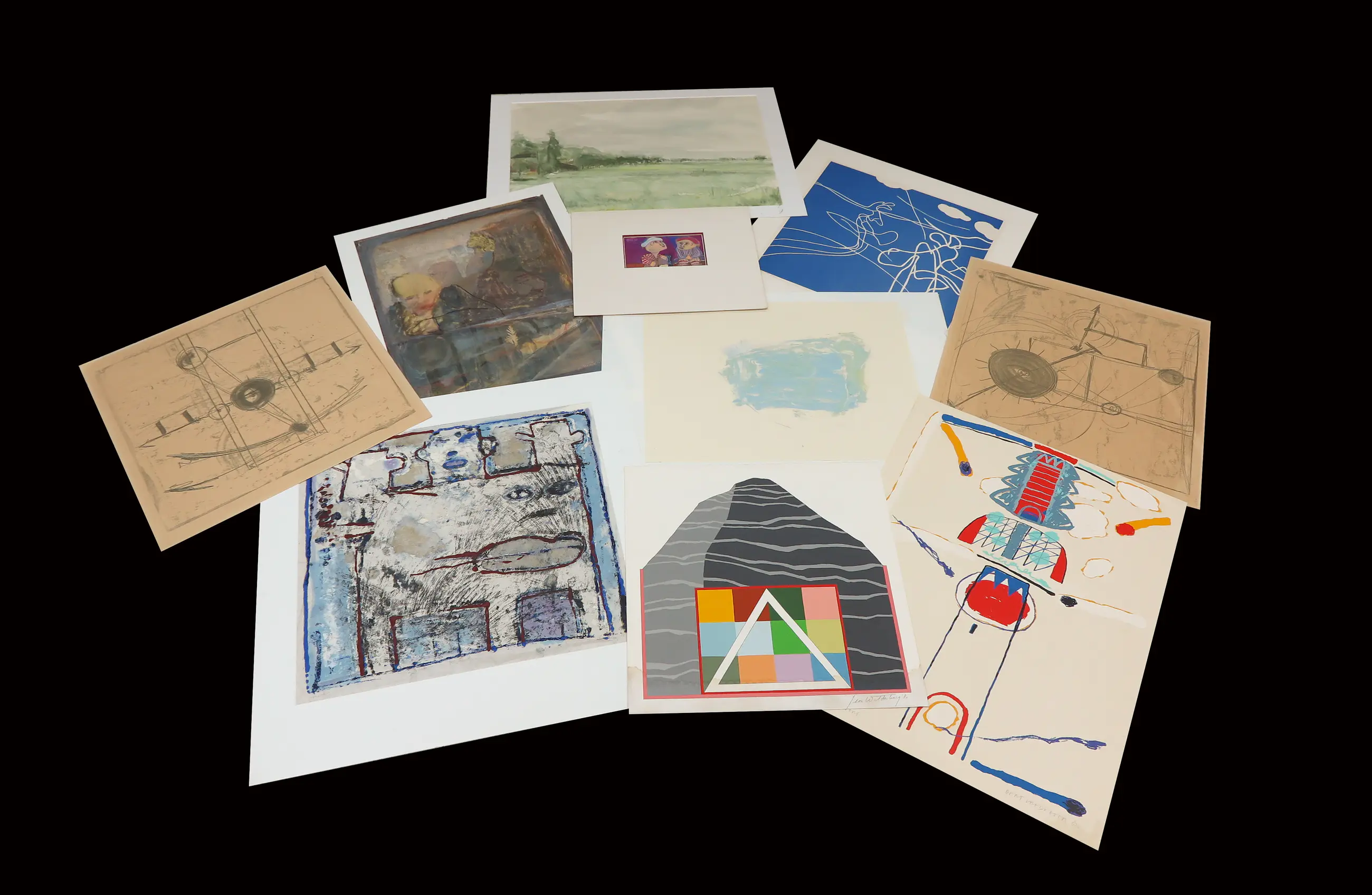 | Wat papierschade en vouwen zichtbaar op een aantal werken. Vochtschade zichtbaar op een van de werken. Bovendien wat vergeling van het papier. | |