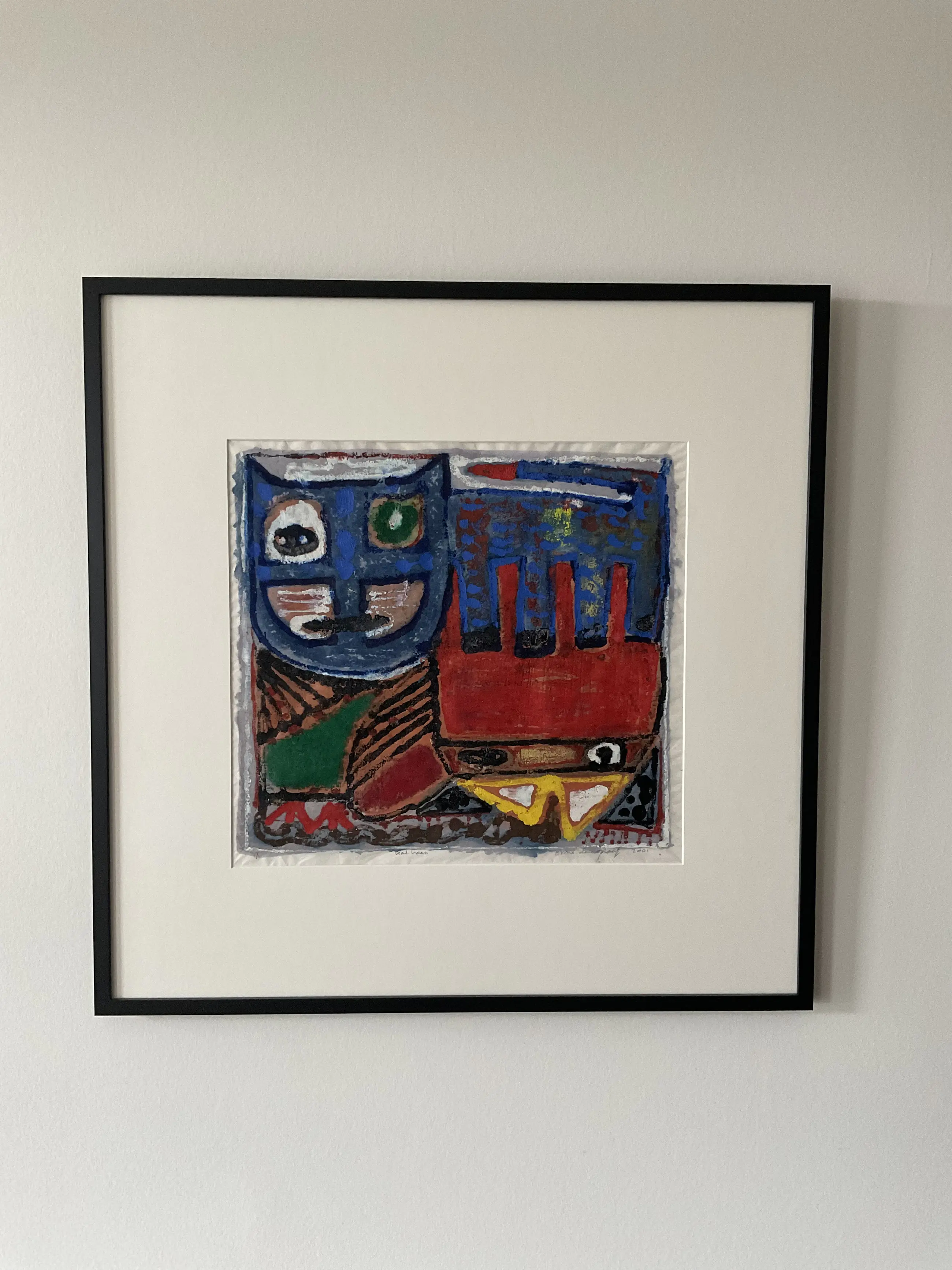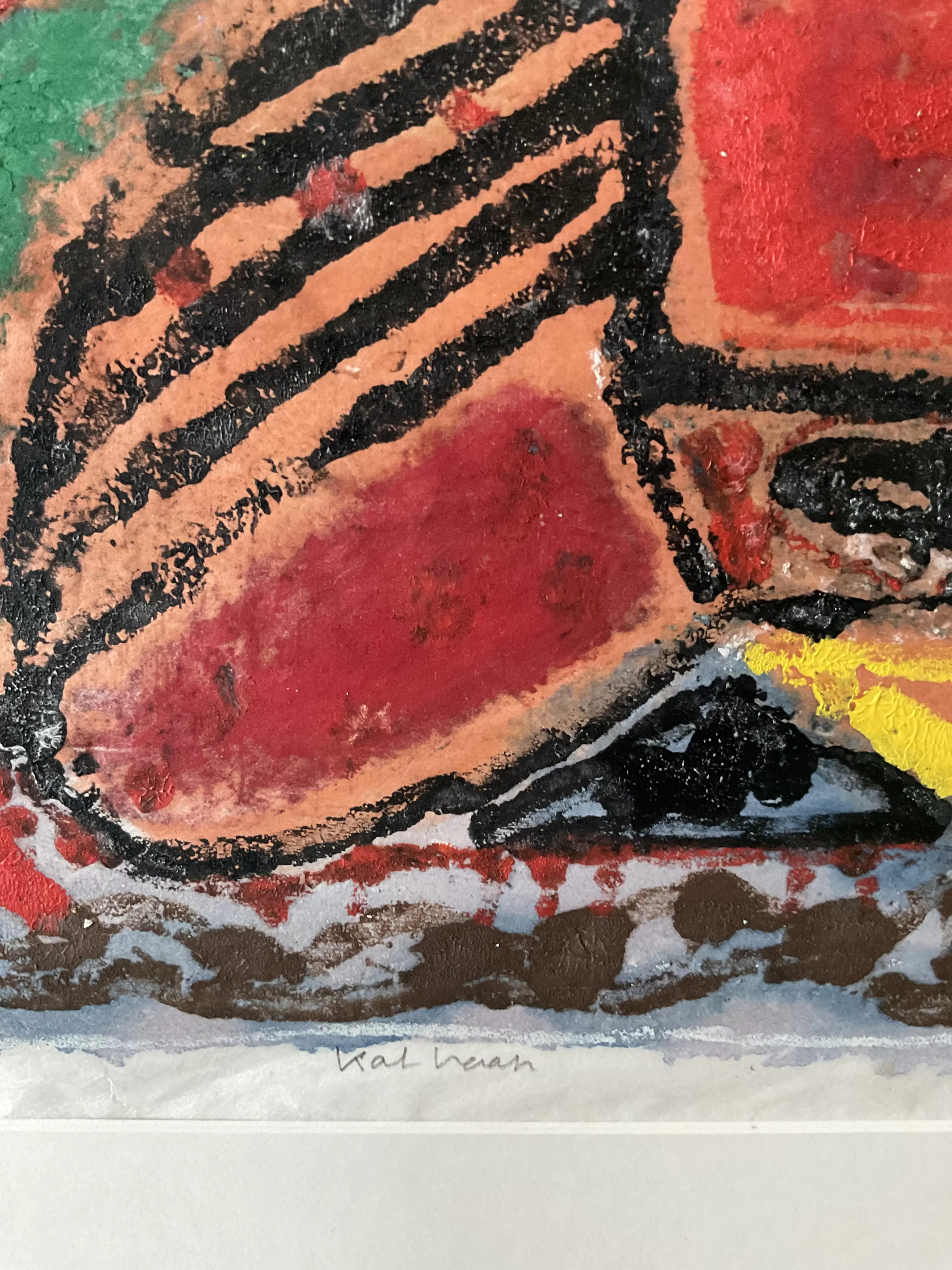 Een monotype van Onno de Graaf titel Kat Haan Professioneel gelijst in zwart aluminium met glas plaat In zeer goede staat