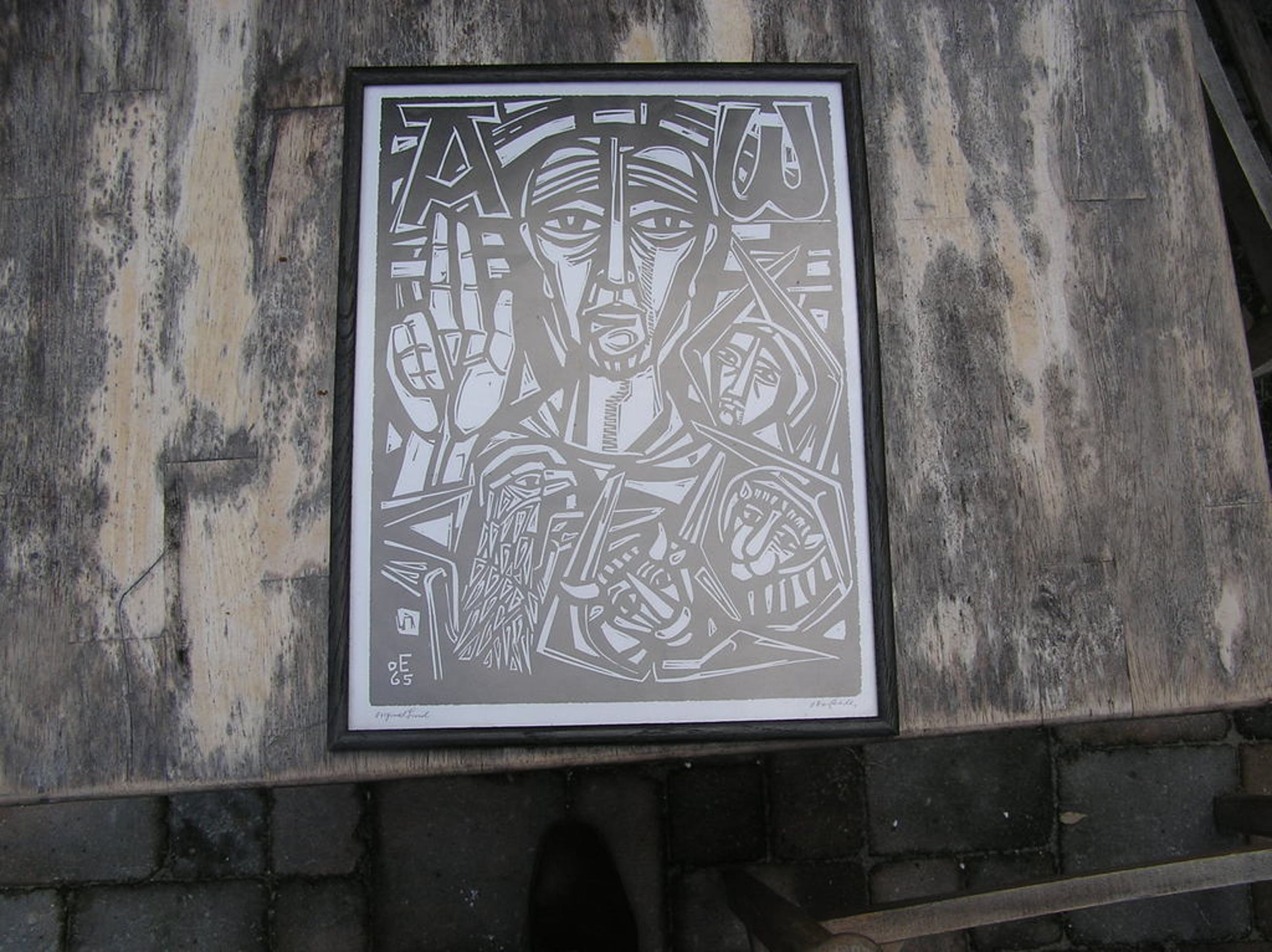 Originele Linoleumsnede van Jezus Christus en de vier Apostelen. In orignele zwarthoutenlijst en glazen plaat. De linosnede is voorzien van een Ex-libris OE en jaartal '65. Linksonderin staat met potlood geschreven; original linol en hij is rechtsonderin met potlood gesigneerd. Helaas herken ik de signatuur niet en weet ik ook niet wie de kunstenaar of tekenaar is. In prima conditie.
