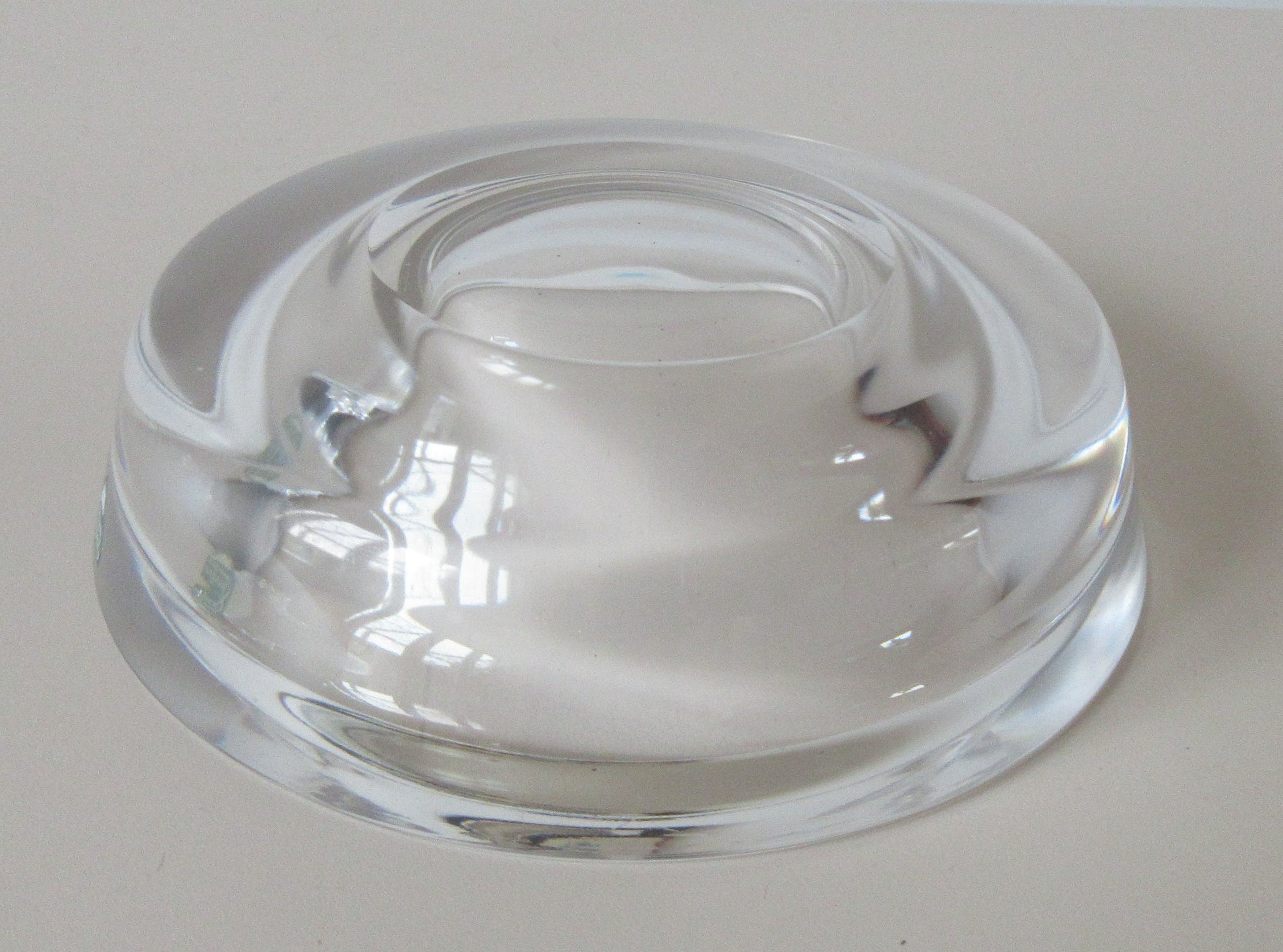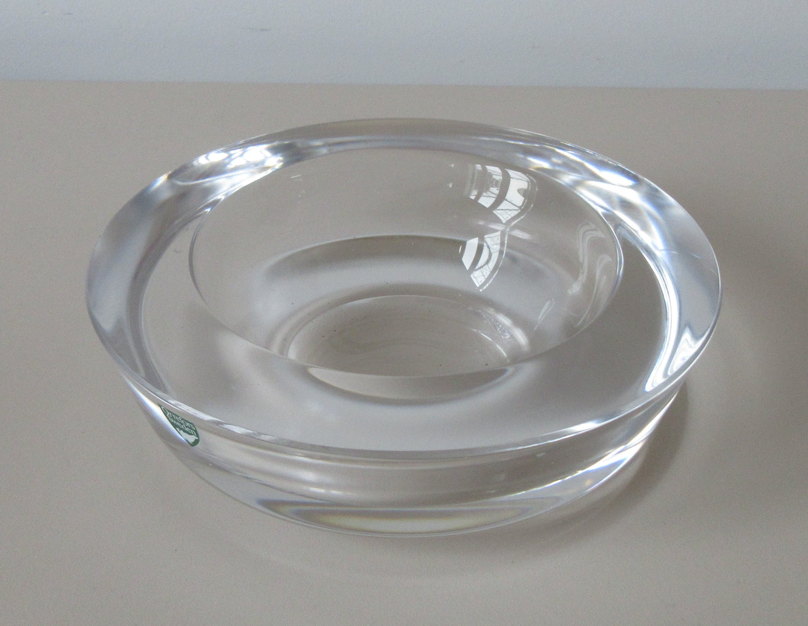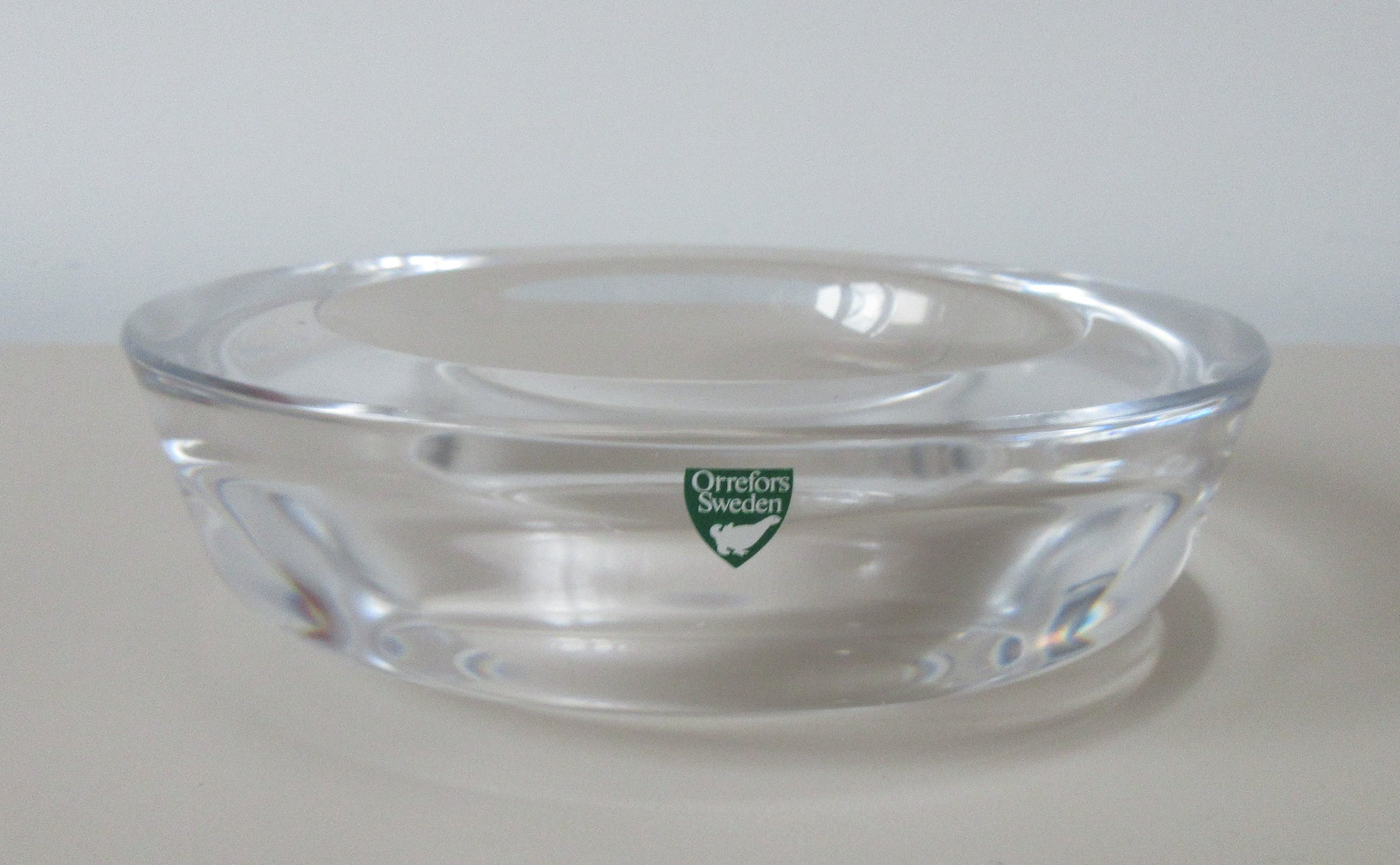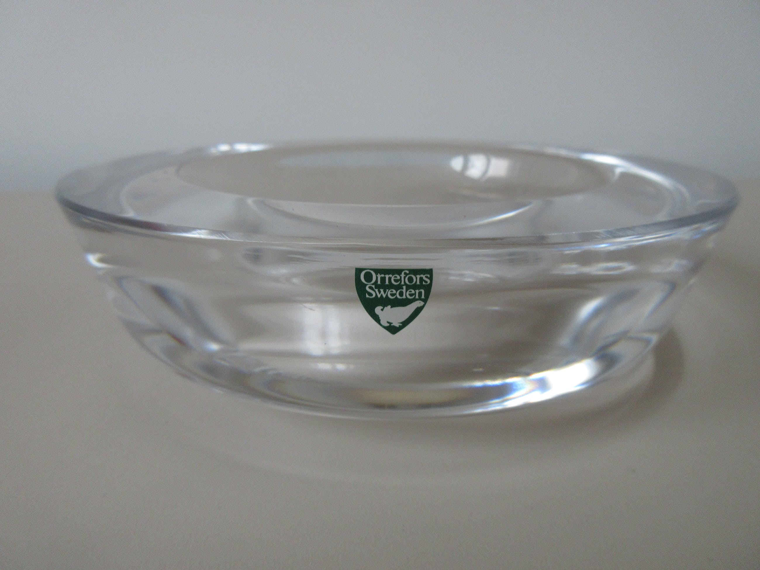 Blank dikwandige kristallen schaal van Orrefors uit Zweden. Mooi strak en tijdloos ontwerp. In zeer goede conditie, niet gesigneerd wel voorzien van een groene merksticker.