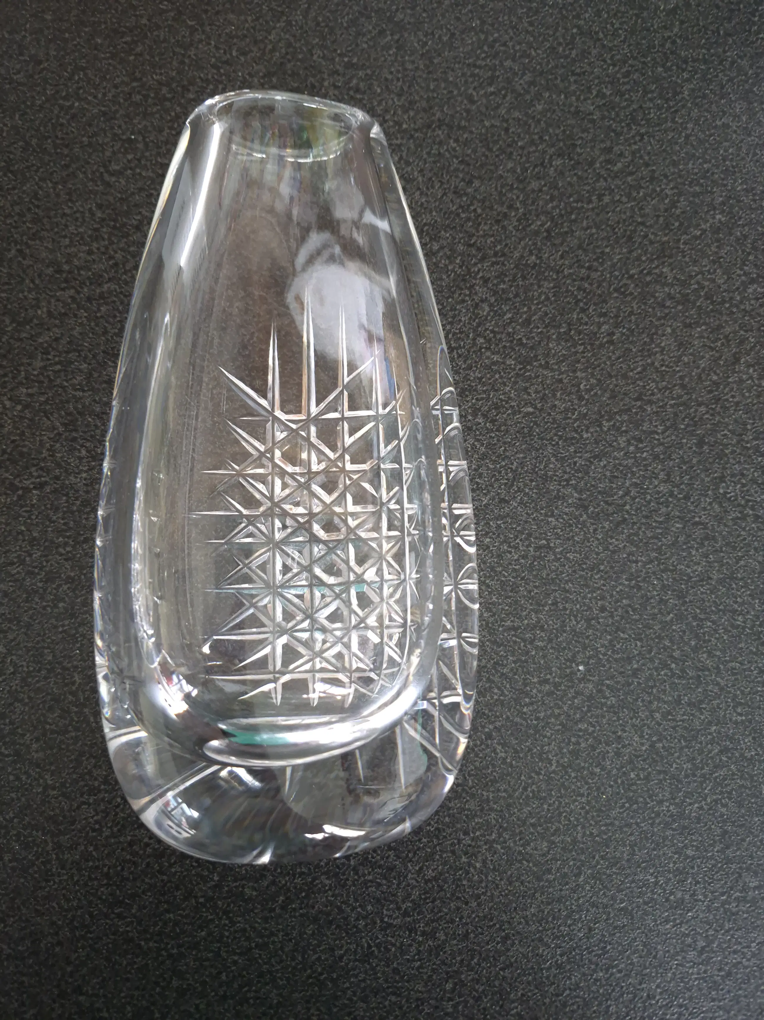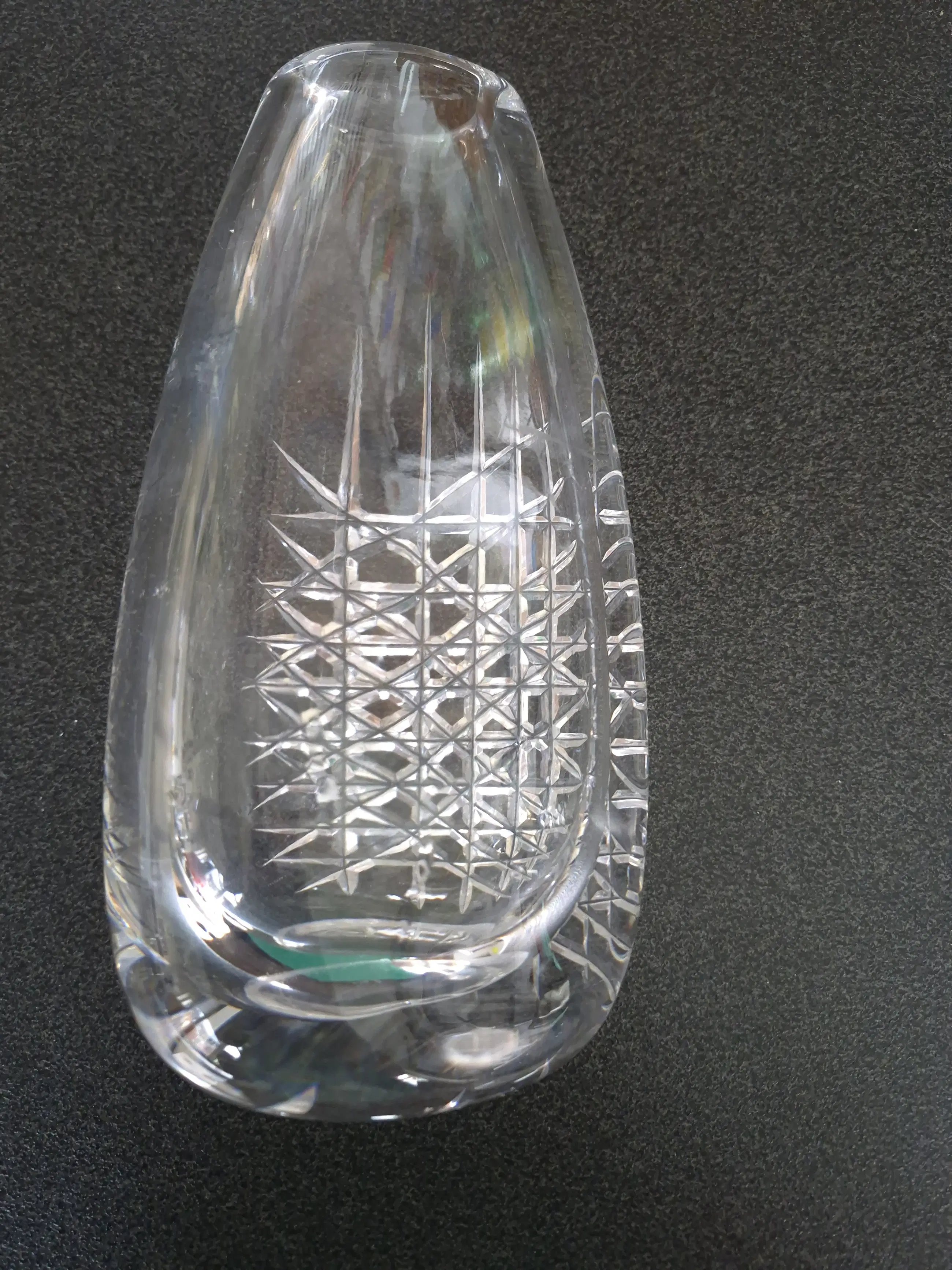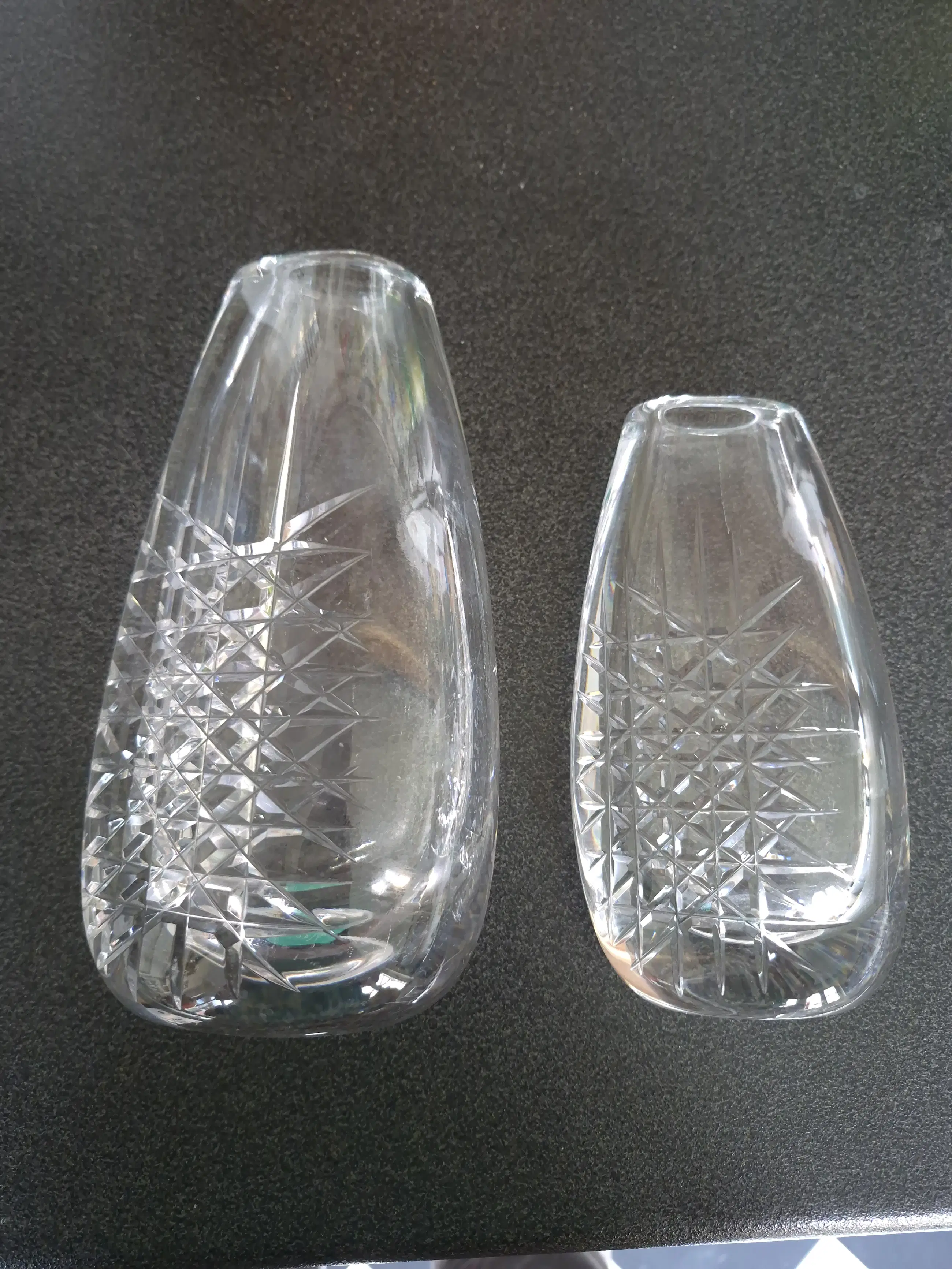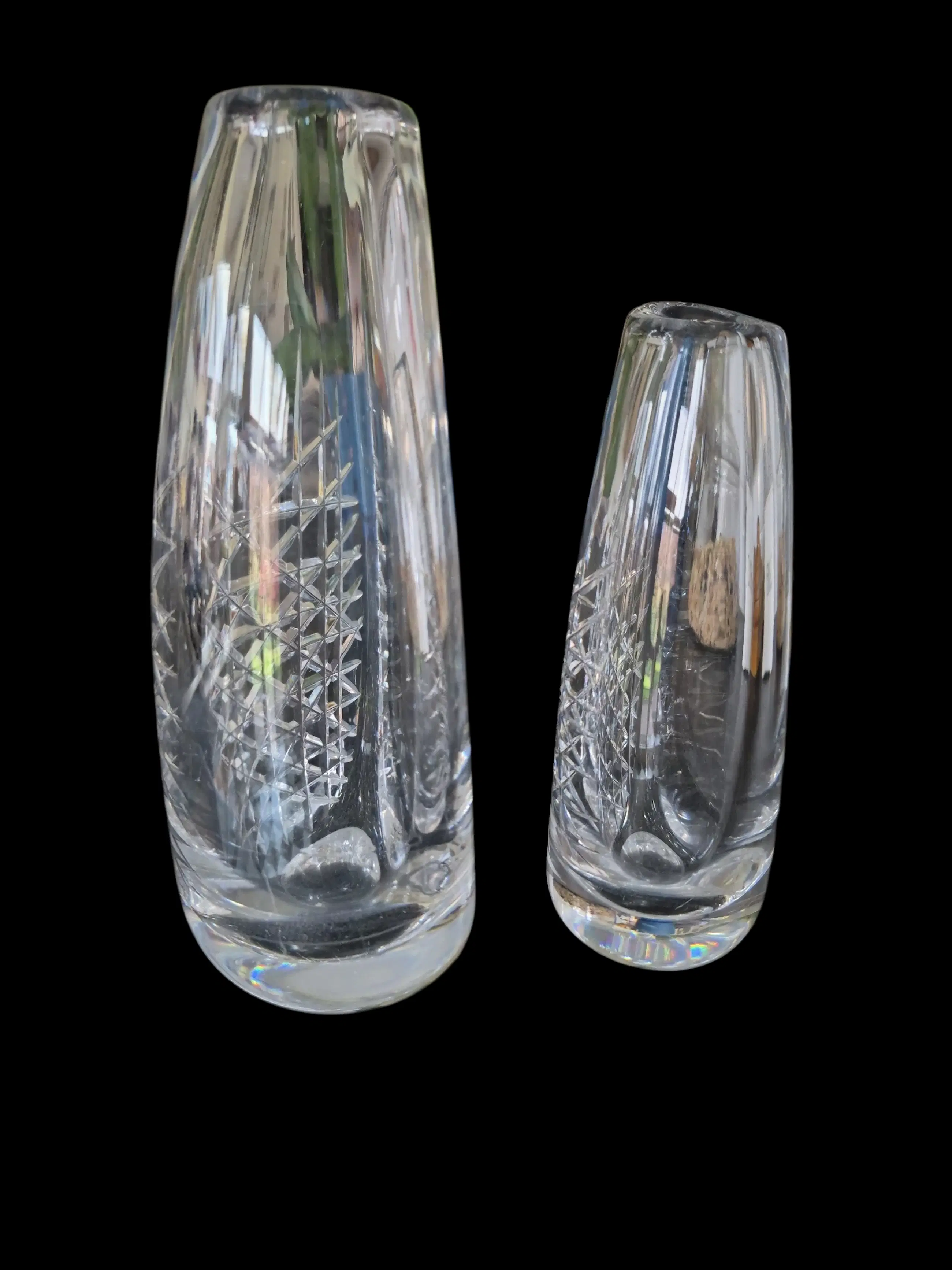 Twee mooie kristallzn vazen van de Zweedse glasfabriek Orrefors. De vazen zijn ontworpen door Ingeborg Lundin. De grootste vaas is 19cm hoog en10 cm breed. Beide vazen zijn gemerktaan de onderzijde Orrefors DA 3658/4