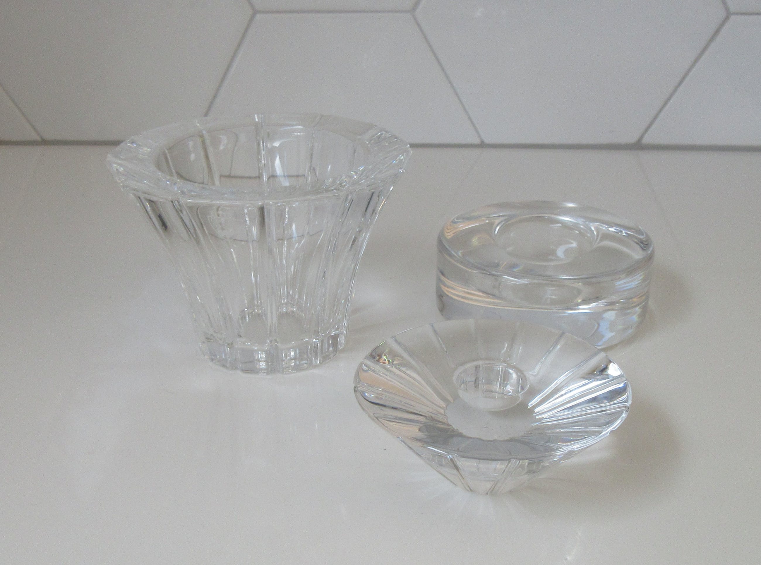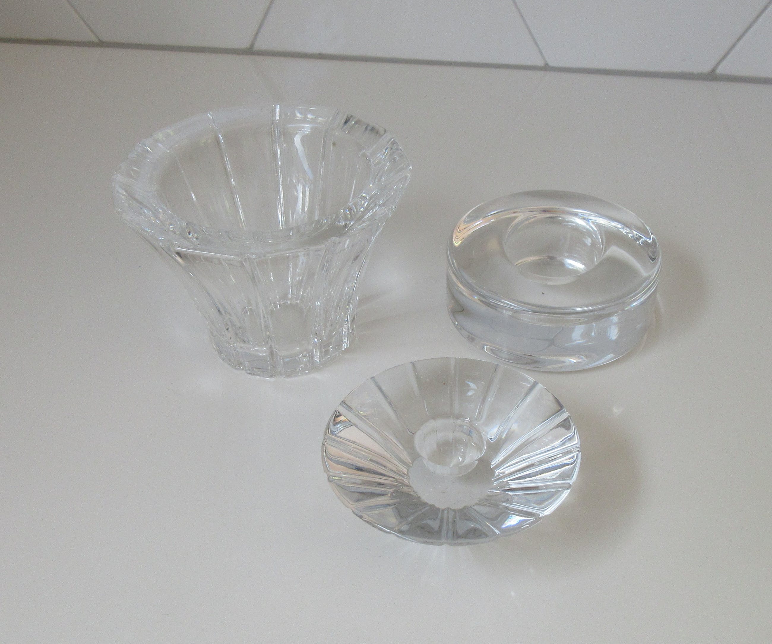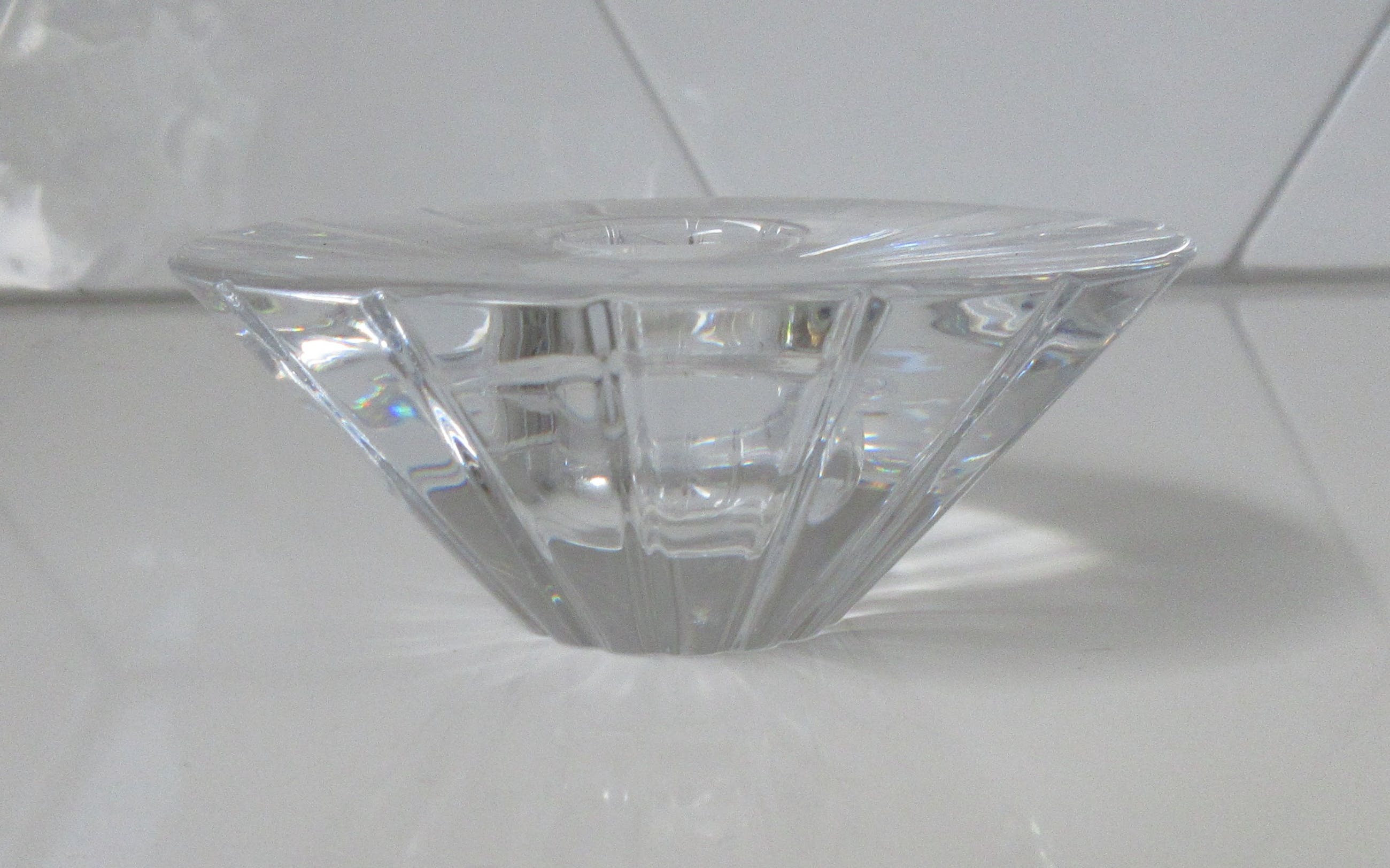 Sloveens geslepen kristallen kandelaar gemerkt met etsmerk op de bodem. Afmetingen; 3,5 cm hoog en 9 cm in diameter. Gewicht; ca. 300 gram.