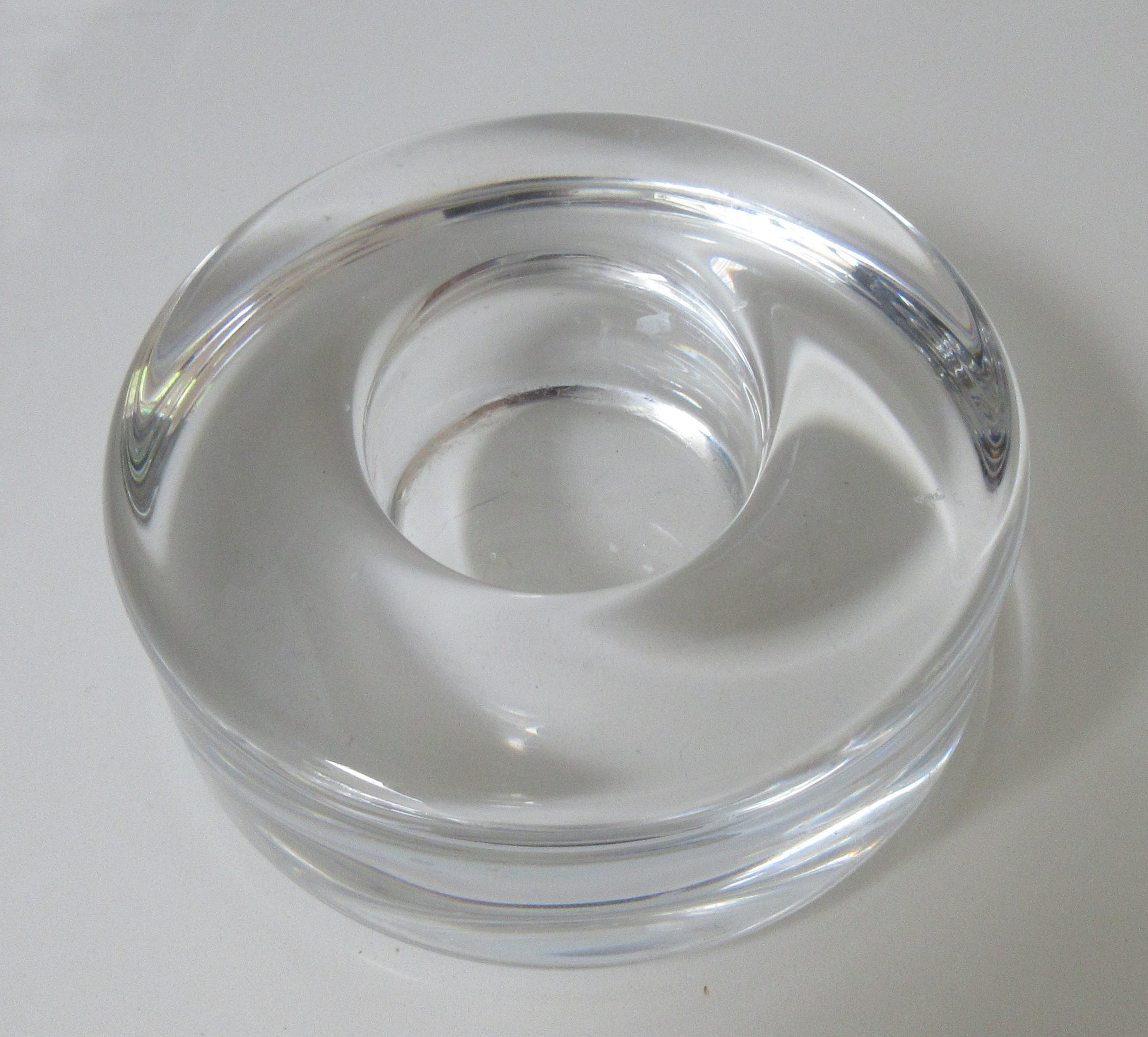 Waxinelichthouder "Puck" ontwerp Lena Bergstrom. In prima conditie voorzien van etsmerk aan de onderzijde. Afmetingen; 3,5 cm hoog en 9,5 cm in diameter. Gewicht; ca. 750 gram
