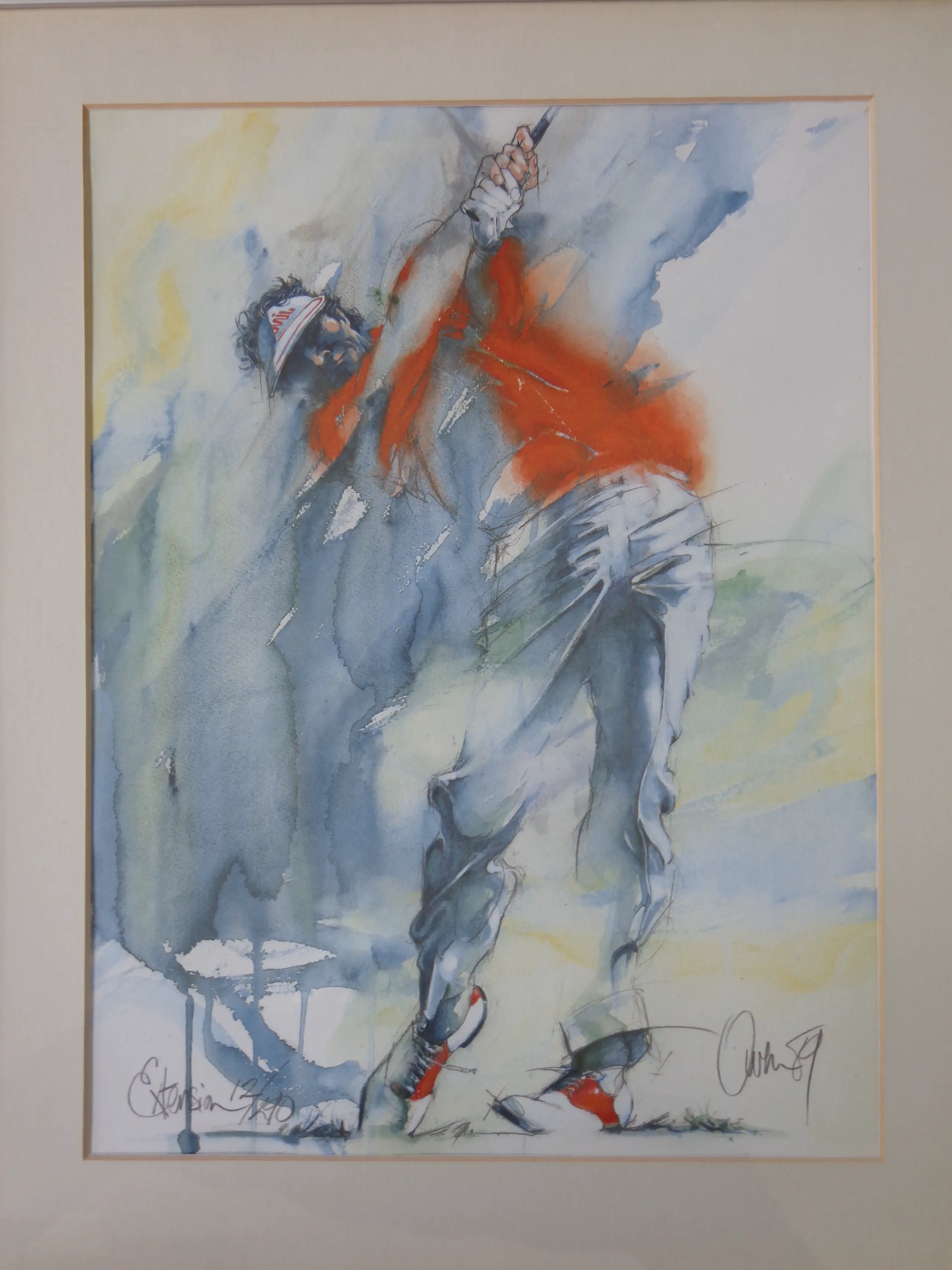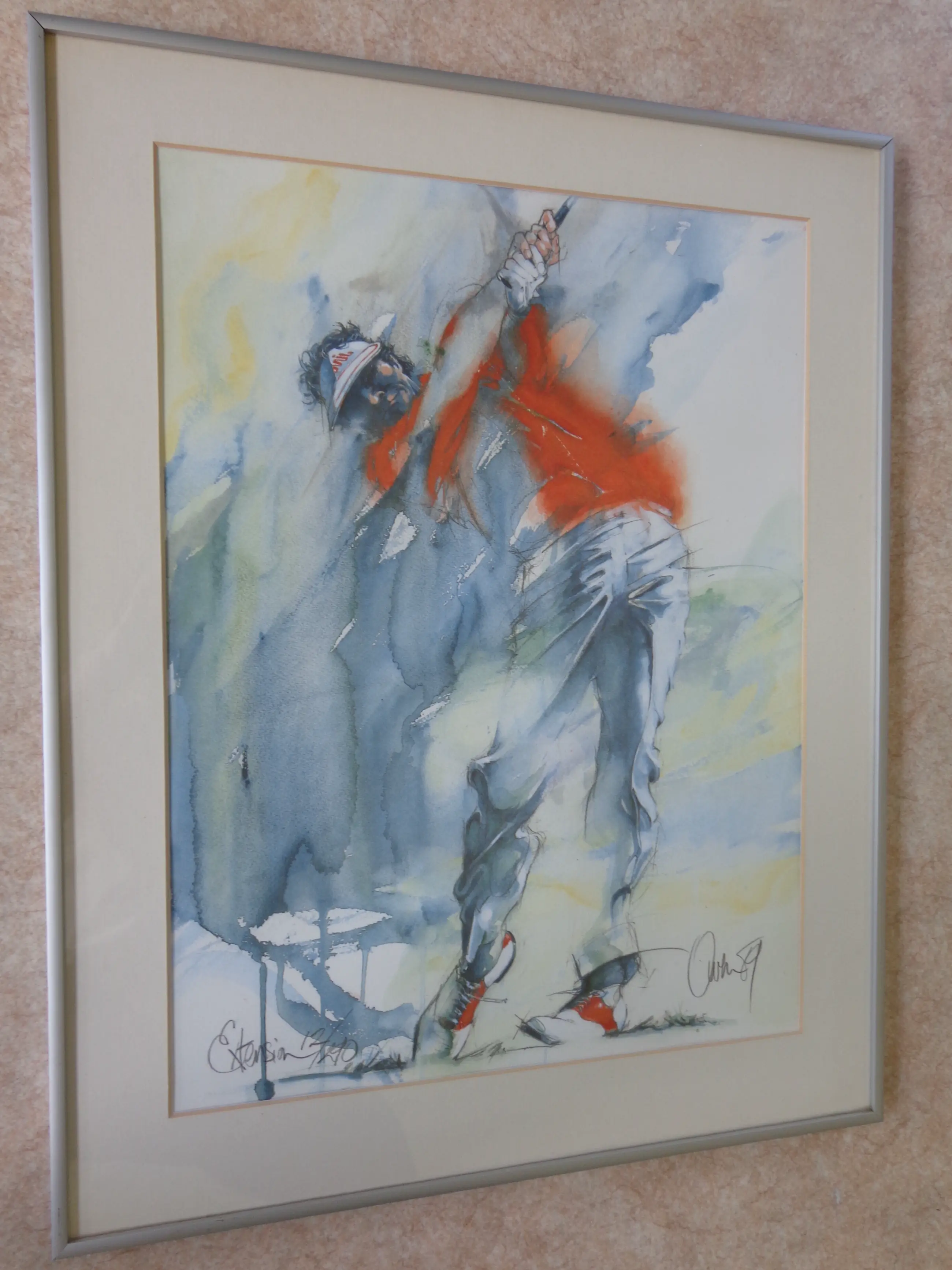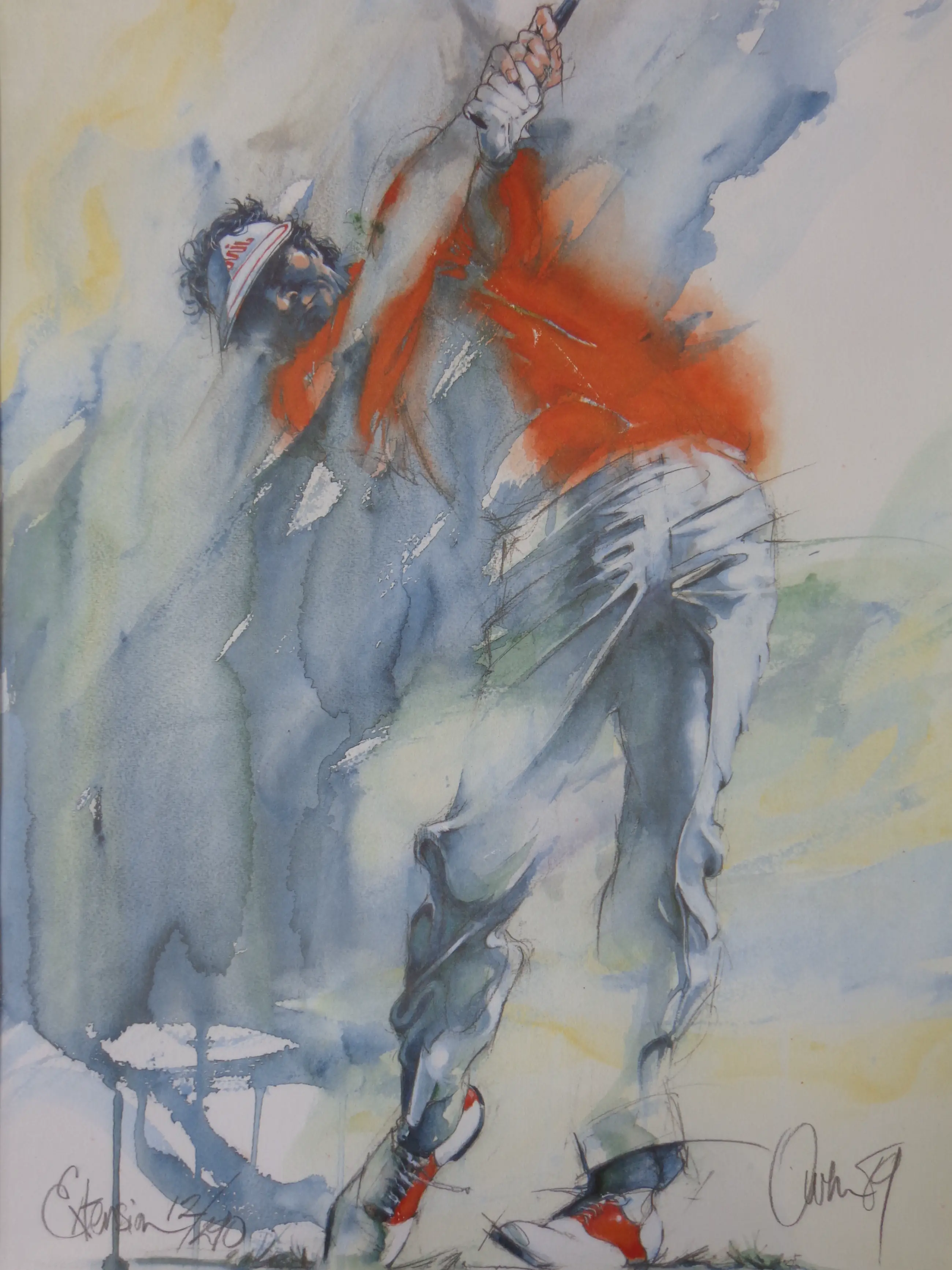 Ortho Owen (1953-1992). Golfspeler. Titel: "Extension". Kleuroffset op papier. Gesigneerd met potlood. Ex.nr. 12/290. 1989. Zeer goed staat. Blad: 58x43cm. Kader: 72x57cm. Mogelijk geschenk voor deelname aan golfwedstrijd.