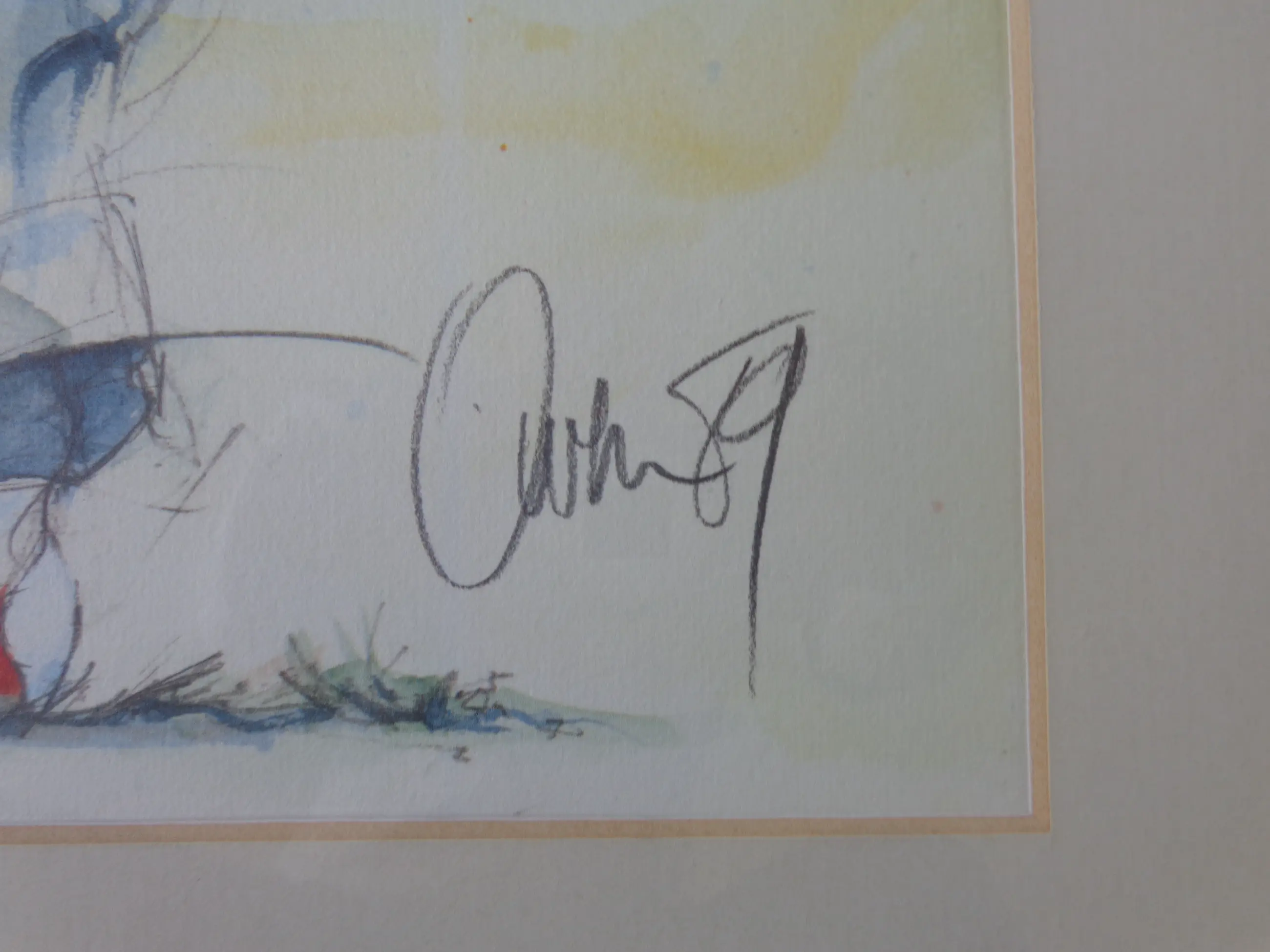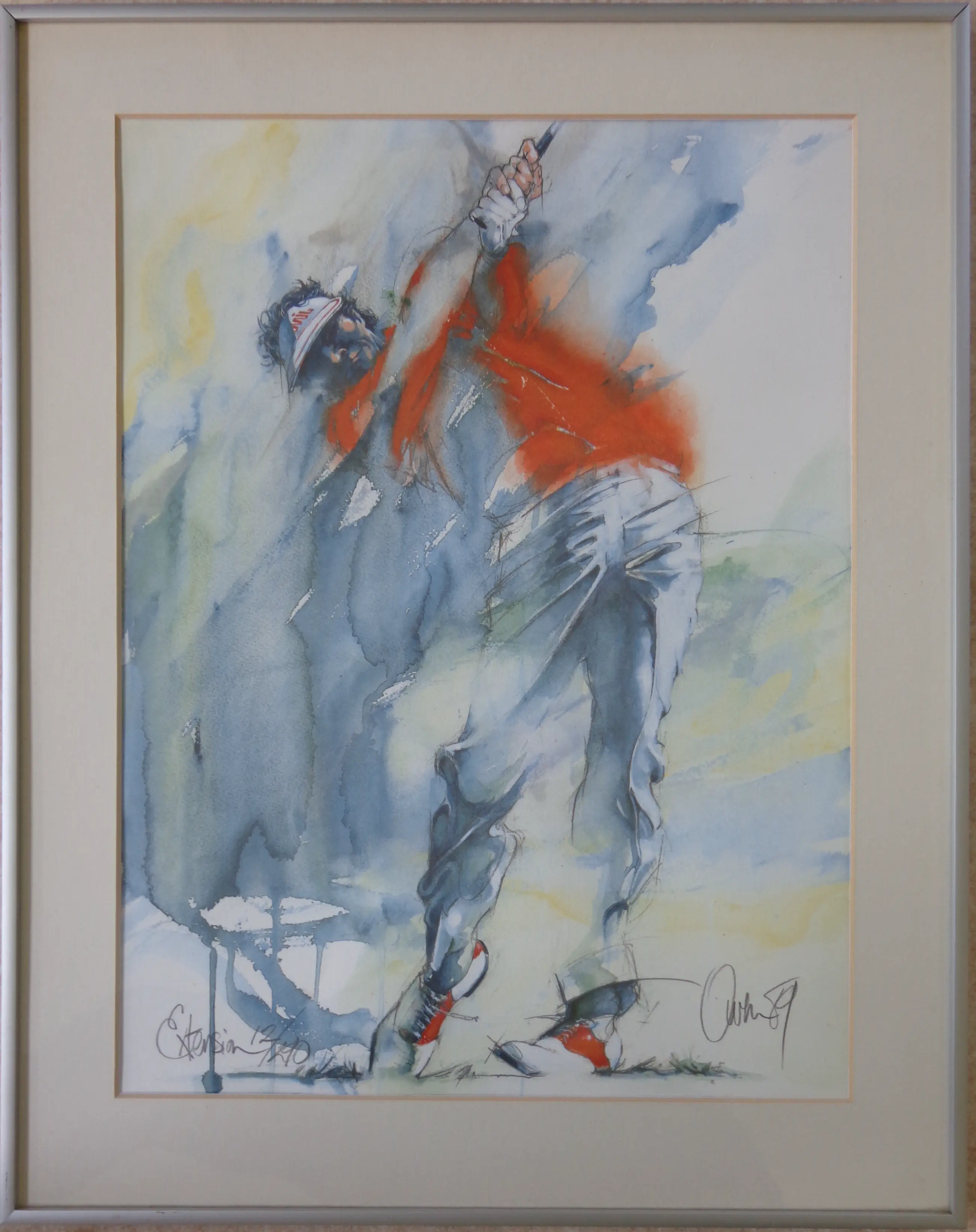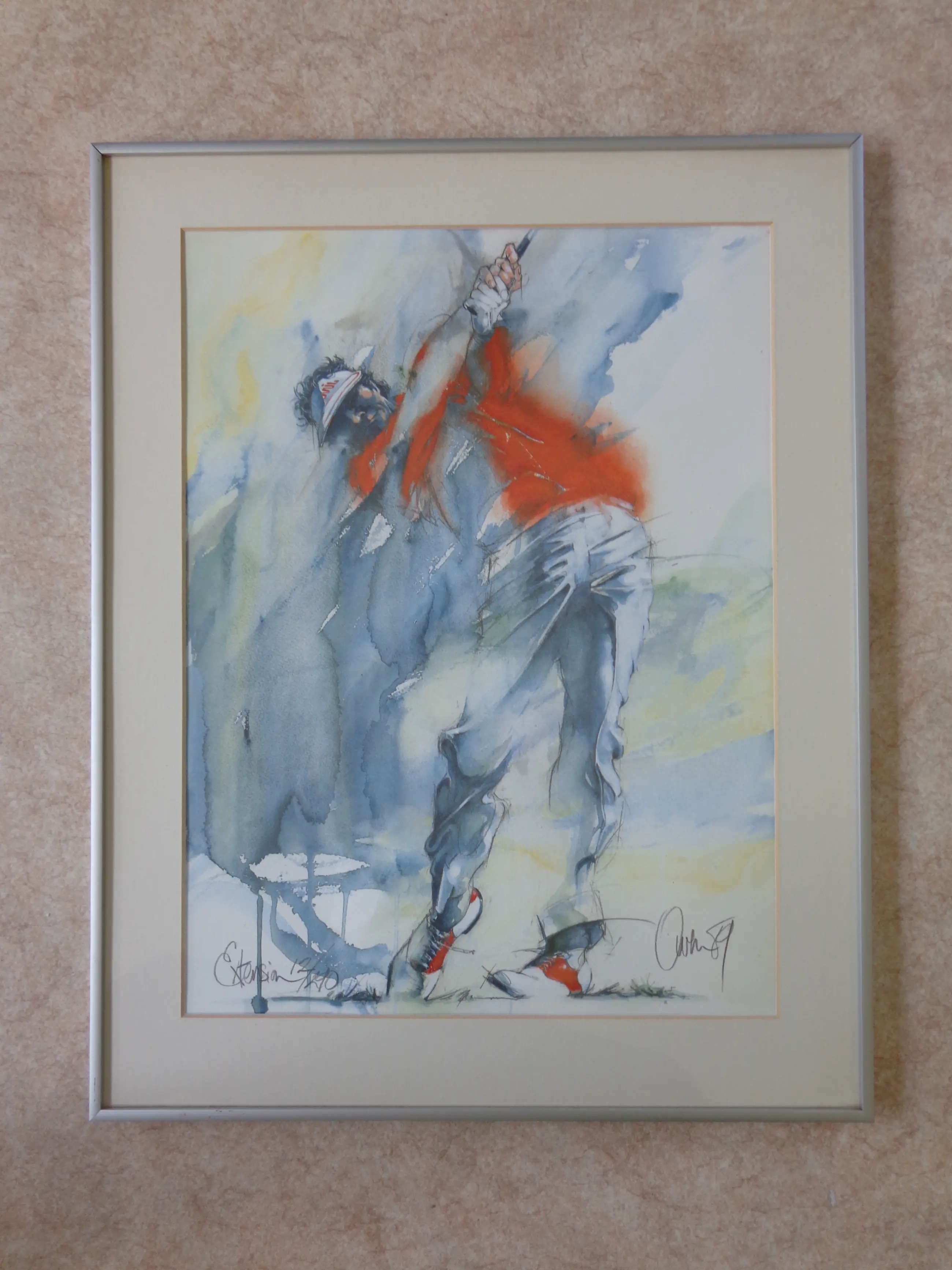 Ortho Owen (1953-1992). Golfspeler. Titel: "Extension". Kleuroffset op papier. Gesigneerd met potlood. Ex.nr. 12/290. 1989. Zeer goed staat. Blad: 58x43cm. Kader: 72x57cm. Mogelijk geschenk voor deelname aan golfwedstrijd.