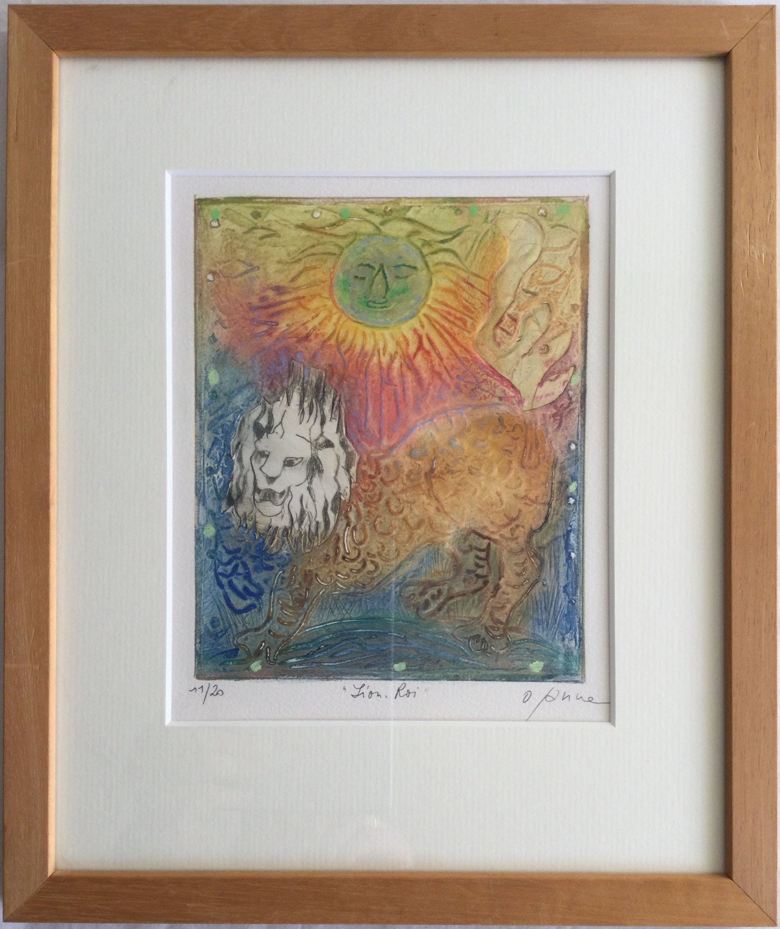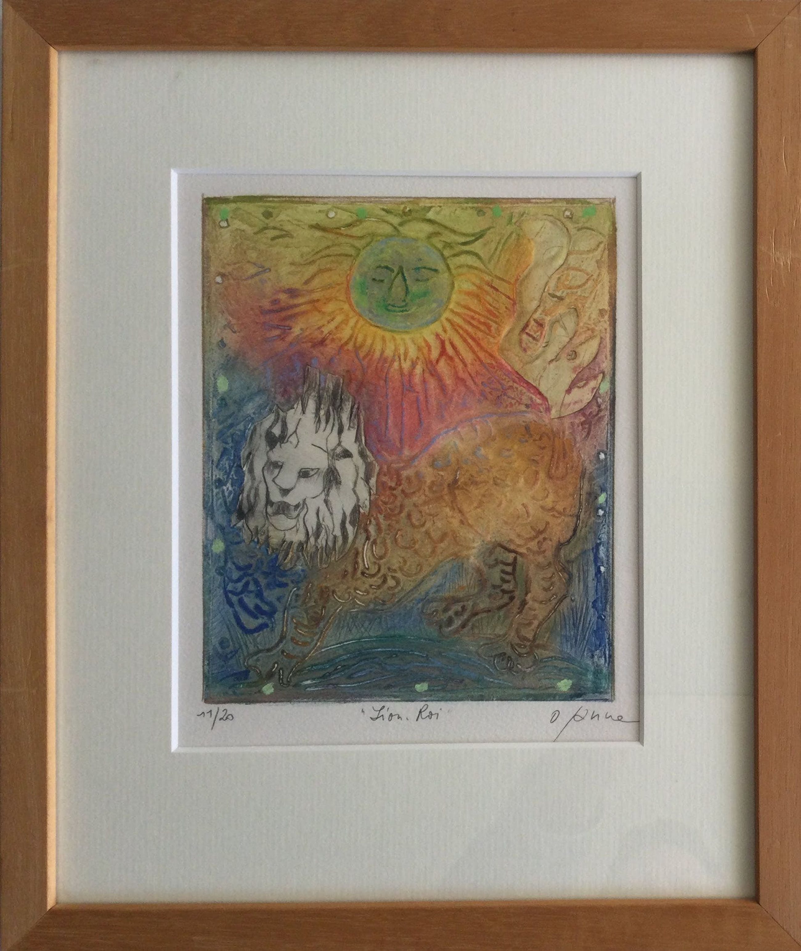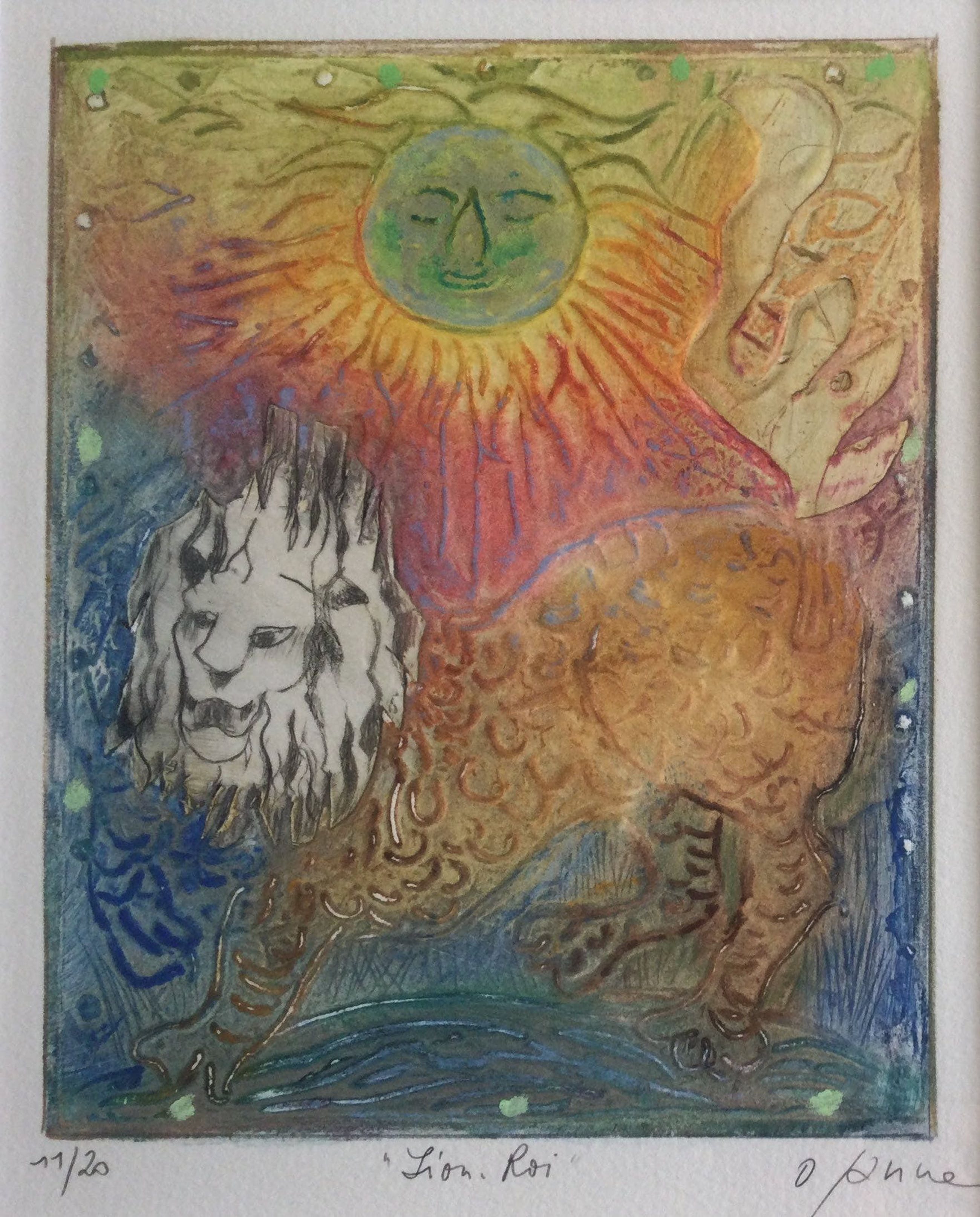 Osanne Négre, born in Joinville-le-Pont on the 18th of December 1934, was a French painter, engraver, and costume designer for the Théâtre Française. Osanne was a student of the National School of Applied Arts and Crafts in Paris from 1947 to 1953, then of the National School of Fine Arts in 1954 and 1955. From 1956 to 1960 she honed her etching and lithography skills with the well-known printmaker Jacques Hallez in Marseille. From there, she spent the next couple of decades linked to the world of theater, creating sets and costumes for television, the Avignon festival, the national drama center of Aix-en-Provence, the Petit Odéon, the Hébertot theater and the Cartoucherie de Vincennes. However, she did not stop making her own artwork, and in 1984, she met the Surrealist Henri Goetz, who introduced Osanne to carborundum engraving, a process that he invented.