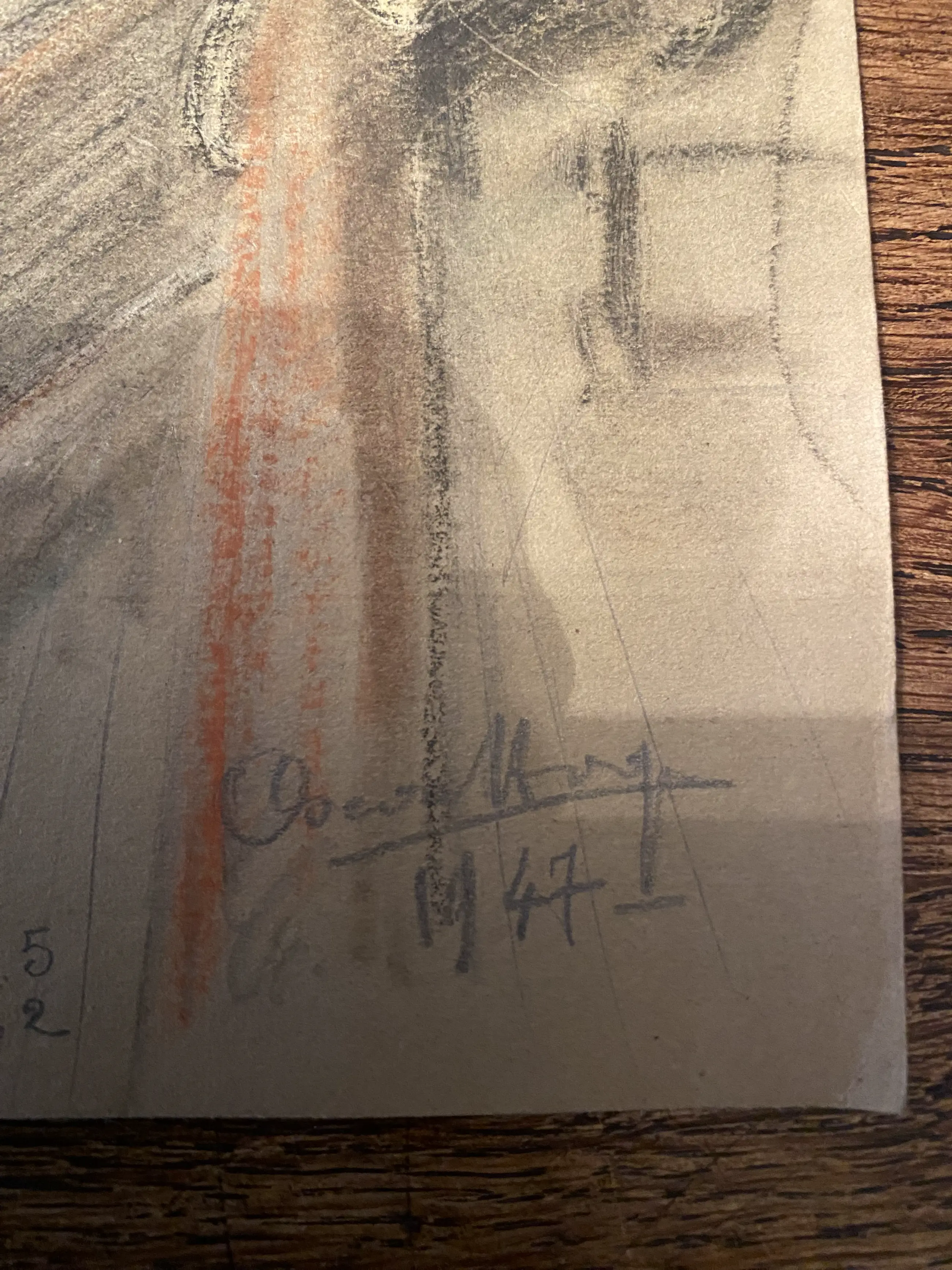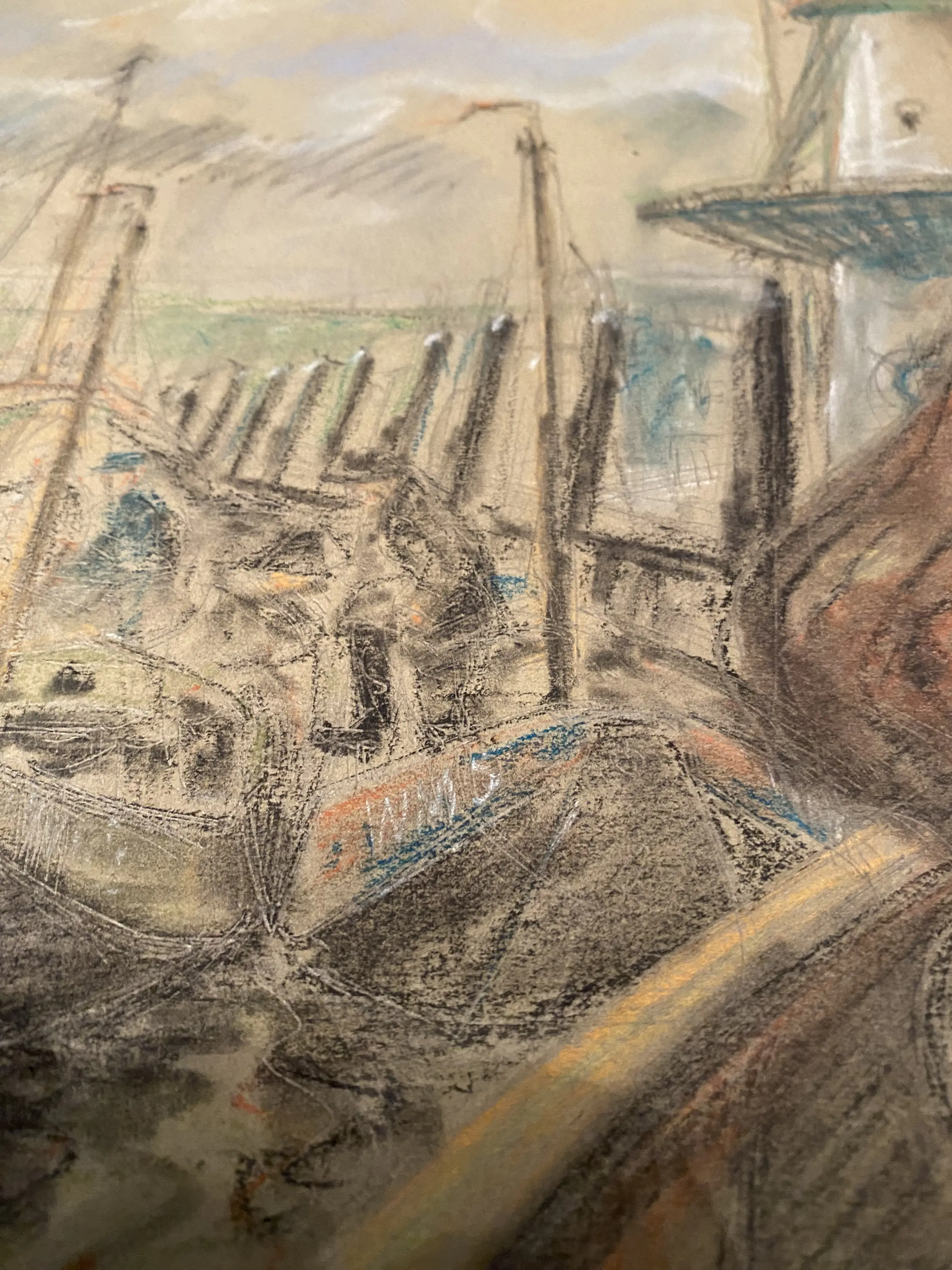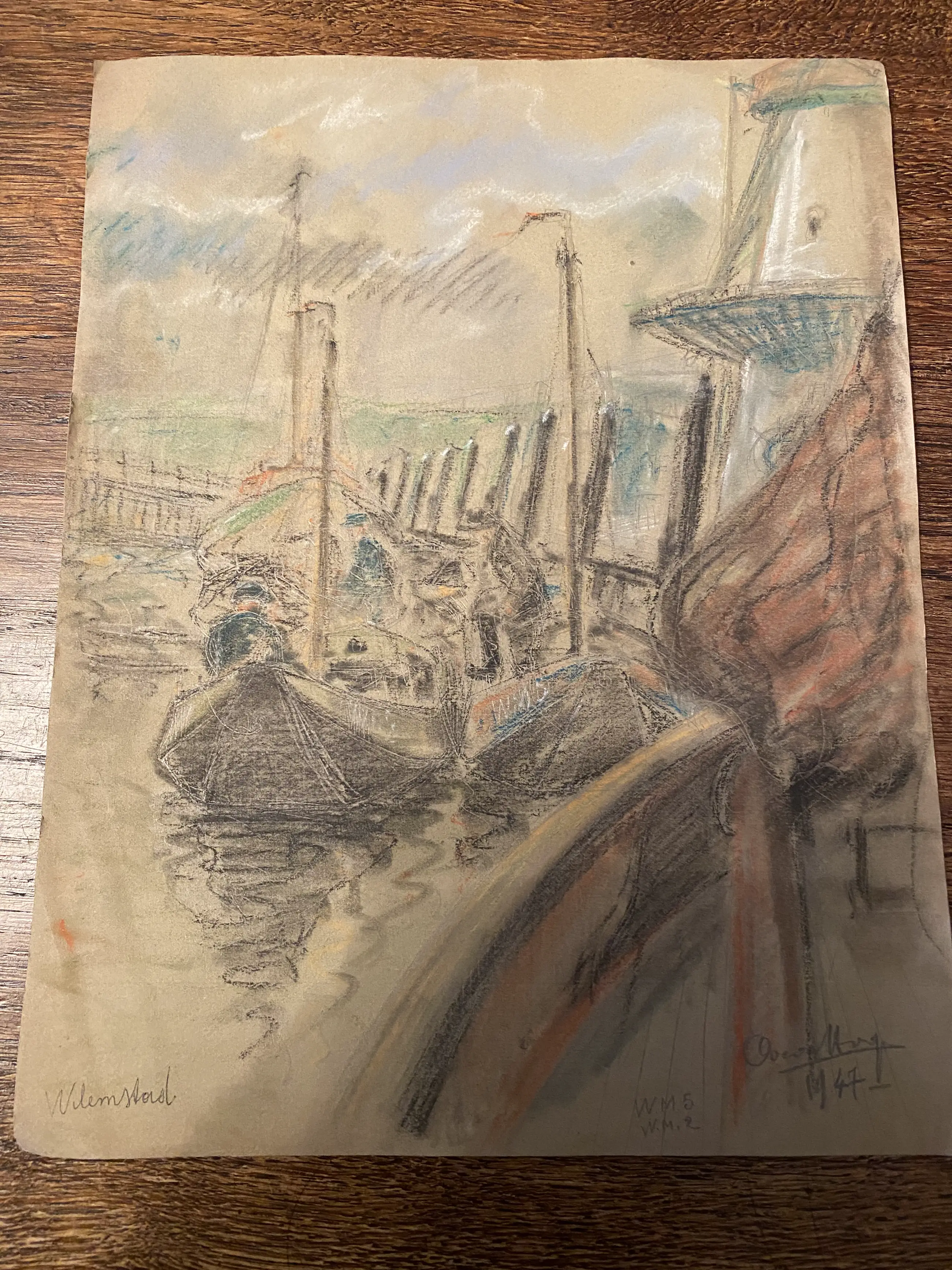 Tekening van een gedeelte van de haven Willemstad met boten WM en WM5, gesigneerd en gedateerd 1947 1 puntje in het blad, zie foto 5