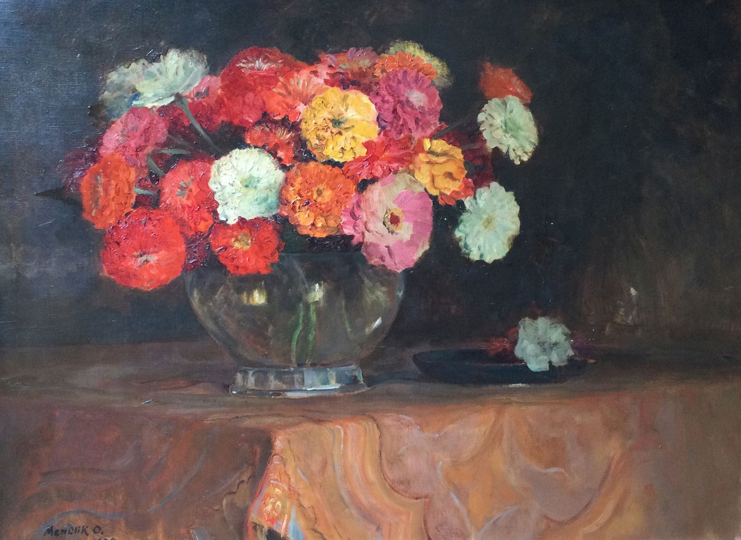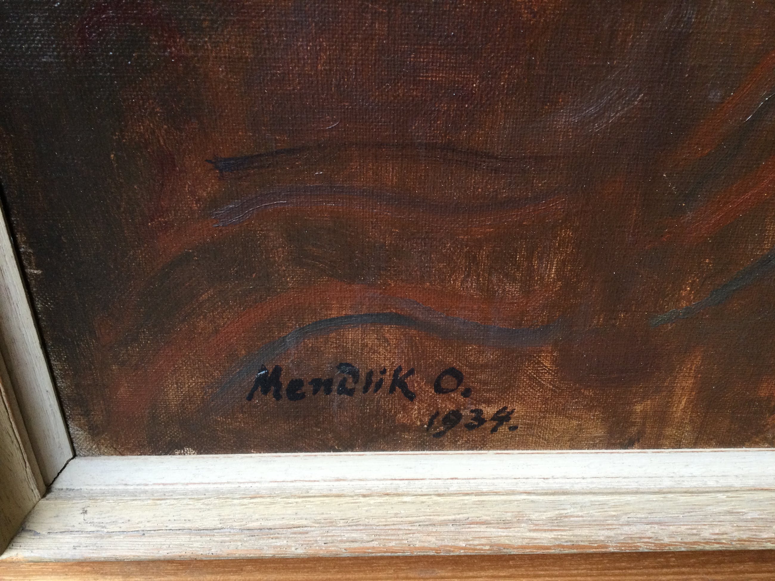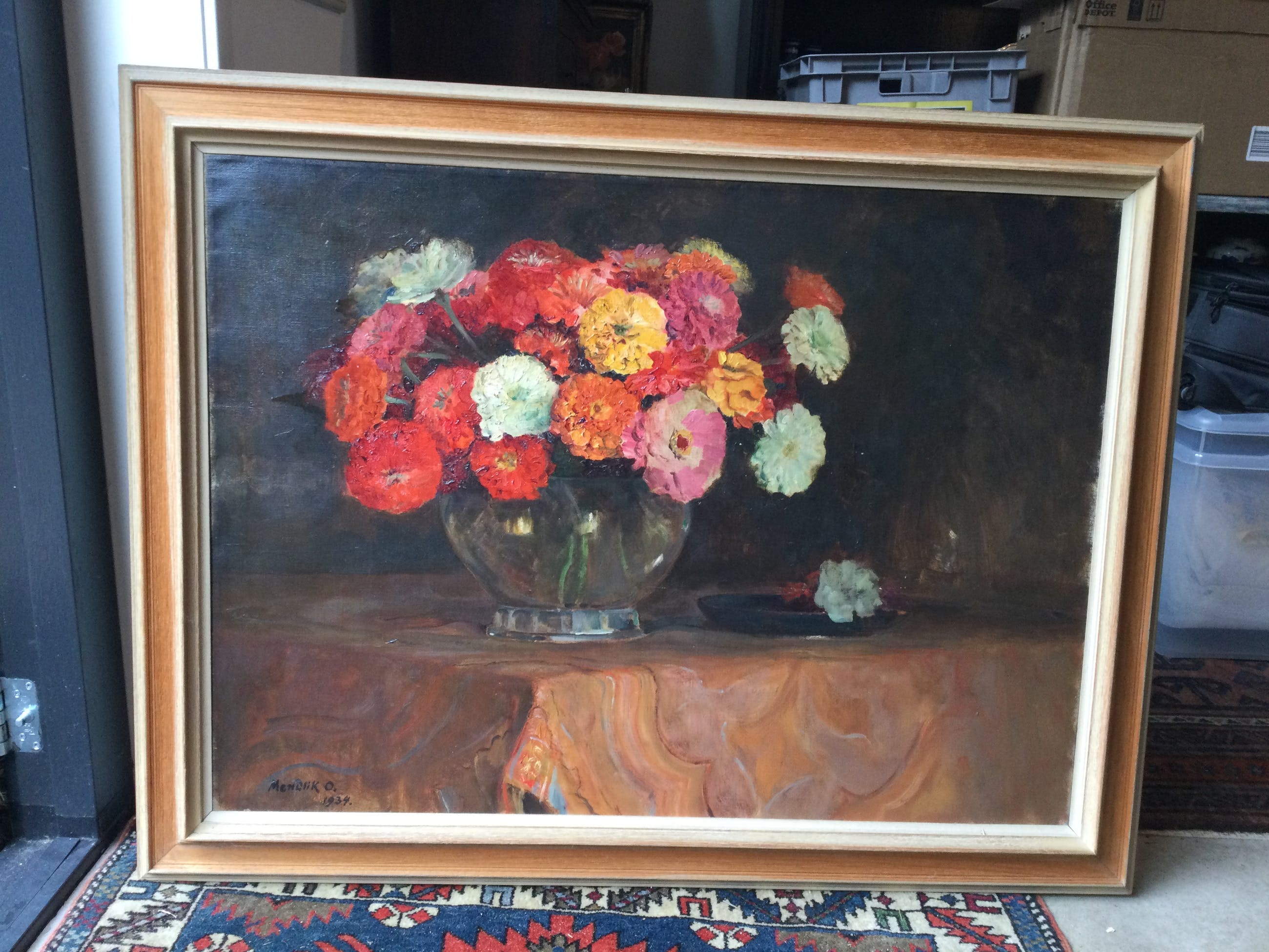 Doek bevat oppervlaktevuil en verkleurde vernis door de tijd, schraal geschilderd langs de randen (door kunstenaar zelf), lijst bevat oppervlaktevuil en slijtschade door de tijd. | |