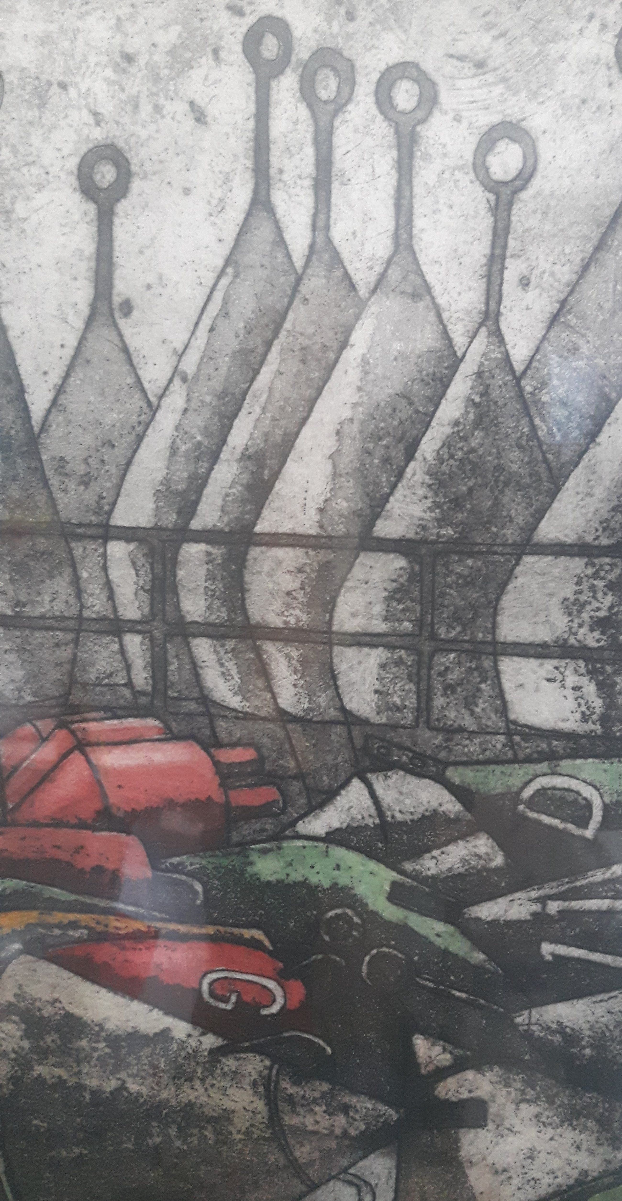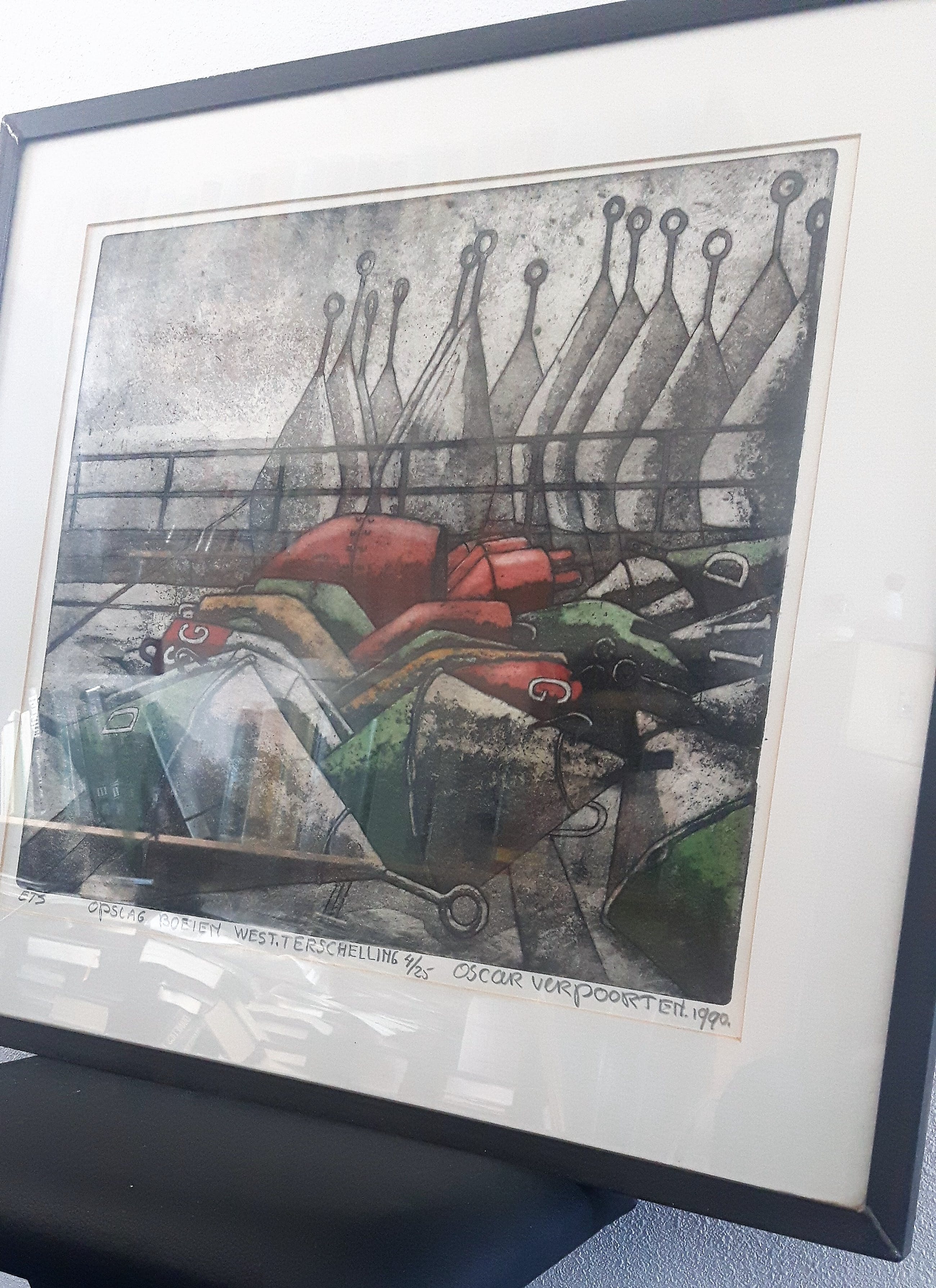 Kleurenets van Oscar Verpoorten in de door hem gemaakte stalen lijst. Het werk zit achter glas. Onder is het werk handgesigneerd met als oplage 4/ 25 met de titel "Opslag boeien West-Terschelling". De foto's zijn wat vertekend door de weerspiegeling van het glas. Oscar Verpoorten werd geboren te Haarlem op 14 september 1952 en overleed in 2003. Hij was de zoon van de kunstenaar Frans Verpoorten. Leerling van zijn vader en verder autodidact als schilder en etser. Lid van de BBK en de Nederlandse Vereniging van Zeeschilders.