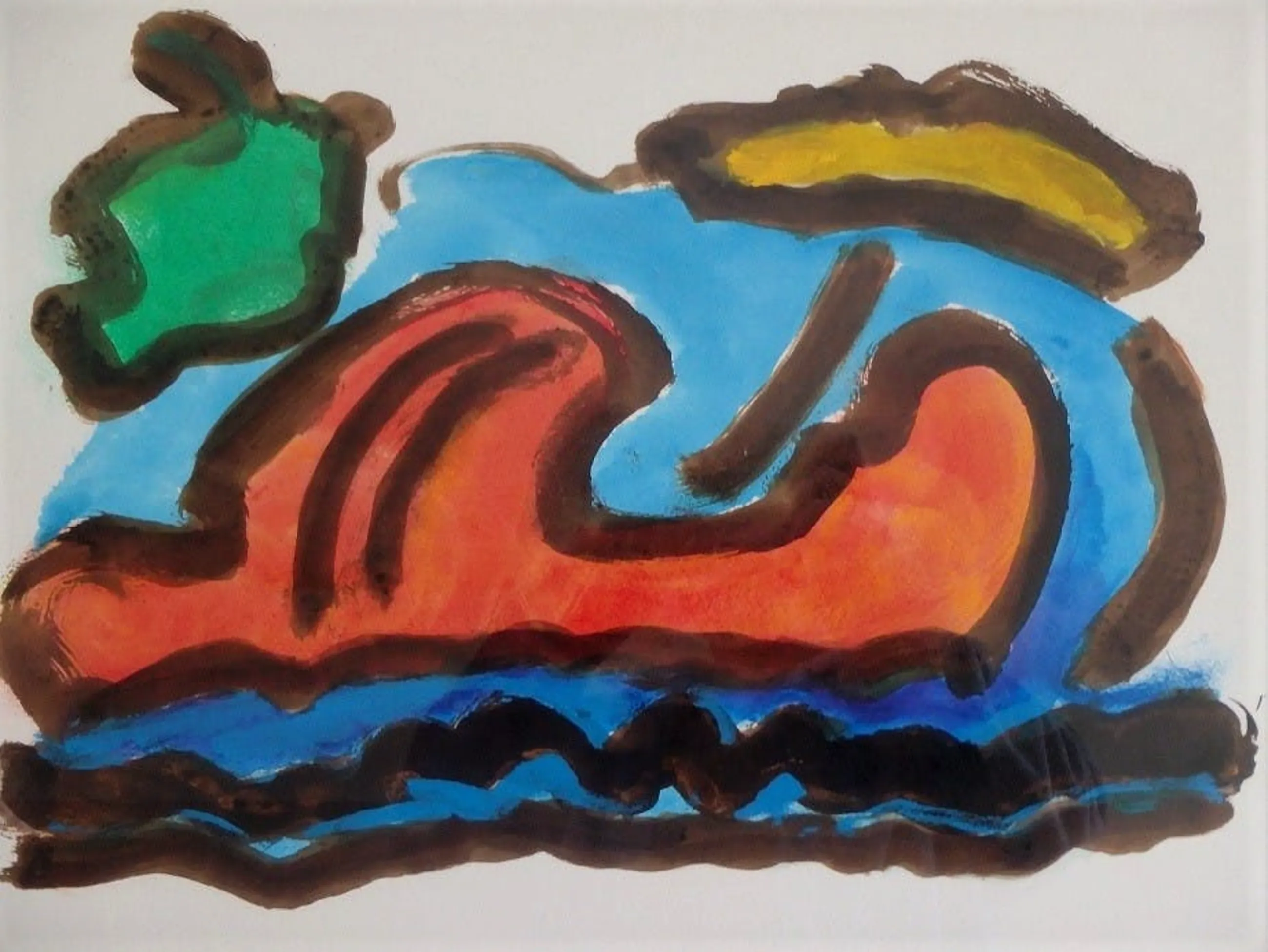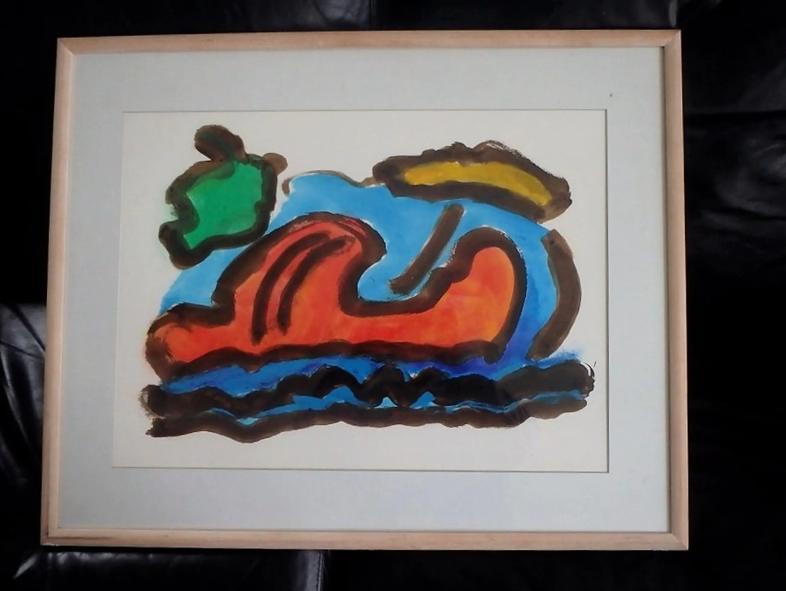 Gouache (dekverf op papier) 44X60, niet gesigneerd, netjes ingelijst in passe-partout en achter glas.