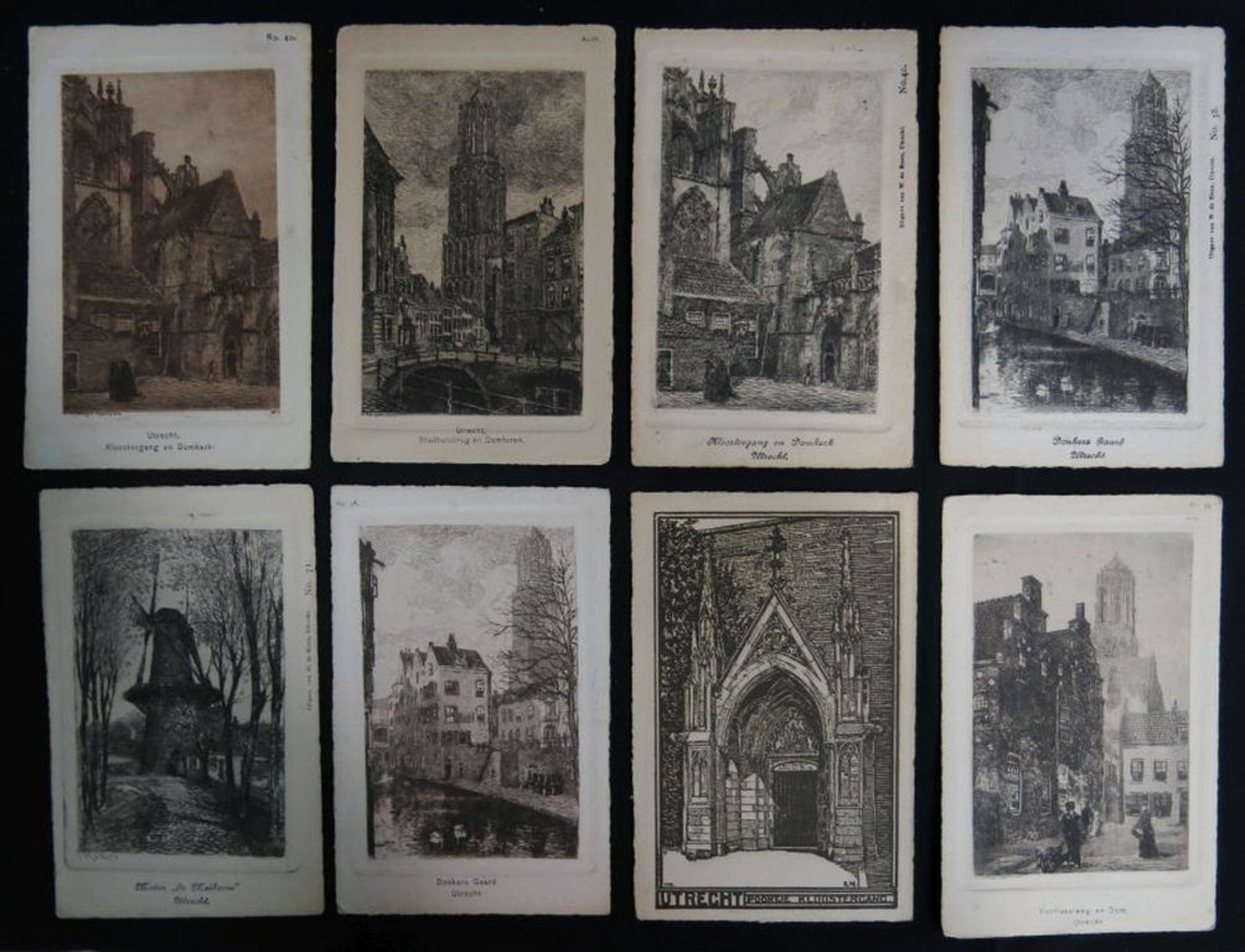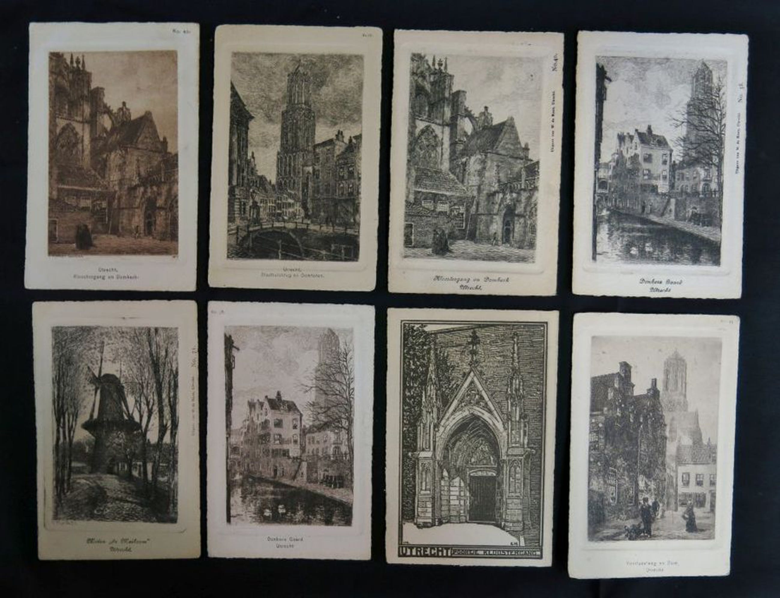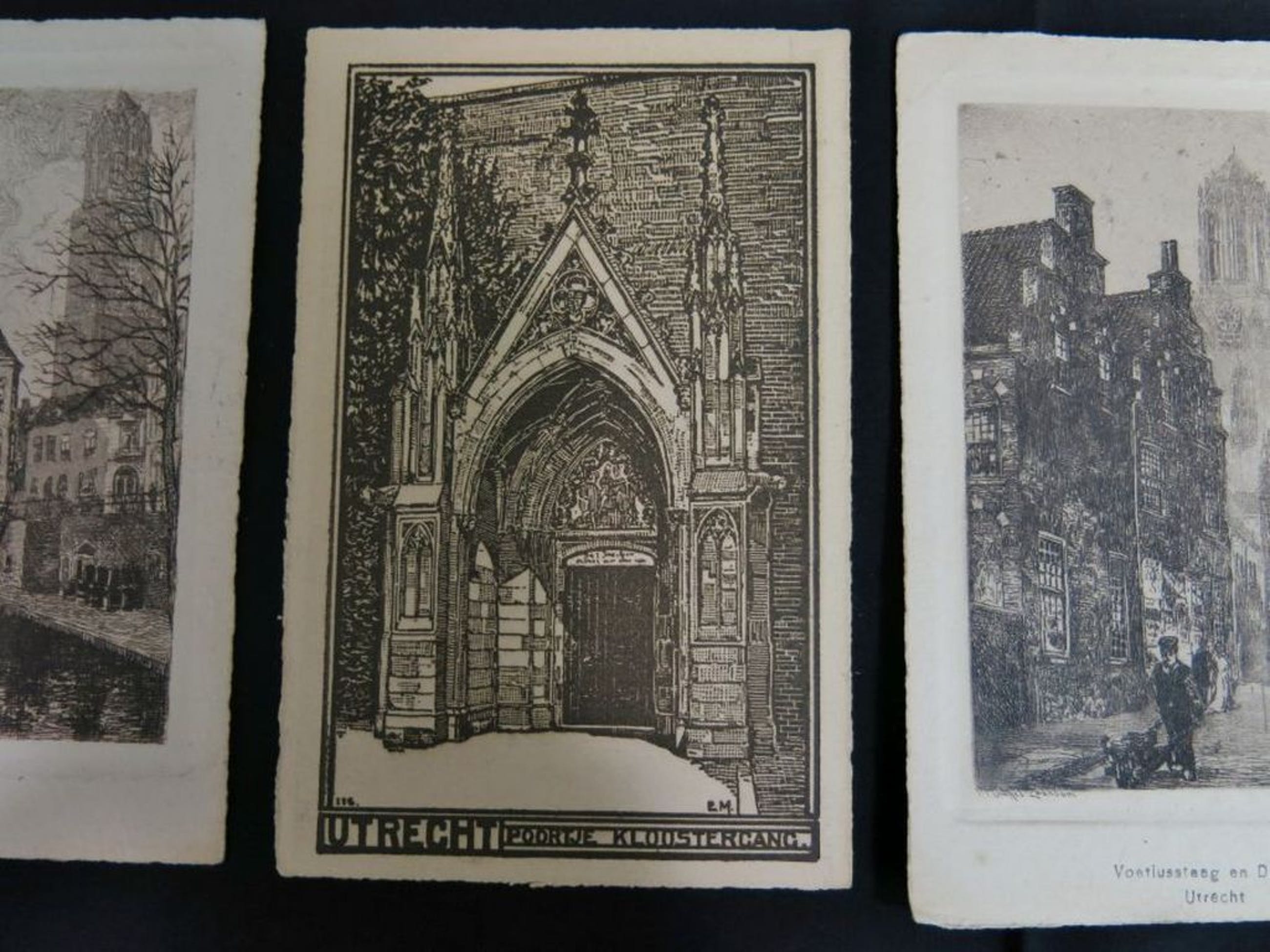 Zeven etsjes op ansichtkaarten van Paul Matthes + een kaartje met monogram E.M. in de druk