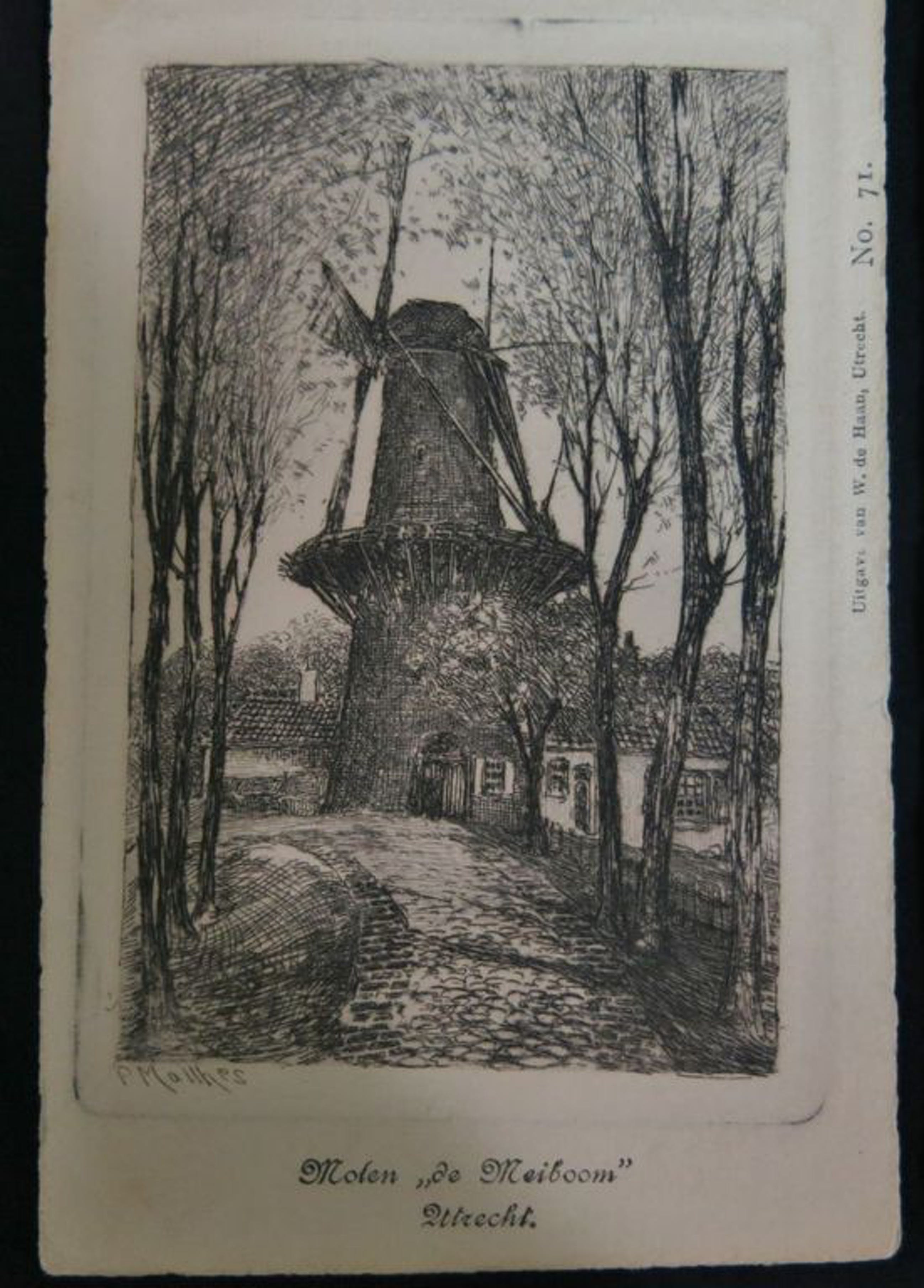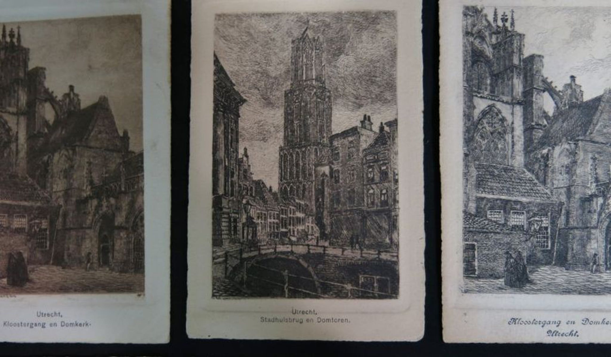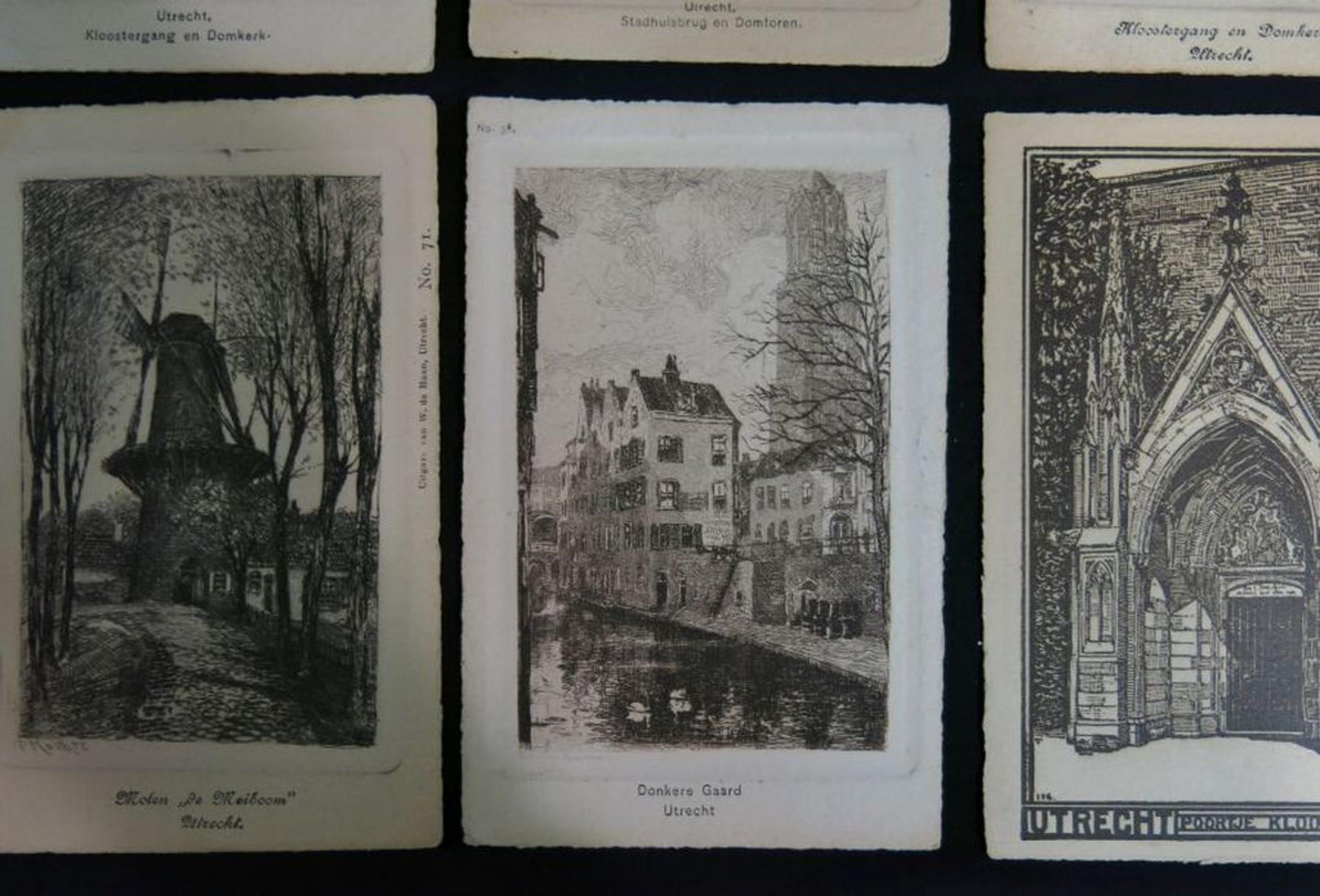Zeven etsjes op ansichtkaarten van Paul Matthes + een kaartje met monogram E.M. in de druk