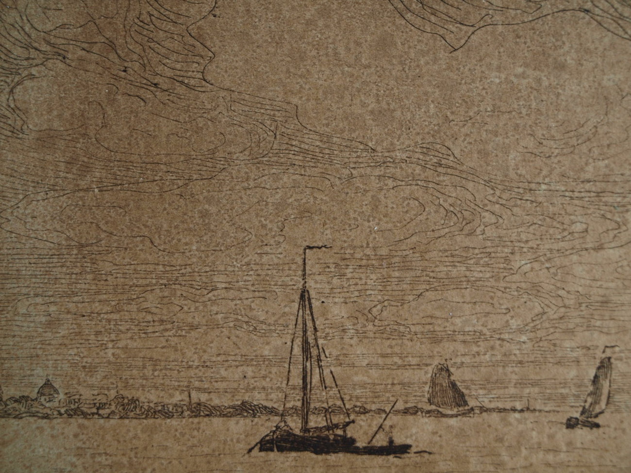 Conditie: Het papier van de ets heeft ‘zuurvlekken’. Het passe-partout heeft vlekjes.