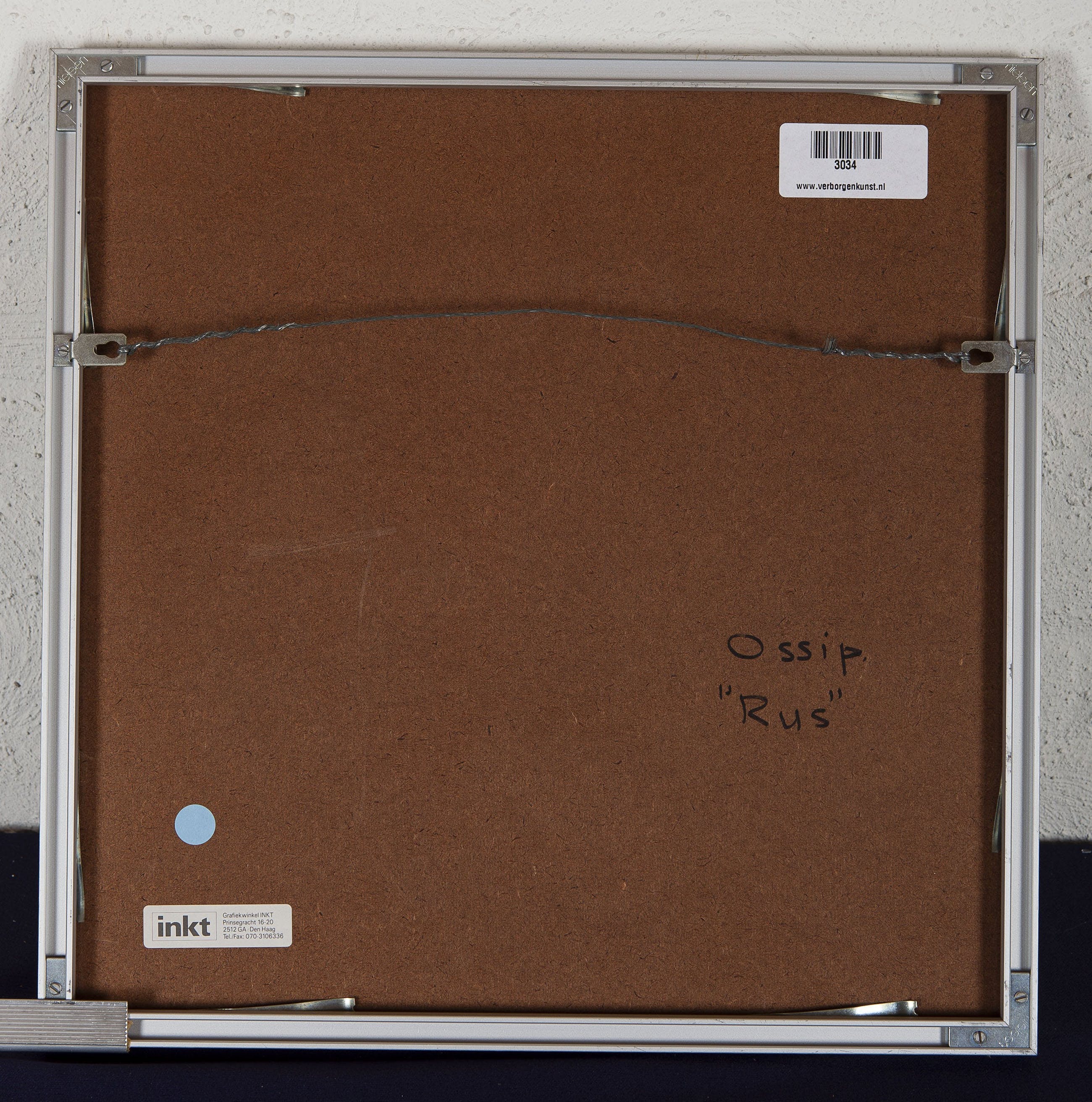 | De lijst is licht beschadigd. Aan de achterzijde van de lijst is een metalen titelkaartje in de hoek rechtsonder bevestigd. | |