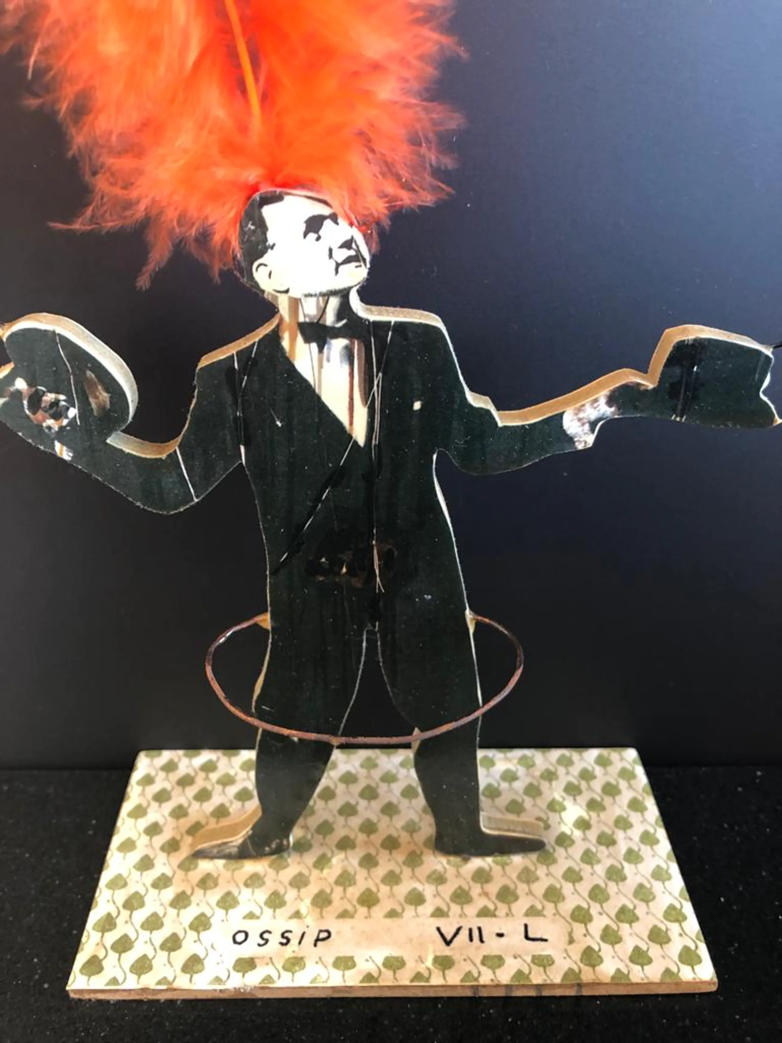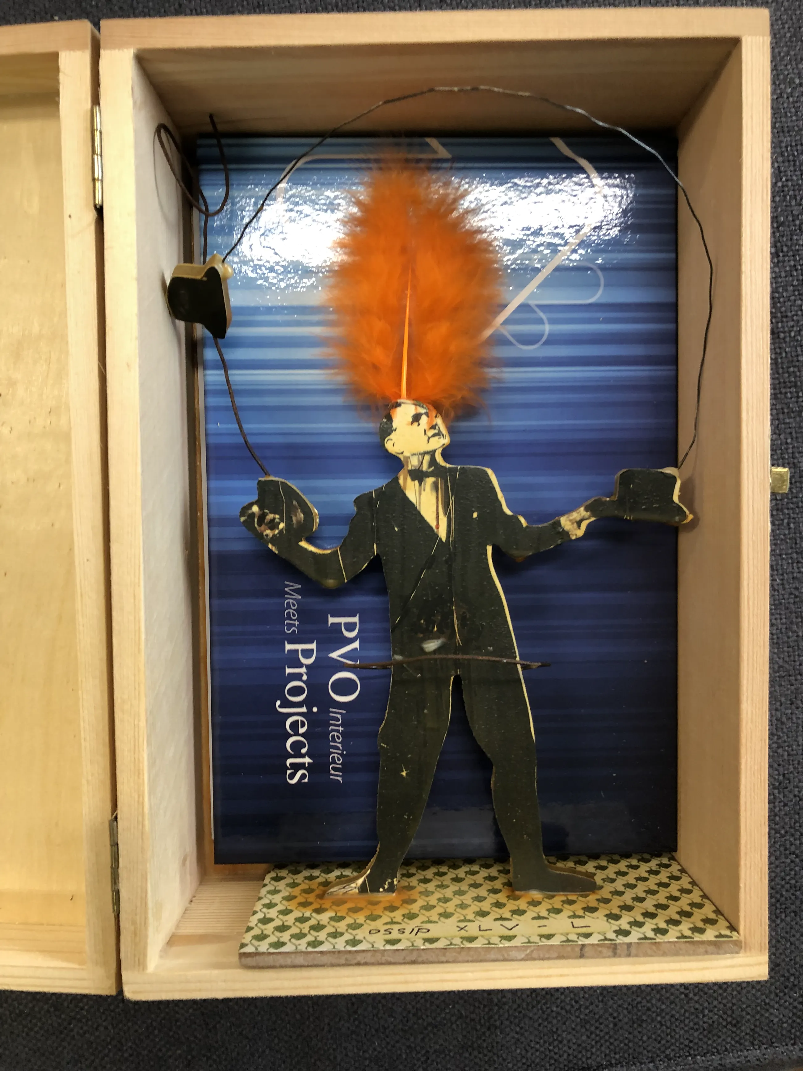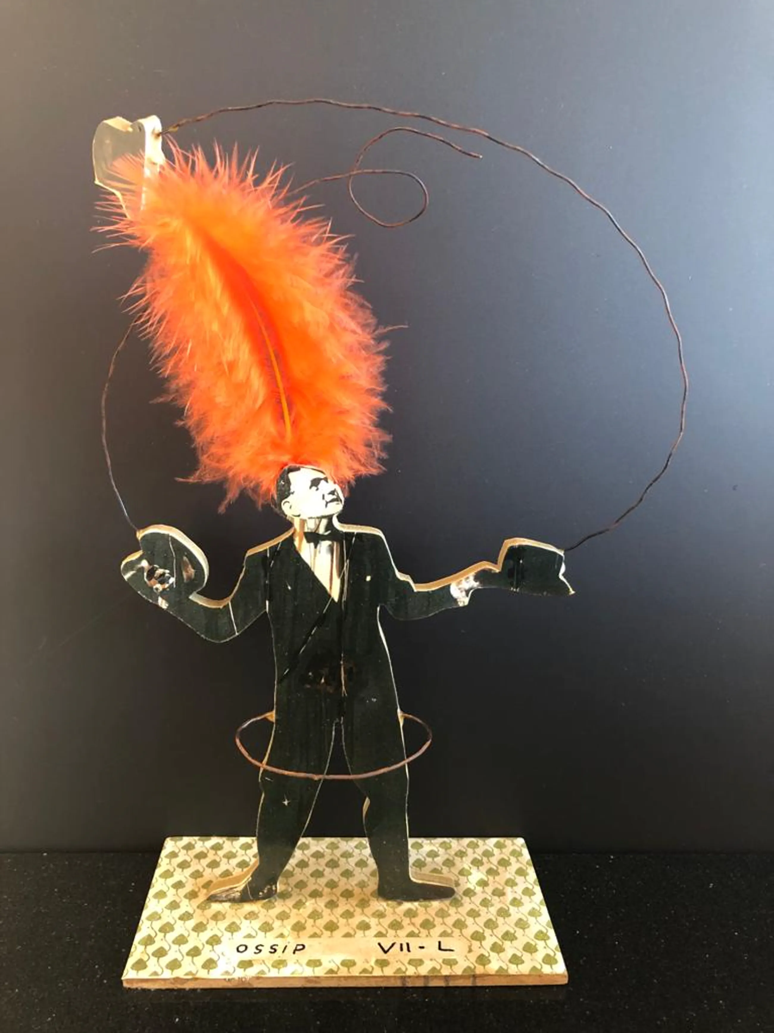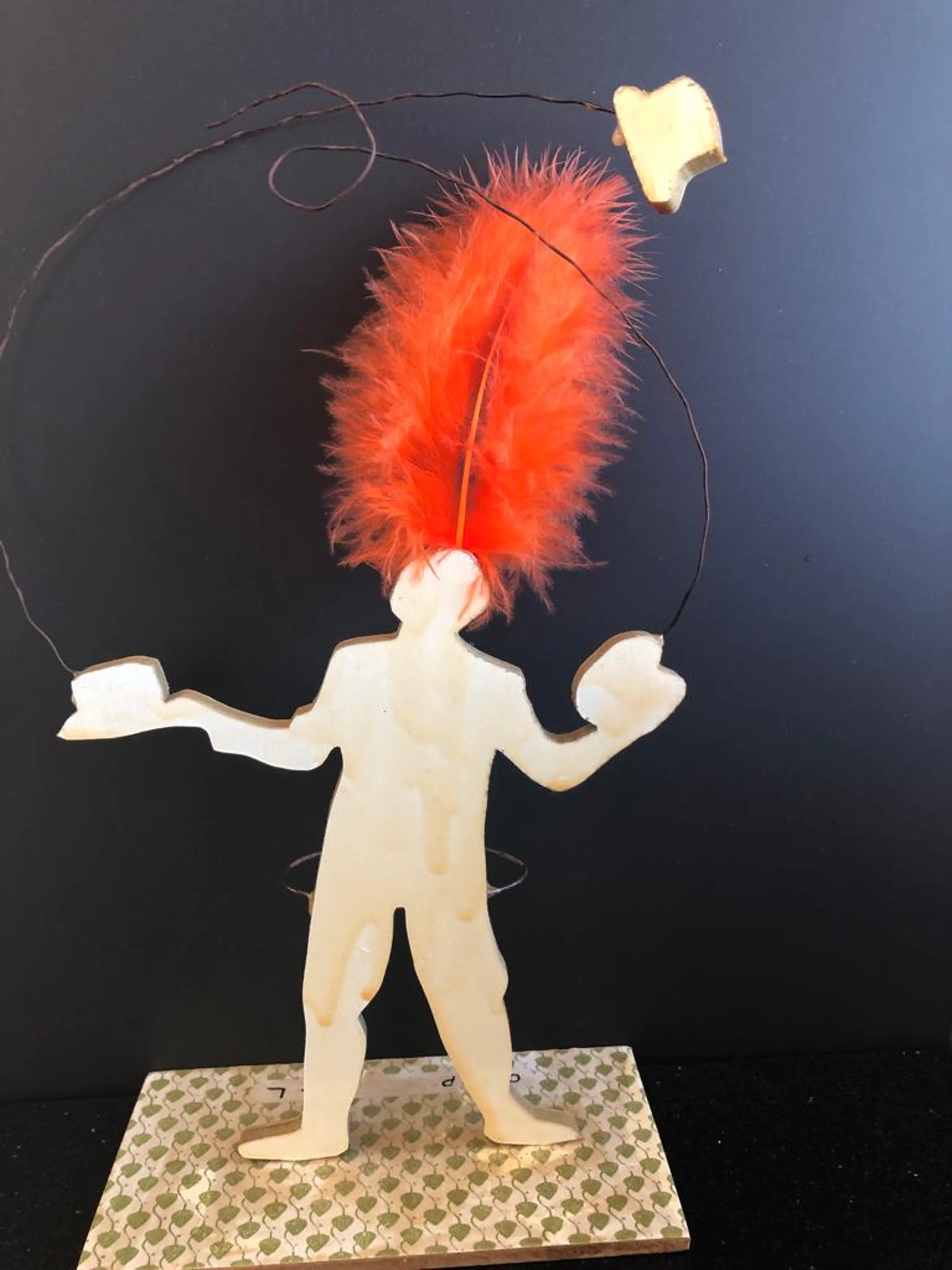 Ossip Haagse kunstenaar die bewegende en 3D kunstwerken maakt. Al in vele kunstcollecties opgenomen. Dit is een vrolijk mannetje met gekleurde veer. Oplage werk maar zijn alle met de hand gemaakt dus toch ook unica eigenlijk.