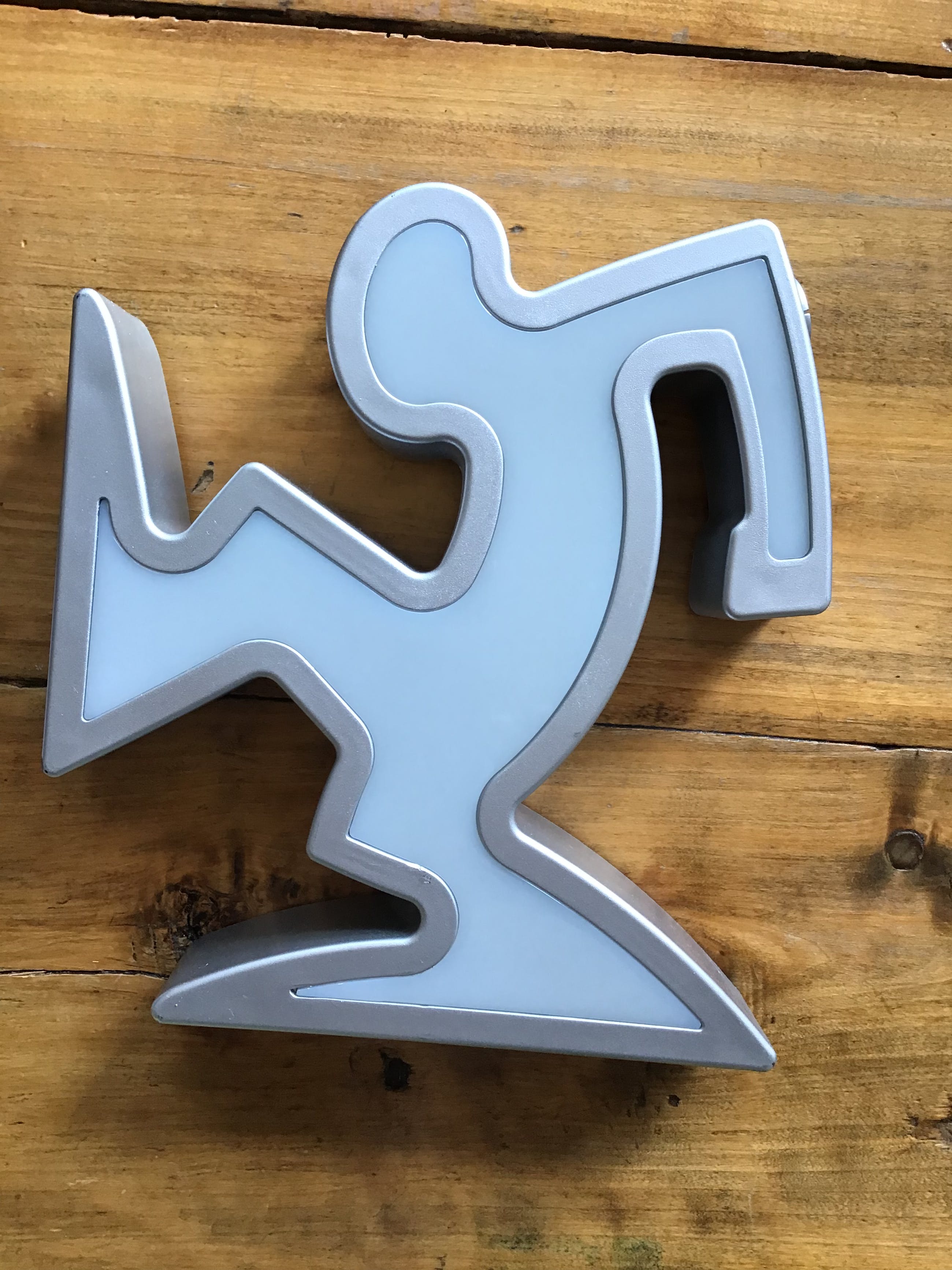 Bijzondere sixties lamp naar cartoons van Osvaldo Cavandoli en la LineaAfmetingen 20x22cmConditie goedDe lamp werkt op batterijen (bijgeleverd), maar kan ook op adapter.Het is af toestellen door de Color Change knop naar gewenste kleur die wisselt.Door de “Hold Color” knop kan de kleur blijven.De lamp kan staan, maar ook worden gehangen.Wordt aangetekend verstuurd