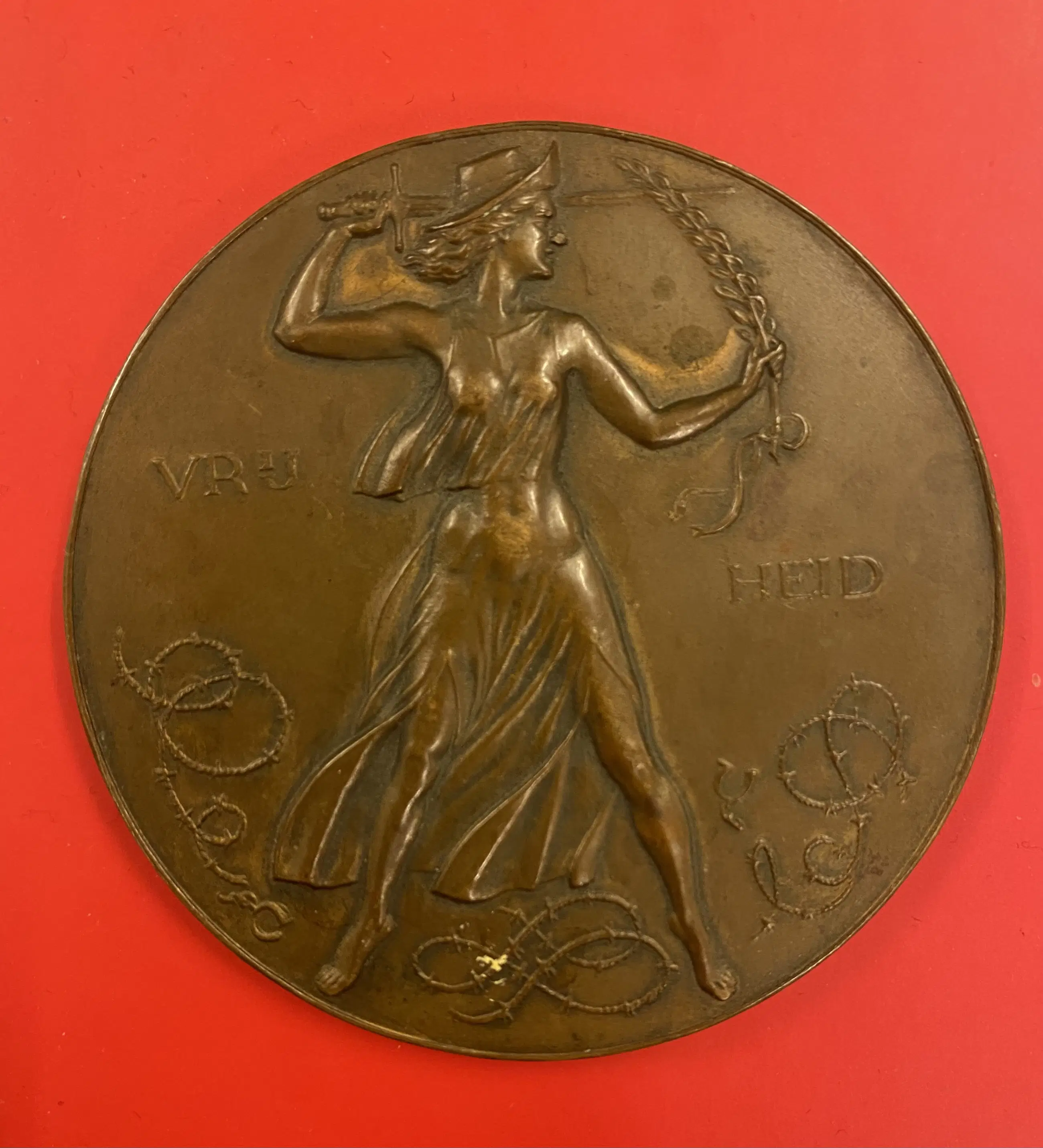 Recto : Een allegorische voorstelling van de vrijheid in de vorm van een maagd met een hoed op en in de handen een zwaard en een palmtak, staand tussen verbroken ketenen en stukken krullend prikkeldraad