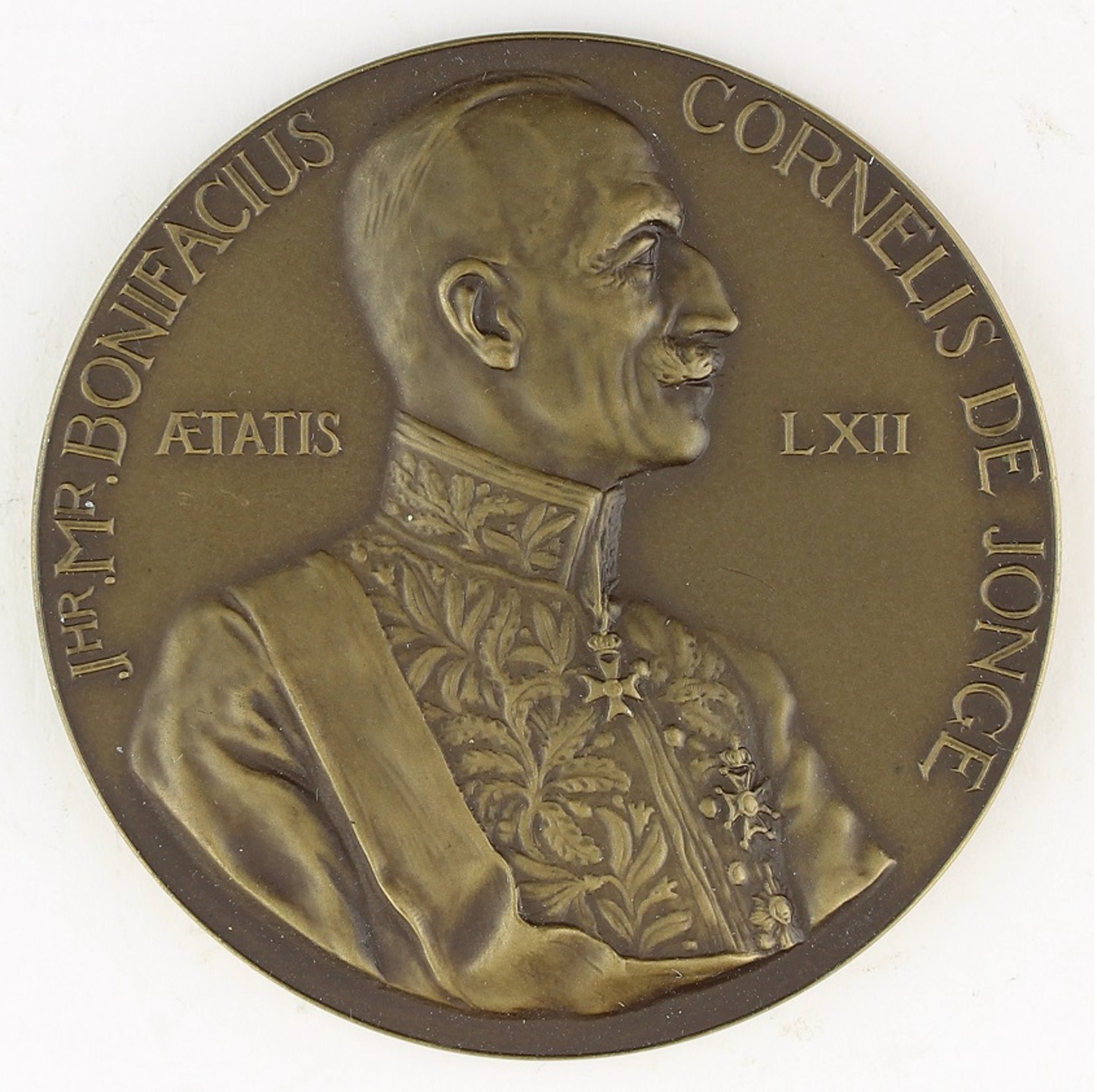 Jhr. Mr. B.C. de Jonge (1875-1958) was Gouverneur-Generaal van Nederlandsch Indië van 1931 tot 1936. De geportretteerde was 62 jaar oud toen hij model zat voor Wenckebach. Het is een typische Wenckebach: een hooggehouden kop met een elegante snor, gesteund door een brede kraag. Streng naturalisme op heel kleine schaal met een grote aandacht voor het sprekende detail, dat is goed te zien aan de versieringen op het gala-uniform. Wenckebach hield van versieringselementen en in het bijzonder van traditionele wapens. Hij herneemt zijn aanpak bij de Beelaertspenning, in 1954 door de Vereniging uitgegeven. Ouderwets misschien, maar schitterend in zijn genre. #Louk Tilanus, Handzame Sculptuur