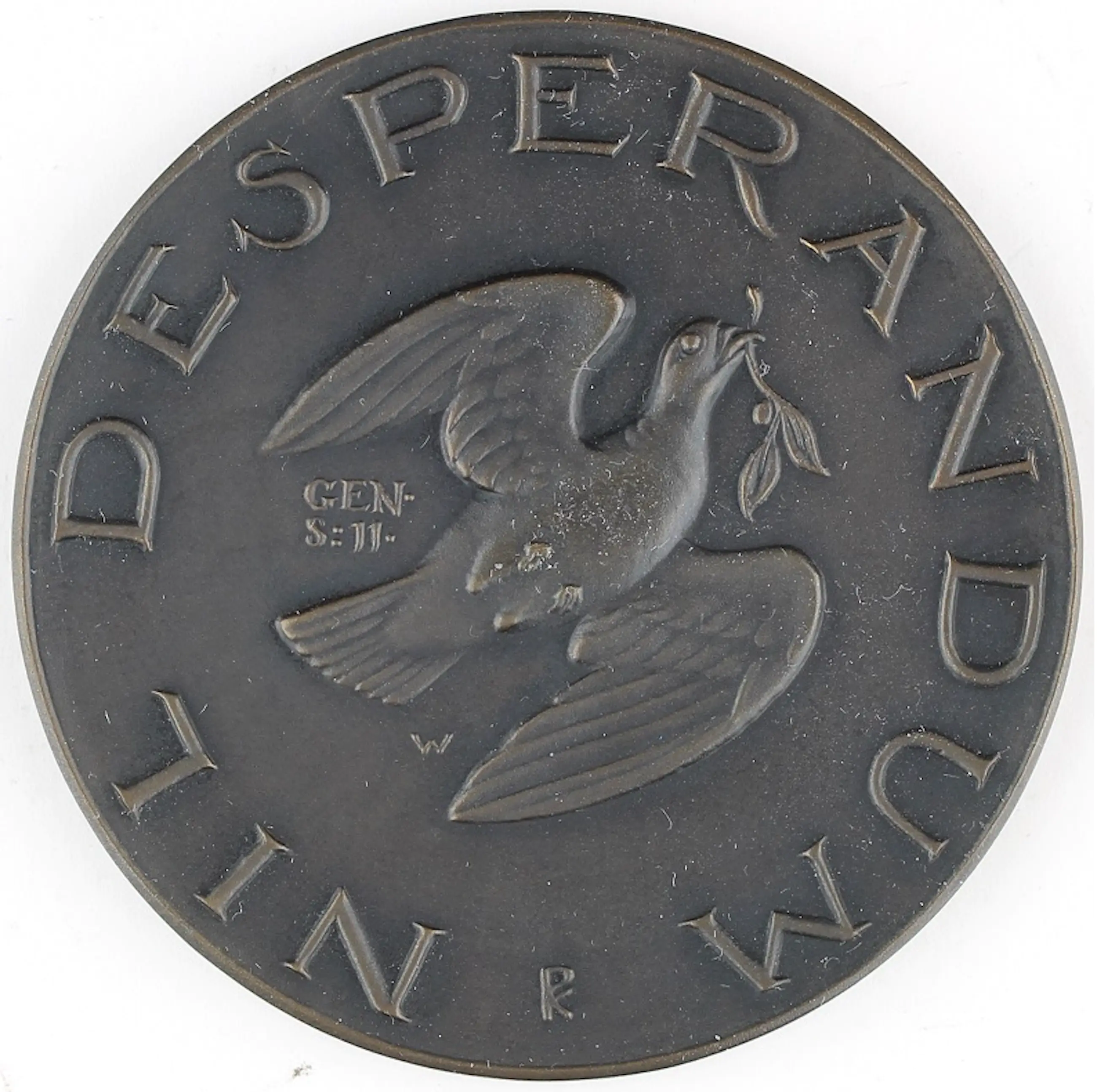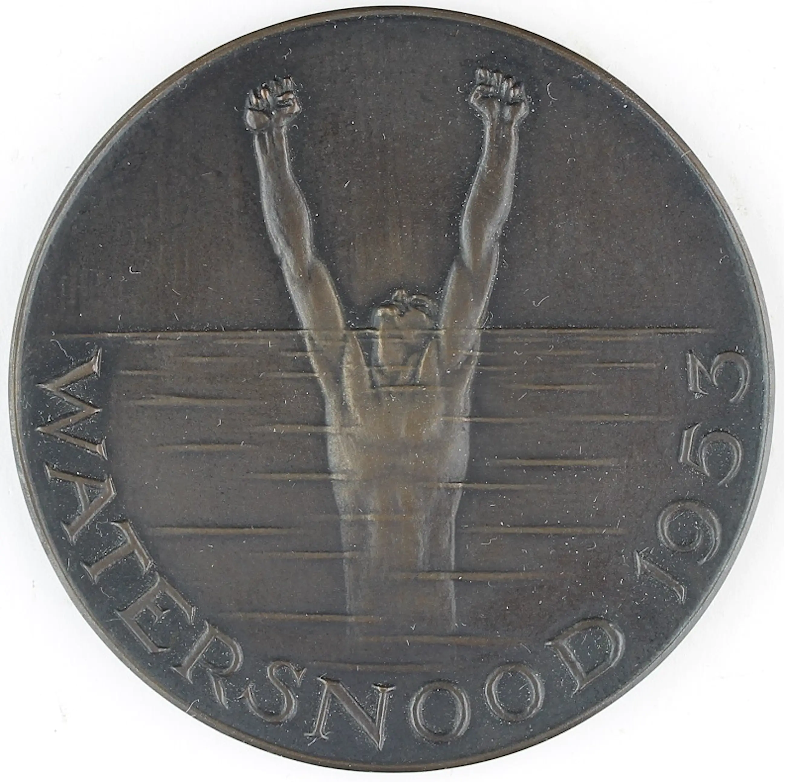 Aangrijpend in zijn stemmige ingetogenheid, zijn ingehouden kracht is Wenckebach's penning, aan de watersnood gewijd', schrijft De Geuzenpenning. 'De voorzijde beeldt de ramp zelve uit: een onmetelijk watervlak, dat onverbiddelijk stijgt, een eenzaam mens die zich nauwelijks staande houdt, de handen geheven in machteloos verzet. Het is een man in de volle kracht van zijn leven; zijn hulpeloze onmacht doet ons dan ook de onafwendbare kracht der elementen eerst recht beseffen. De kloeke letters van het sober opschrift voorkomen dat 't water wegvloeit van het penningrond. Na de spanning en drukkende benauwenis van de voorzijde brengt de keerzijde verlichting en bevrijding. Ziet, in hoogste nood is redding toch nabij. Het oud vertrouwd symbool van Noach's duif die met brede wiekslag aan komt vliegen, het hoopgevend olijftakje in zijn bek brengt dit in beeld; het omschrift drukt het kernachtig in woorden uit. Zo geven voor- en keerzijde tezamen in hun contrast en hun verbondenheid, treffend de gevoelens weer, die de ramp bij ons allen heeft gewekt'. De Vereniging heeft deze penning uitgegeven om financiële hulp te kunnen bieden aan de slachtoffers van de watersnood. #Louk Tilanus, Handzame Sculptuur
