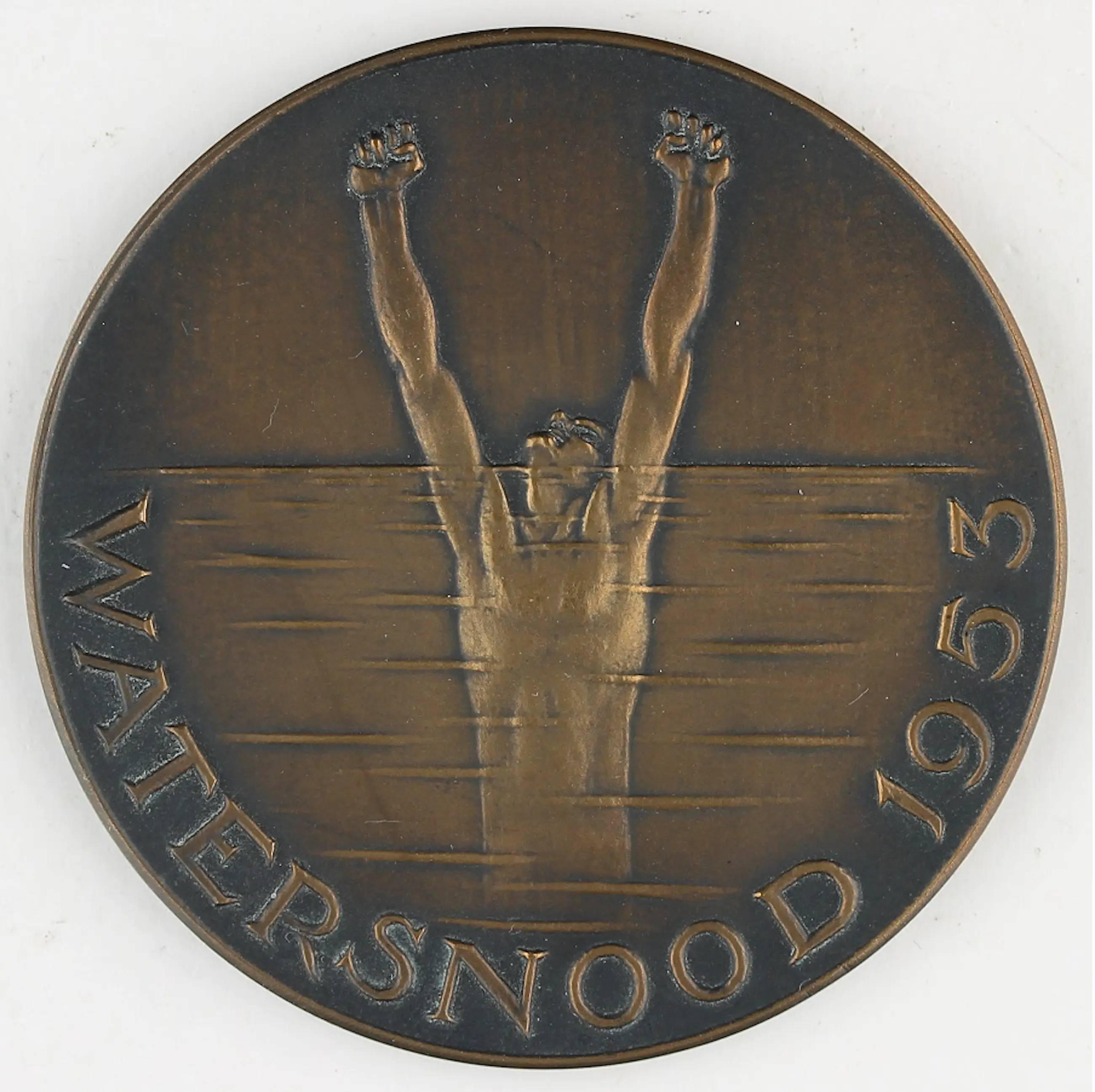 Aangrijpend in zijn stemmige ingetogenheid, zijn ingehouden kracht is Wenckebach's penning, aan de watersnood gewijd', schrijft De Geuzenpenning. 'De voorzijde beeldt de ramp zelve uit: een onmetelijk watervlak, dat onverbiddelijk stijgt, een eenzaam mens die zich nauwelijks staande houdt, de handen geheven in machteloos verzet. Het is een man in de volle kracht van zijn leven; zijn hulpeloze onmacht doet ons dan ook de onafwendbare kracht der elementen eerst recht beseffen. De kloeke letters van het sober opschrift voorkomen dat 't water wegvloeit van het penningrond. Na de spanning en drukkende benauwenis van de voorzijde brengt de keerzijde verlichting en bevrijding. Ziet, in hoogste nood is redding toch nabij. Het oud vertrouwd symbool van Noach's duif die met brede wiekslag aan komt vliegen, het hoopgevend olijftakje in zijn bek brengt dit in beeld; het omschrift drukt het kernachtig in woorden uit. Zo geven voor- en keerzijde tezamen in hun contrast en hun verbondenheid, treffend de gevoelens weer, die de ramp bij ons allen heeft gewekt'. De Vereniging heeft deze penning uitgegeven om financiële hulp te kunnen bieden aan de slachtoffers van de watersnood. #Louk Tilanus, Handzame Sculptuur
