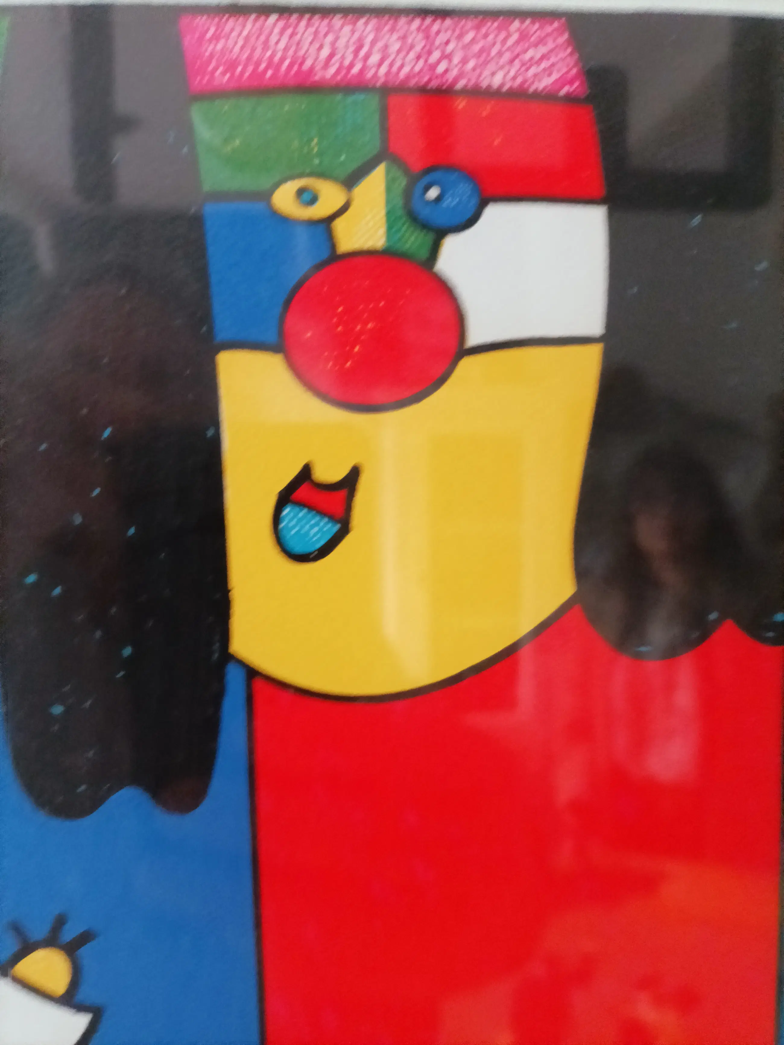 Het werk toont een kleurrijke clown opgebouwd uit geometrische vormen en felle kleurvlakken — typerend voor Alt’s speelse en optimistische beeldtaal waarin mens en dier vaak opgaan in abstracte composities.
