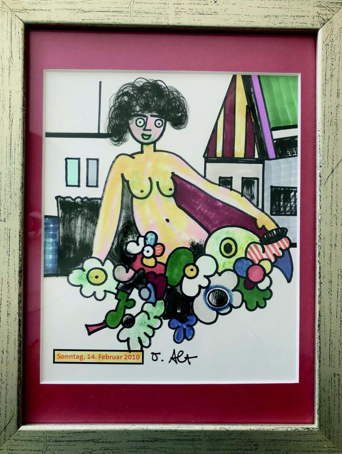 Farbige Orginalzeichnung (Filzschreiber) ca. 16 X 19 cm, gerahmt, datiert: 14. Februar 2010 und signiert.
