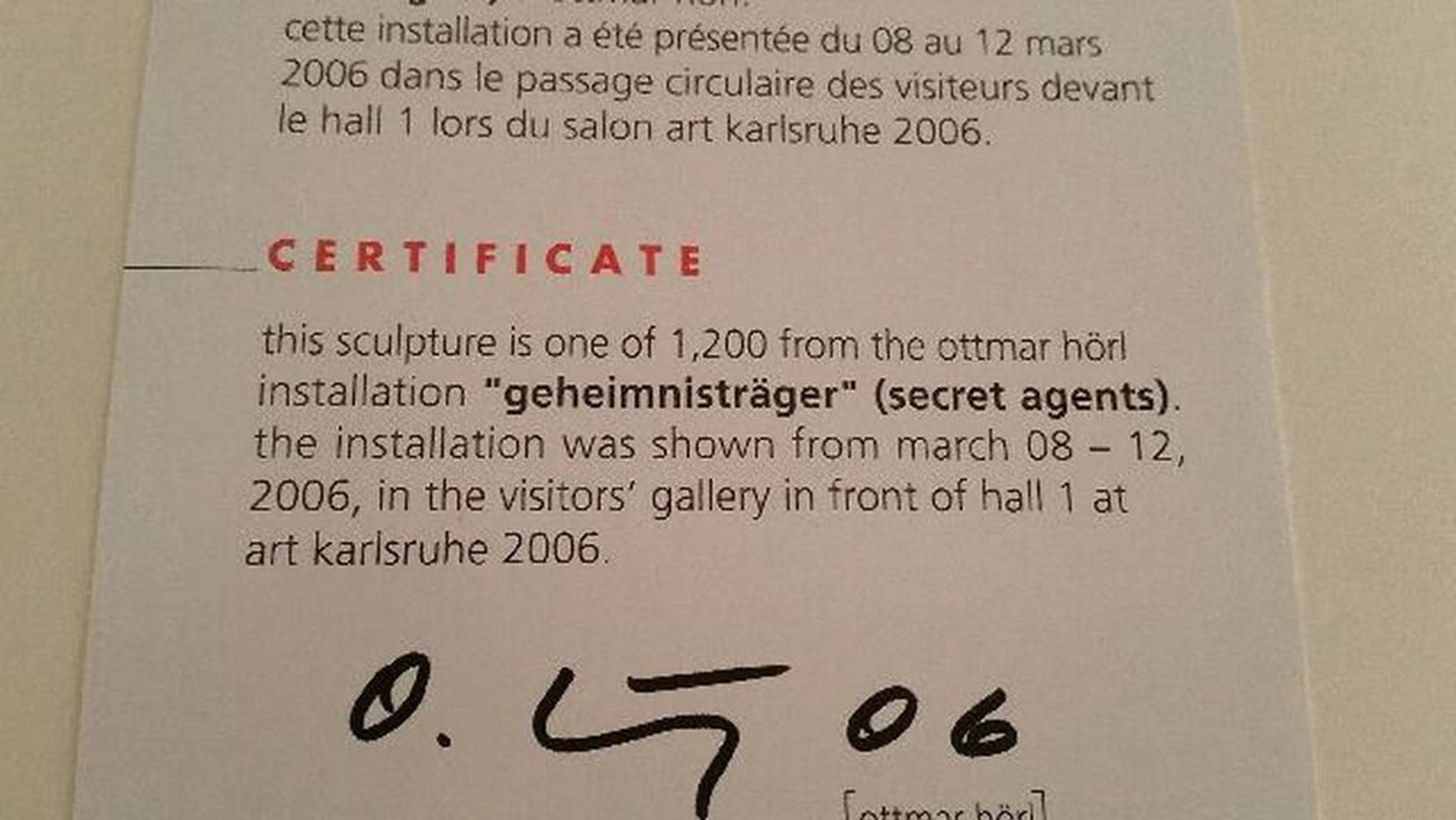 Afmeting is ongeveer 39 x 15cm. Er zit een certificaat bij, object zelf heeft geen signatuur. De foto's vormen onderdeel van de conditiebeschrijving.