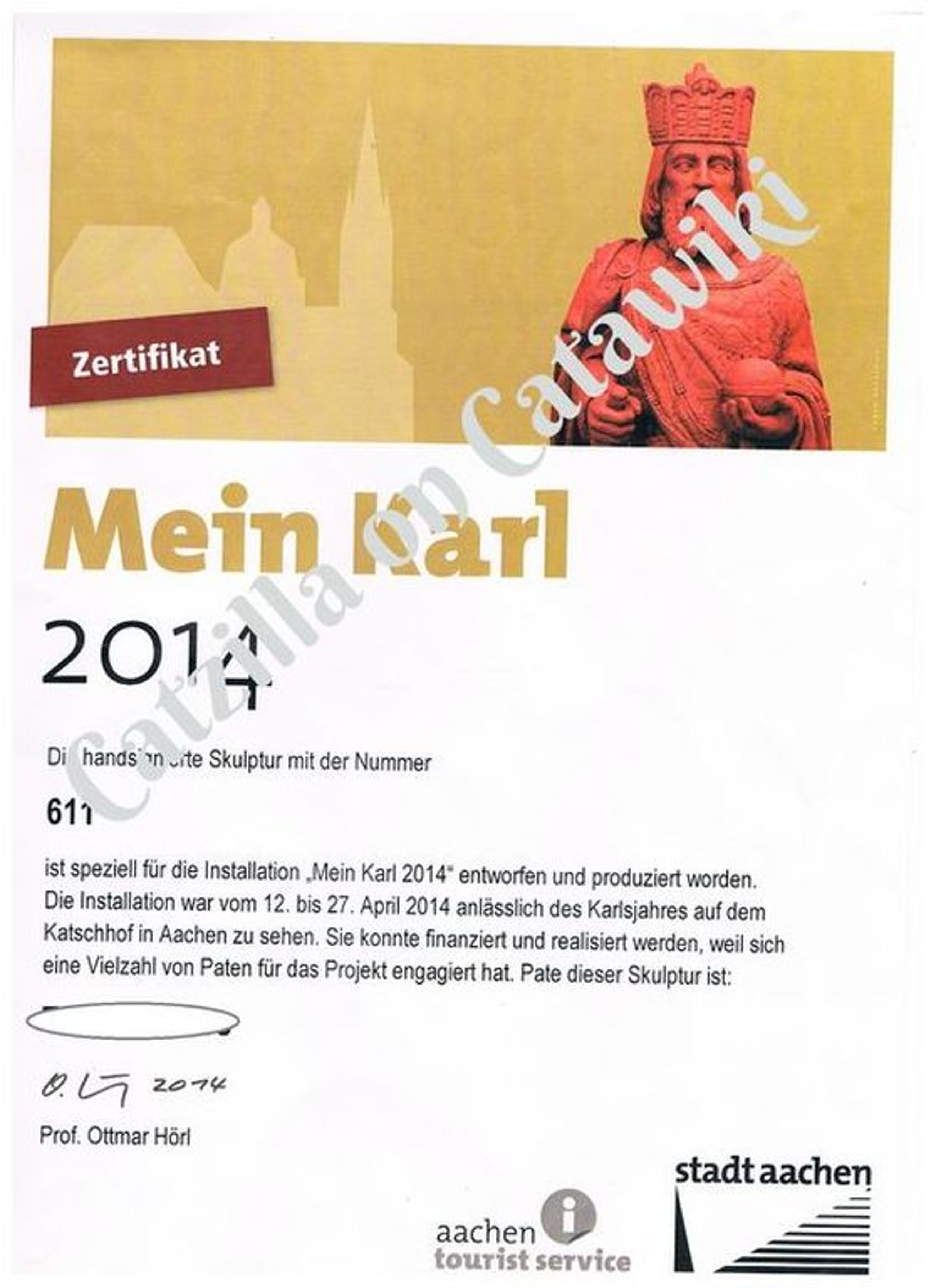 Dit is de zeldzame en gelimiteerde editie (jaar 2014) van het Karel de Grote-standbeeld van de Duitse kunstenaar/professor Ottmar Hörl. Deze beelden werden enkel verkocht in Aken (Duitsland, geboorteplaats van Karel de Grote) in 2014.