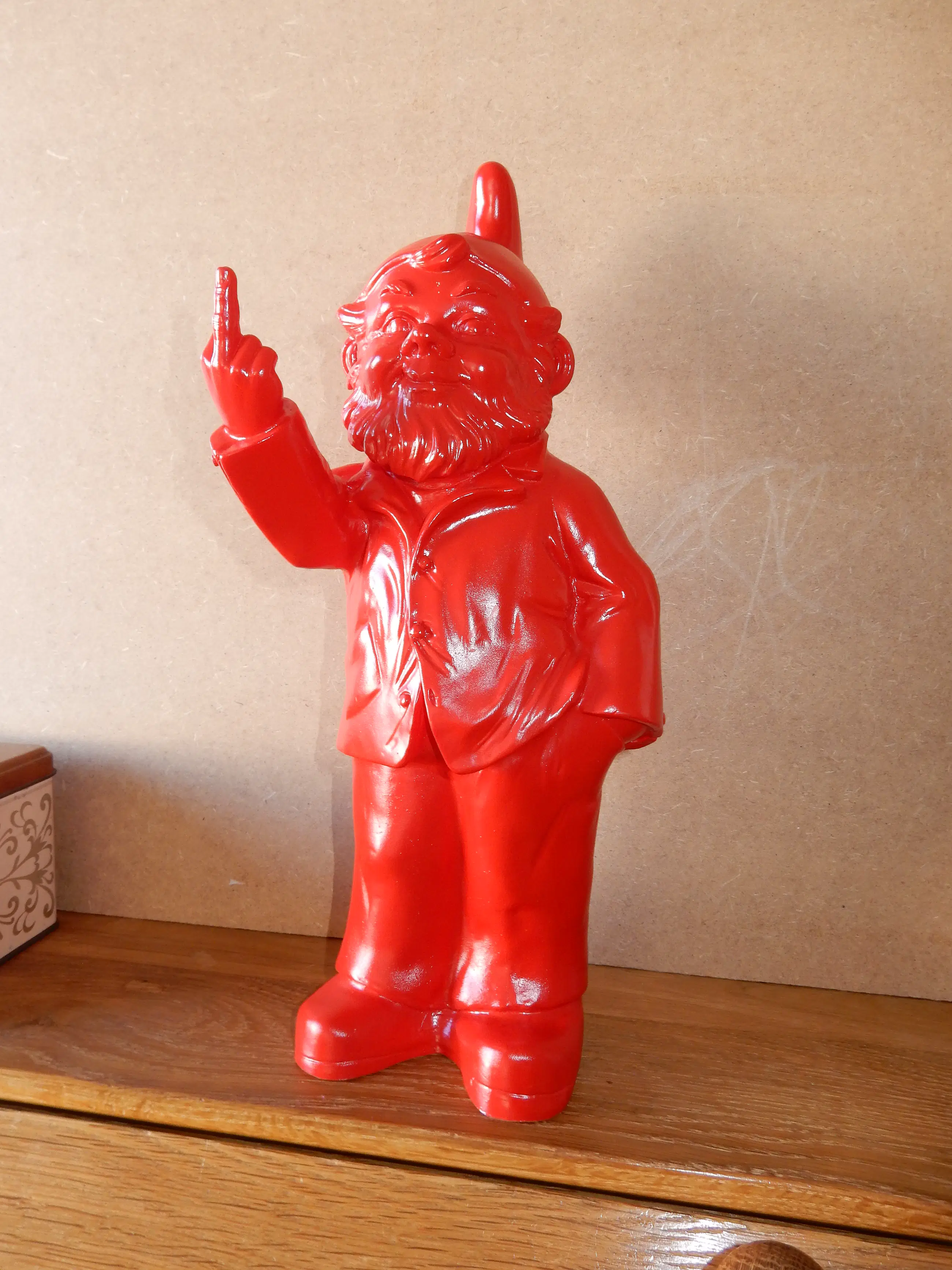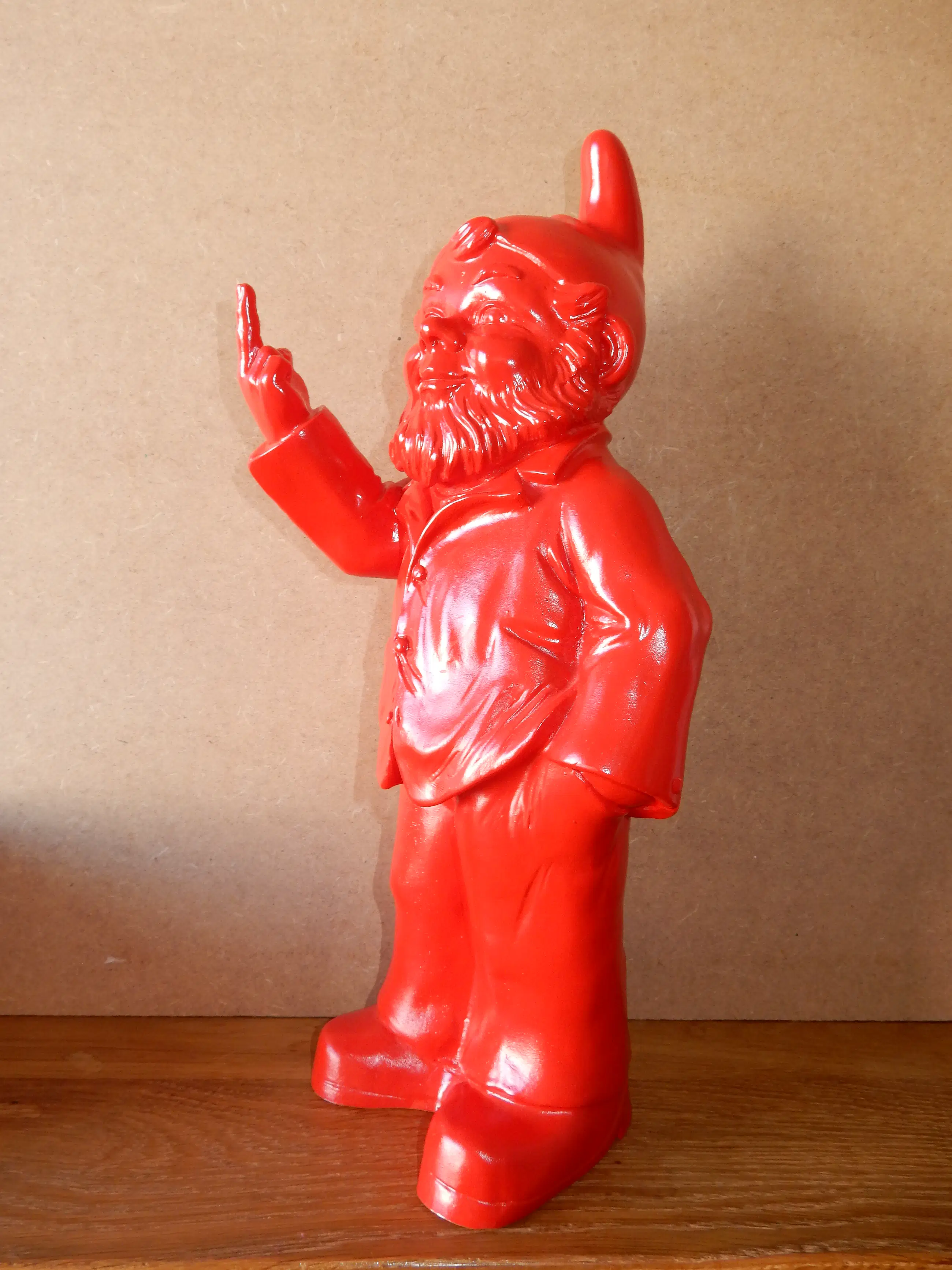 Deze rode kabouter met opgestoken middenvinger verscheen in 1994 voor het eerst in het project "Rolling change" in Seligenstadt (D) waar 1000 blauwe exemplaren in groepjes of los door de hele stad heen volgens een bepaald patroon werden opgesteld. Ze bleven er staan tot iemand ze meenam. Omdat het een publieke manifestatie was, waren ze feitelijk al door het publiek betaald en als iemand er één meenam dan was dat slechts een verandering van locatie en geen diefstal.