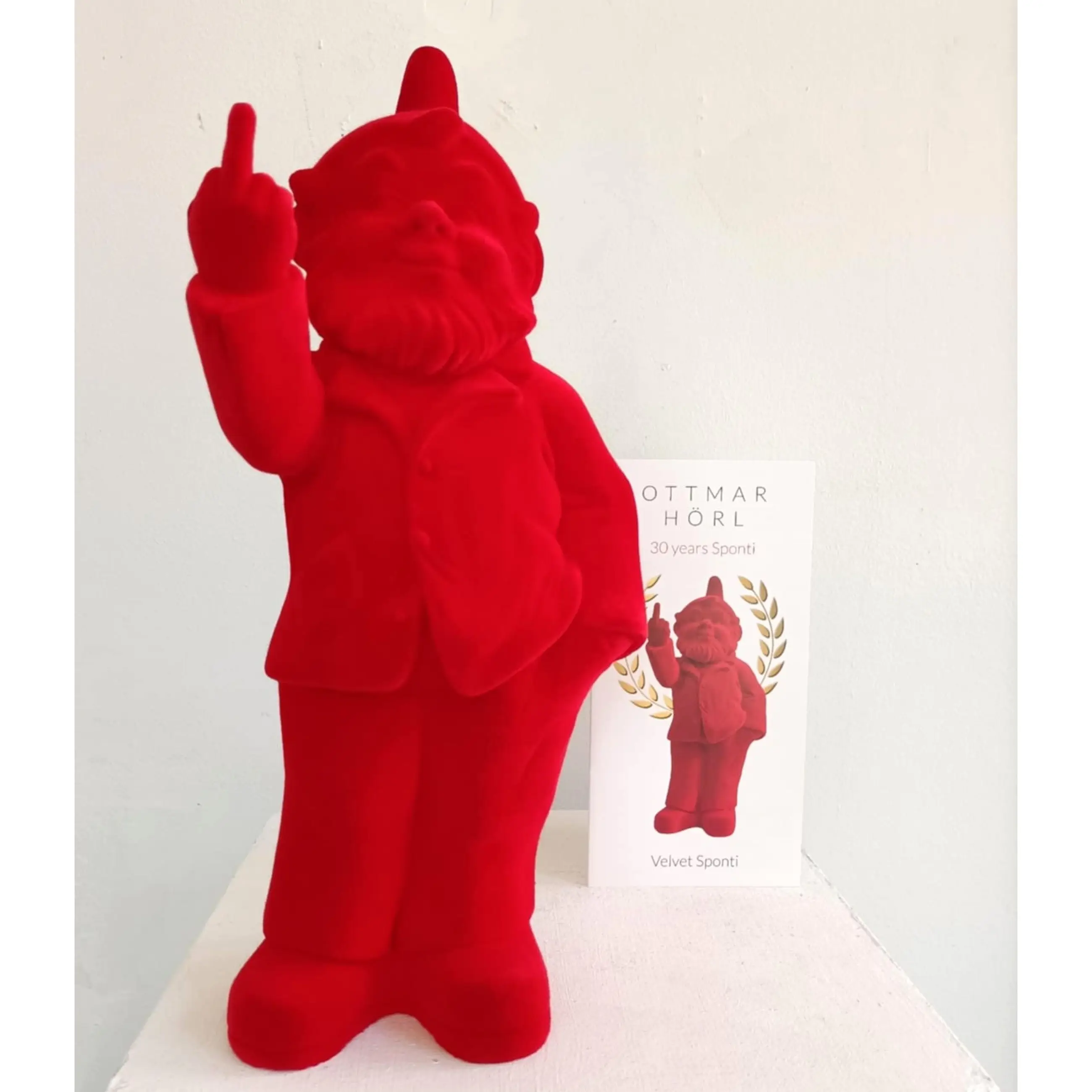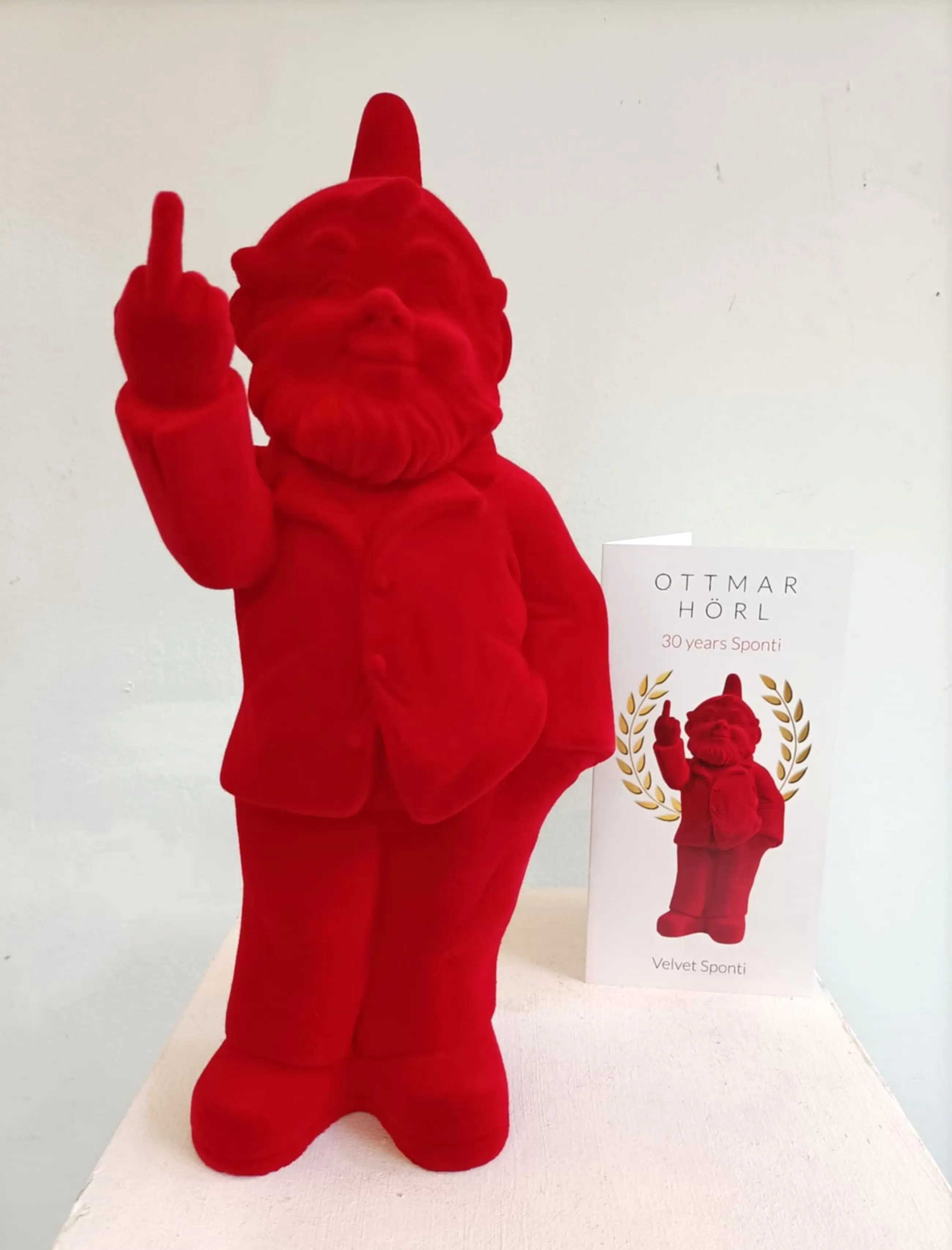 Sponti, beter bekend als de F..K YOU-kabouter, zag 30 jaar geleden het levenslicht. De Sponti´s in vele kleuren veroverden de wereld en werden het meest iconische werk van Horl. Om de 30ste verjaardag te vieren heeft hij Sponti voorzien met een fluweelachtig laagje. En natuurlijk in het rood. De Sponti komt samen met de brochure.