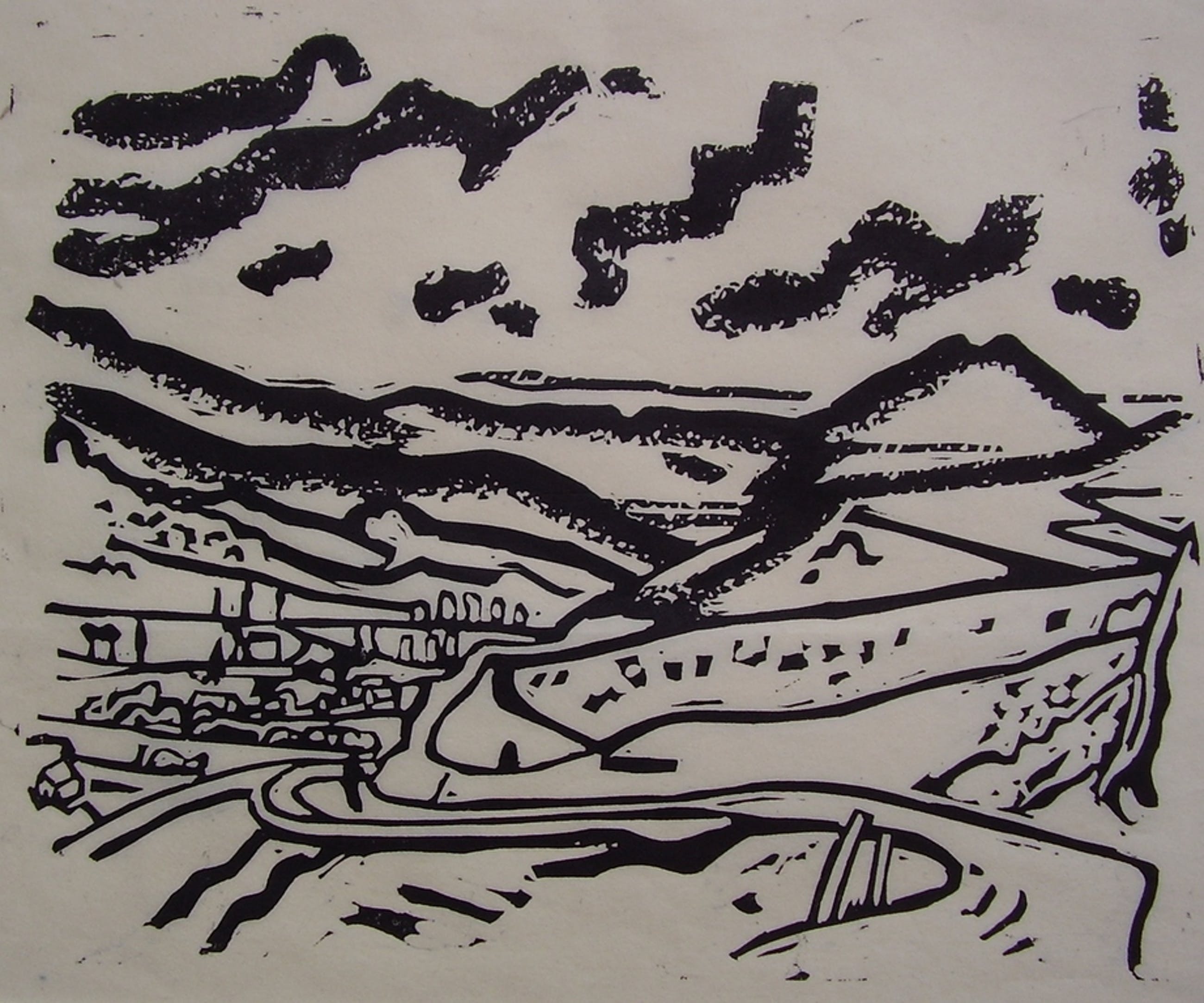 Otto B. de Kat (1907-1995) zeldzame linosnede proefdruk uit de serie "Monts Du Cantal" uit 1970.