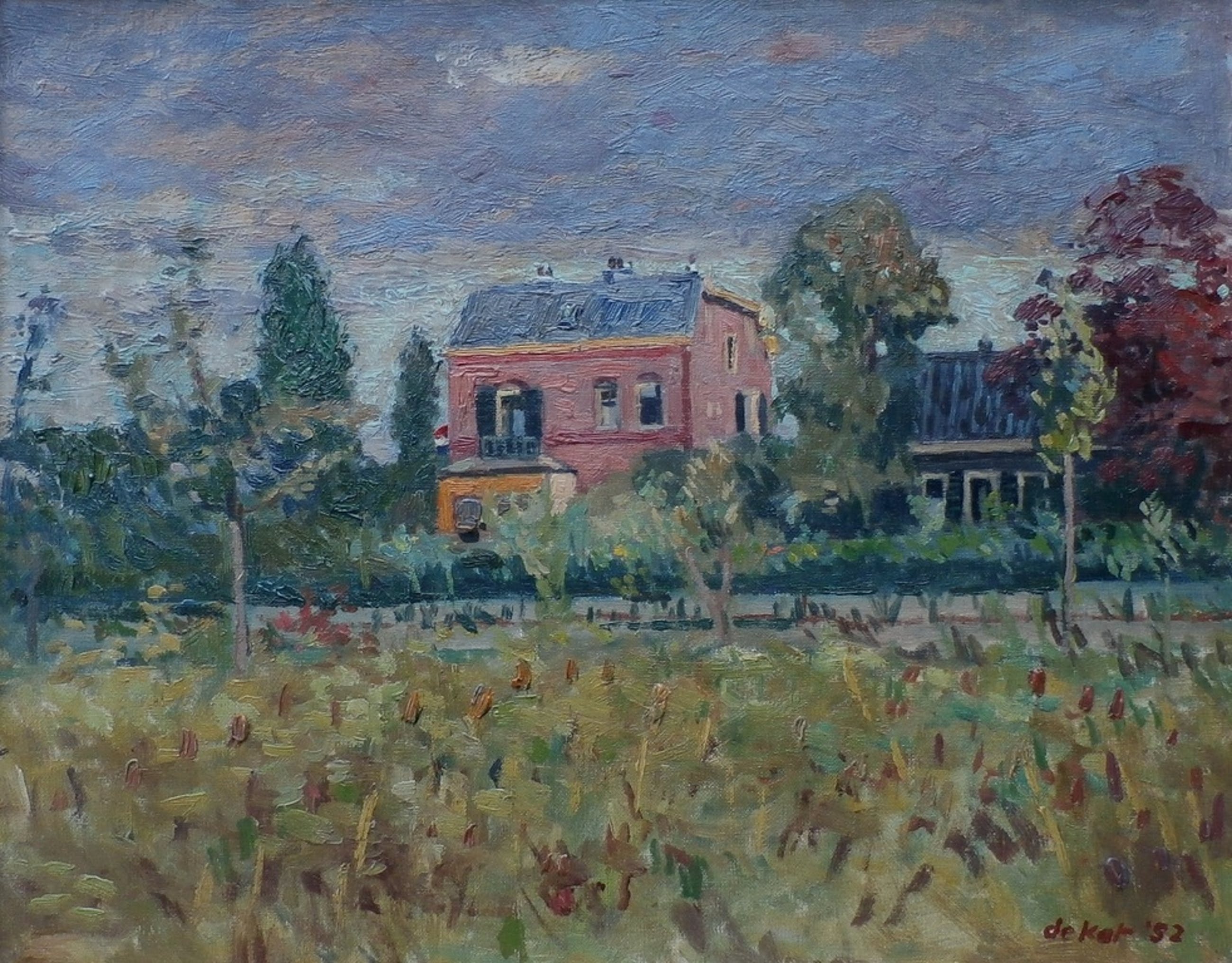 Olieverf op doek van Otto B de Kat. Jaar: 1952. Titel: het rode huis. Afmetingen werk incl lijst: H55 x b65 cm. Afmetingen werk: H49 x b38. Het werk is rechtsonder gesigneerd. De authenticiteit van het aangeboden werk wordt voor 100% gegarandeerd. Een certificaat van echtheid kan, op aanvraag, worden meegestuurd. Conditie: in goede staat. Het werk kan zo aan de muur.
