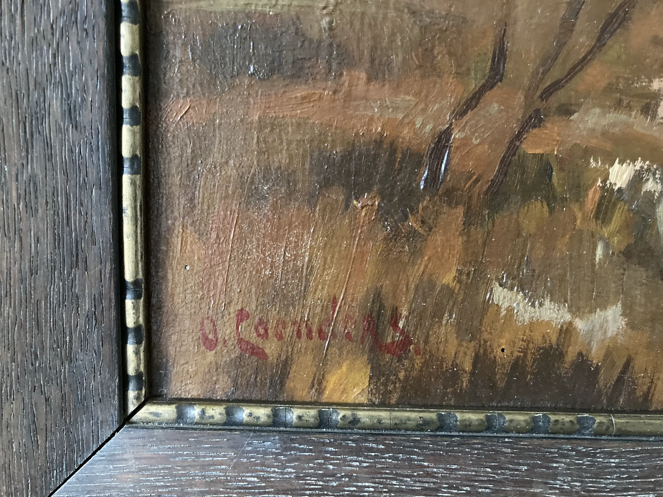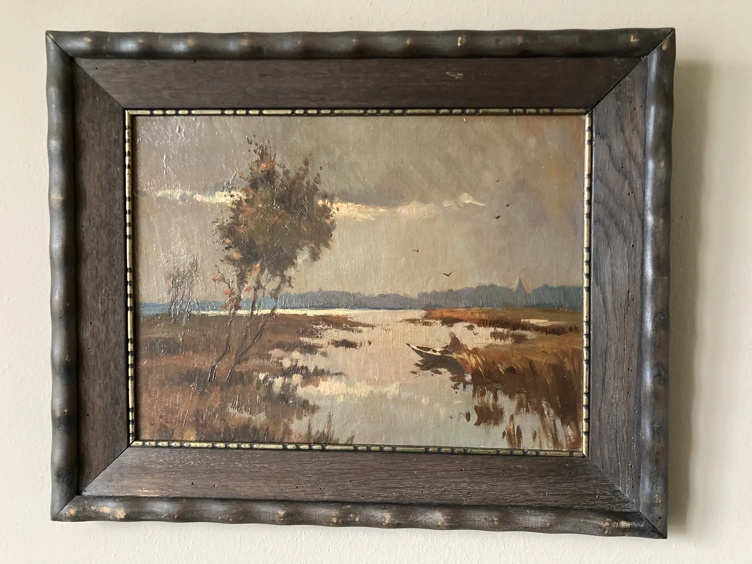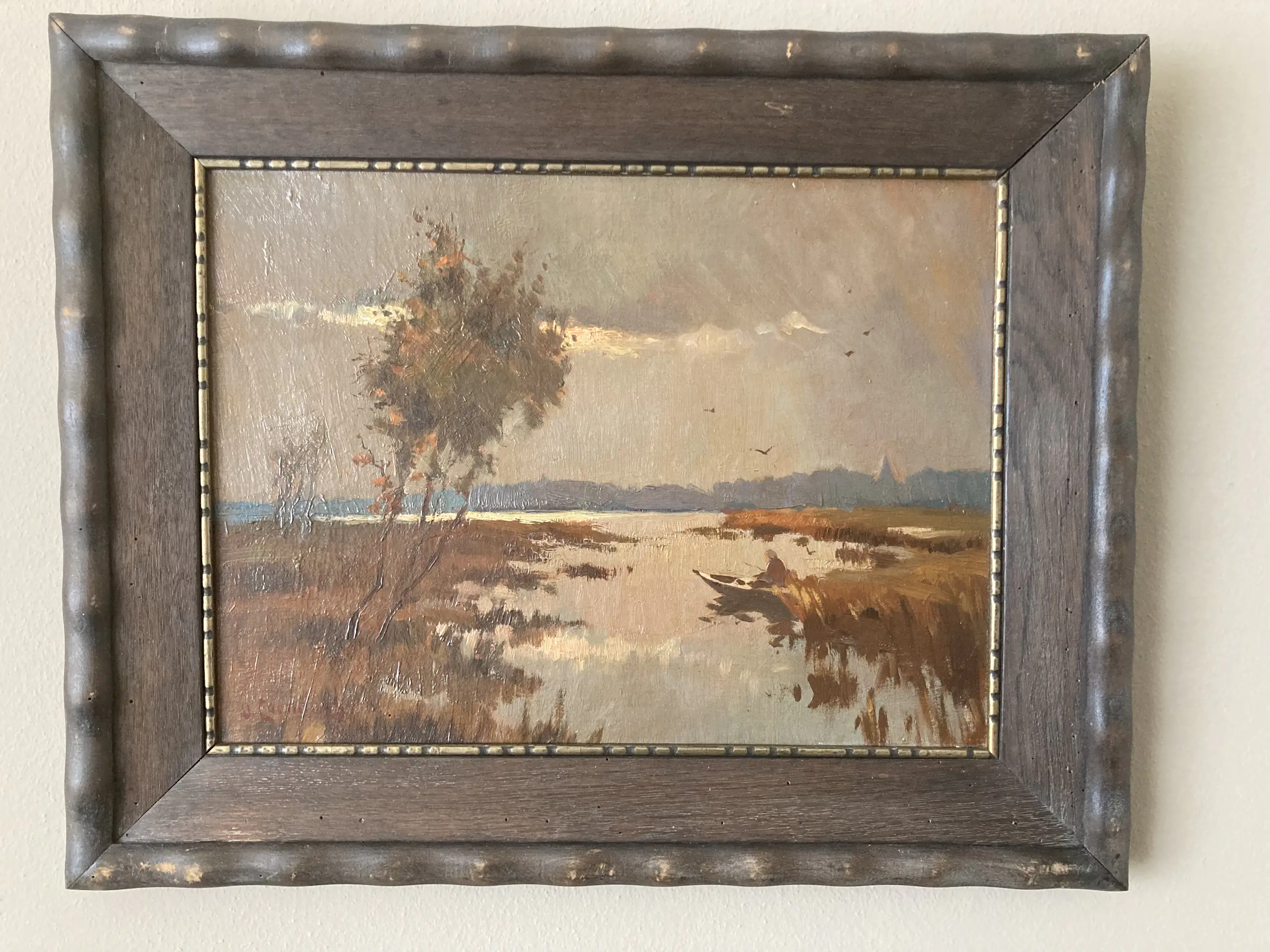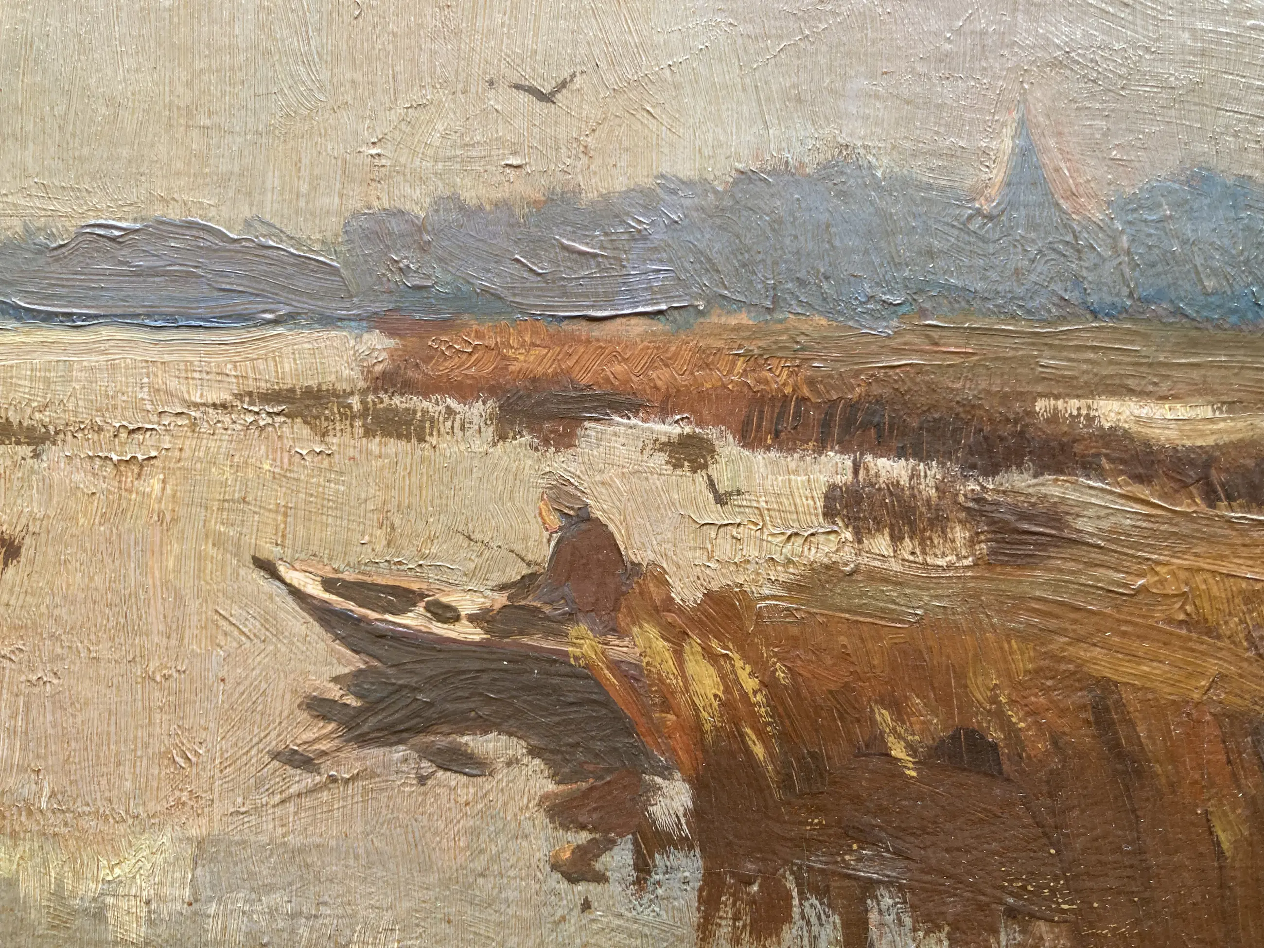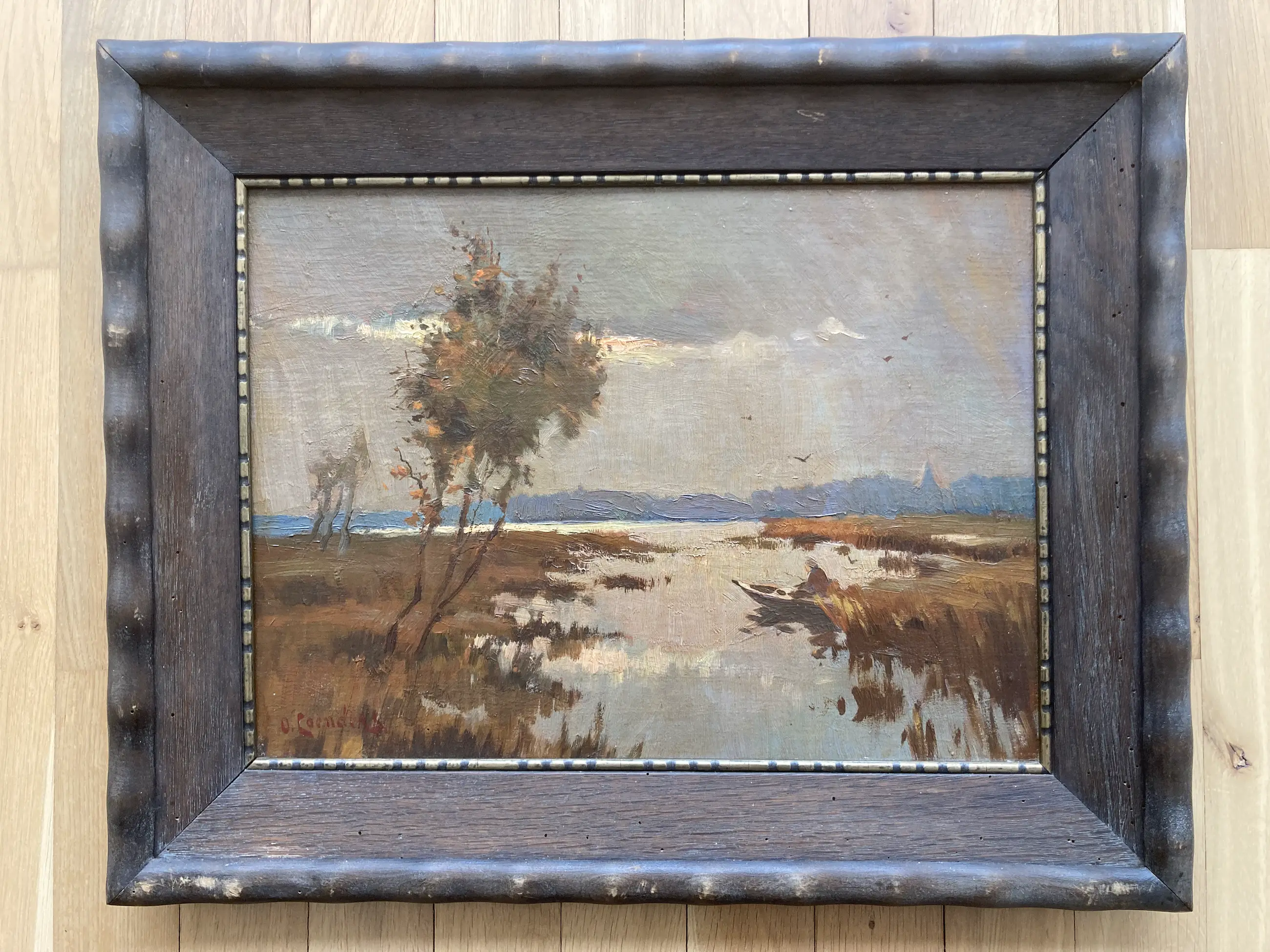 Mooi schilderij van Otto Coenders van een open landschaps-vergezicht met man in bootje op een meertje, met in de verte een dorp. Linksonder hand-gesigneerd, O. Coenders. Olieverf op bord met originele lijst.